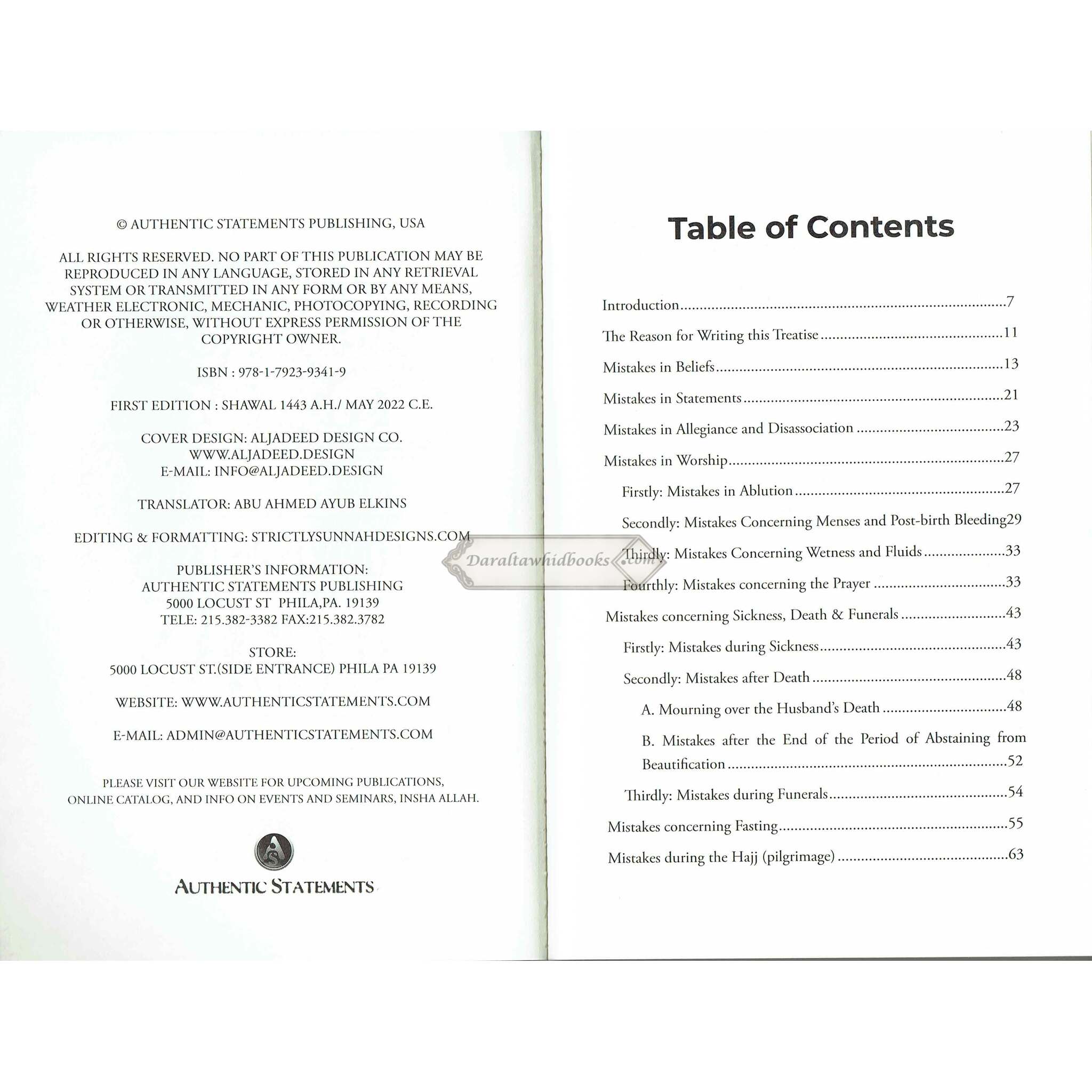The author of "Common Mistakes of the Woman" is Shaykh Dr. Abdullah Al-Tayyar. Specifically within the context of Islamic teachings and values, the book strives to address and throw light on typical mistakes that women may inadvertently make in various facets of their lives. He has devoted his time to learning about and instructing about different facets of Islam, especially topics specifically related to women. To address the issues faced by women in modern society, his work in "Common Mistakes of the Woman" probably draws on Islamic teachings, scholarly research, and real-world experiences.The mistakes outlined are both numerous and varied. From them are: mistakes in beliefs, in clothing, in changing the appearance of the body, in the way they walk, concerning food and drink, mistakes related to the way in which they sleep and awake, free-mixing, holidays and events, listening (i.e. to music and the likes of it), mistakes concerning traveling, and the condition in which one goes to the doctor.