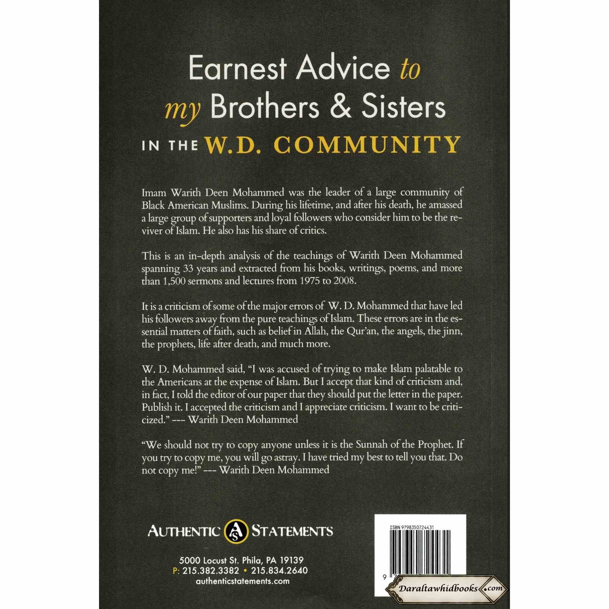 Rasheed Barbee uses this title Earnest Advice to My Brothers and Sisters in the W. D Community" to directly appeal to his audience, their souls, and emotions. Barbee also admonishes his brothers and sisters to always remain Muslims thus needing to practice various principles in this righteous life; gain knowledge, be patient, and remain close to Allah. He tries to be a counselor to the W. D. community and he also looks at the problems confronting women in the W. D community or even anywhere advising them to seek the word of God for countering what they face. Being a phenomenal example of a wise and compassionate man, Barbee gives his readers motivation to develop unity, strength, and incomparable purpose that leads them on the right way.