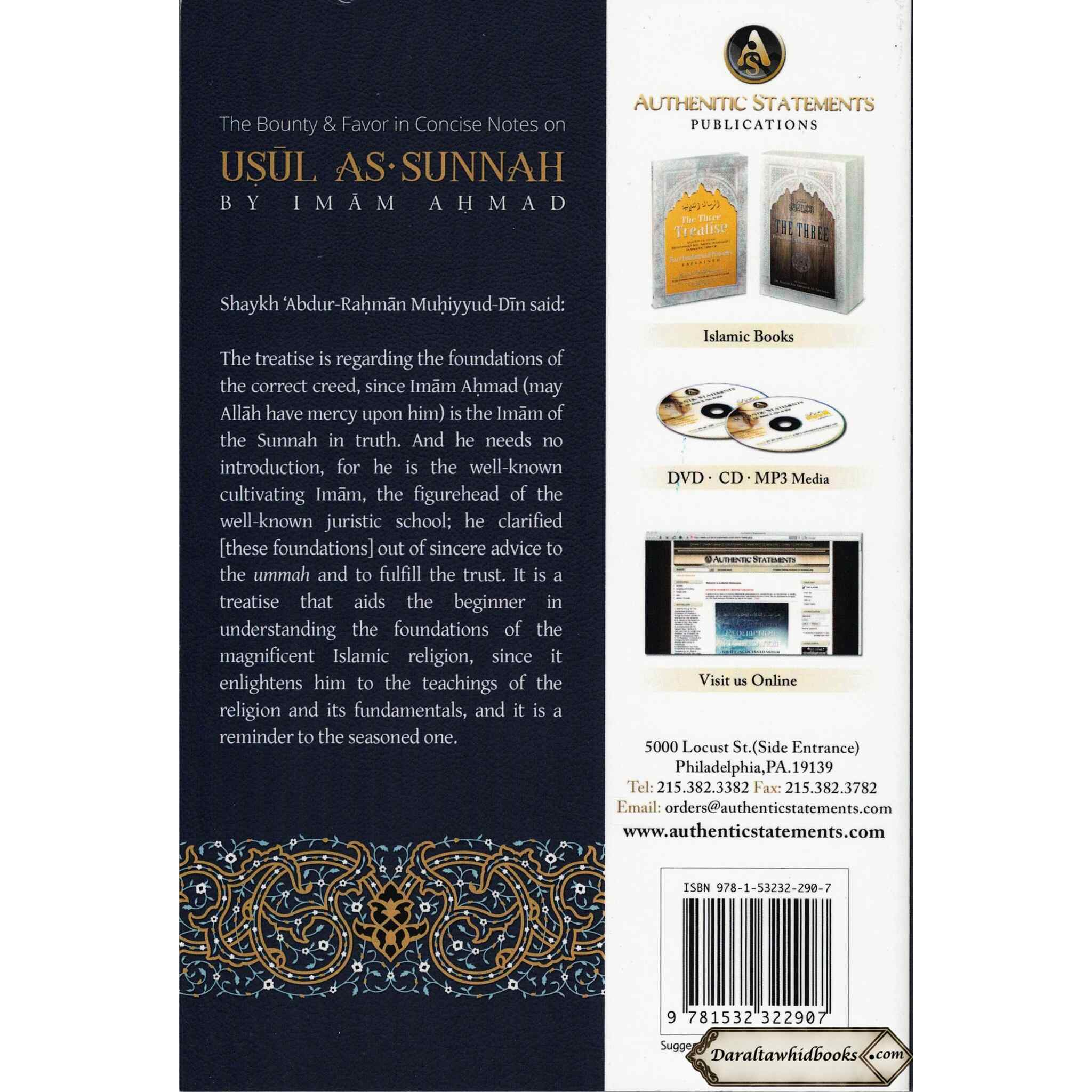"The Bounty & Favor in Concise Notes on Usul As-Sunnah" is a remarkable book written by the famous scholar, Imam Ahmad ibn Hanbal (d. 241 AH), that delves into the fundamental foundations of Islam. Imam Ahmad emphasizes the importance of sticking to the Sunnah of the Prophet Muhammad (peace be upon him) in this work and warns against the pitfalls of religious innovation (bid). The book is broken into two sections. The first section emphasizes the significance of adhering to the Sunnah and the dangers of introducing new ideas into the faith. The second section delves into several sorts of innovations and provides advice on how to avoid them. The writing style of Imam Ahmad is straightforward and succinct, making the treatise an accessible resource for anybody seeking a deeper grasp of the basics of Islam. It is extremely useful for Islamic law academics and students.