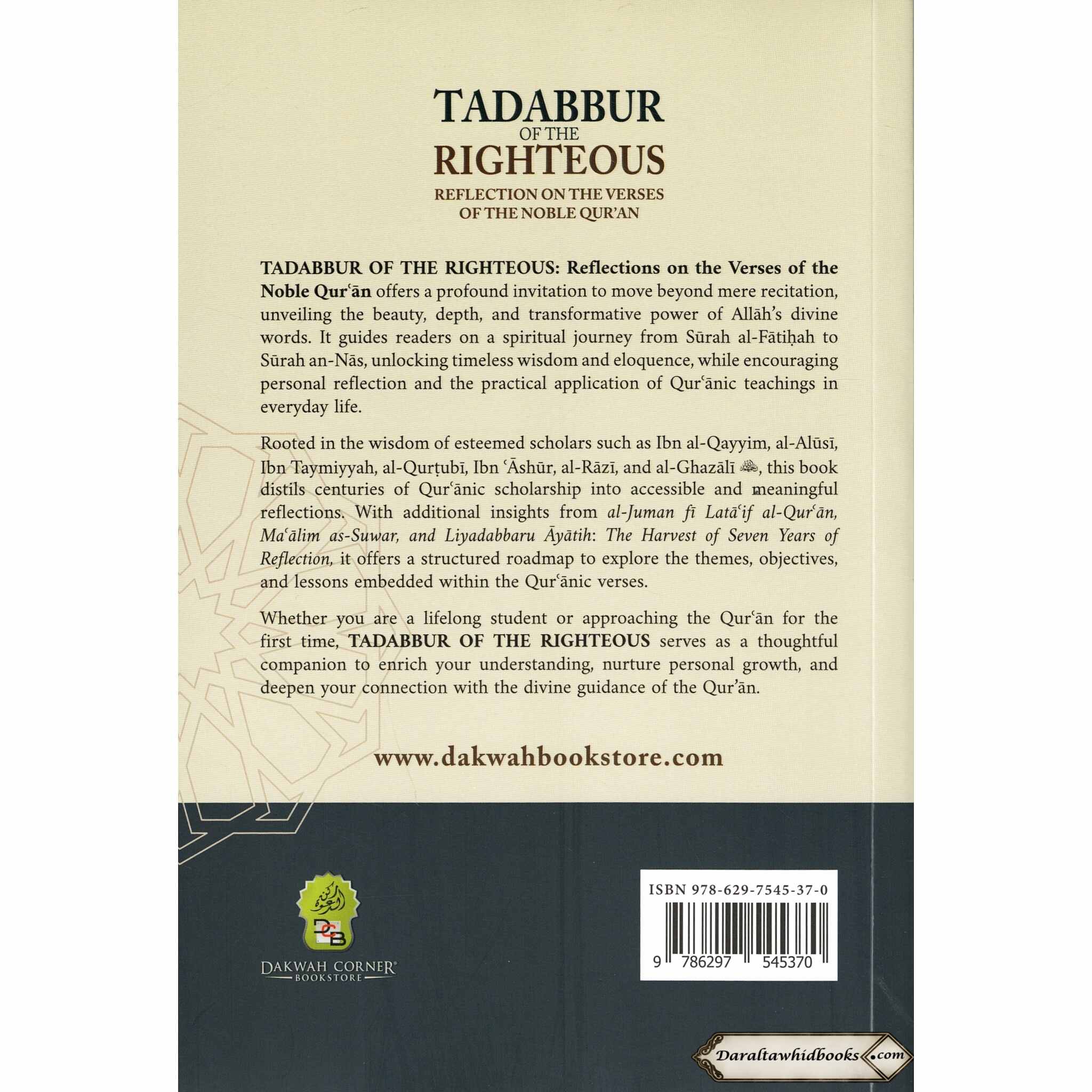 "Tadabbur of the Righteous" Noble Qur'an offers a profound invitation to move beyond mere recitation, unveiling the beauty, depth, and transformative power of Allah's divine words. Tadabbur of the Righteous guides readers on a spiritual journey from Serah al-Fatihah to Sarah an-Nas, unlocking timeless wisdom and eloquence, while encouraging personal reflection and the practical application of Qur'anic teachings in everyday life. Rooted in the wisdom of esteemed scholars such as Ibn al-Qayyim, al-Alust Ibn Taymiyyah, al-Qurtubi, Ibn 'Ashur, al-Razi, and al-Ghazali, this book distils centuries of Qur'anic scholarship into accessible and meaningful reflections. With additional insights from al-Juman ft Latif al-Qur'an Ma'alim as-Suwar, and Liyadabbaru Aparih: The Harvest of Seven Years of Reflection, it offers a structured roadmap to explore the themes, objectives. and lessons embedded within the Qur'anic verses.