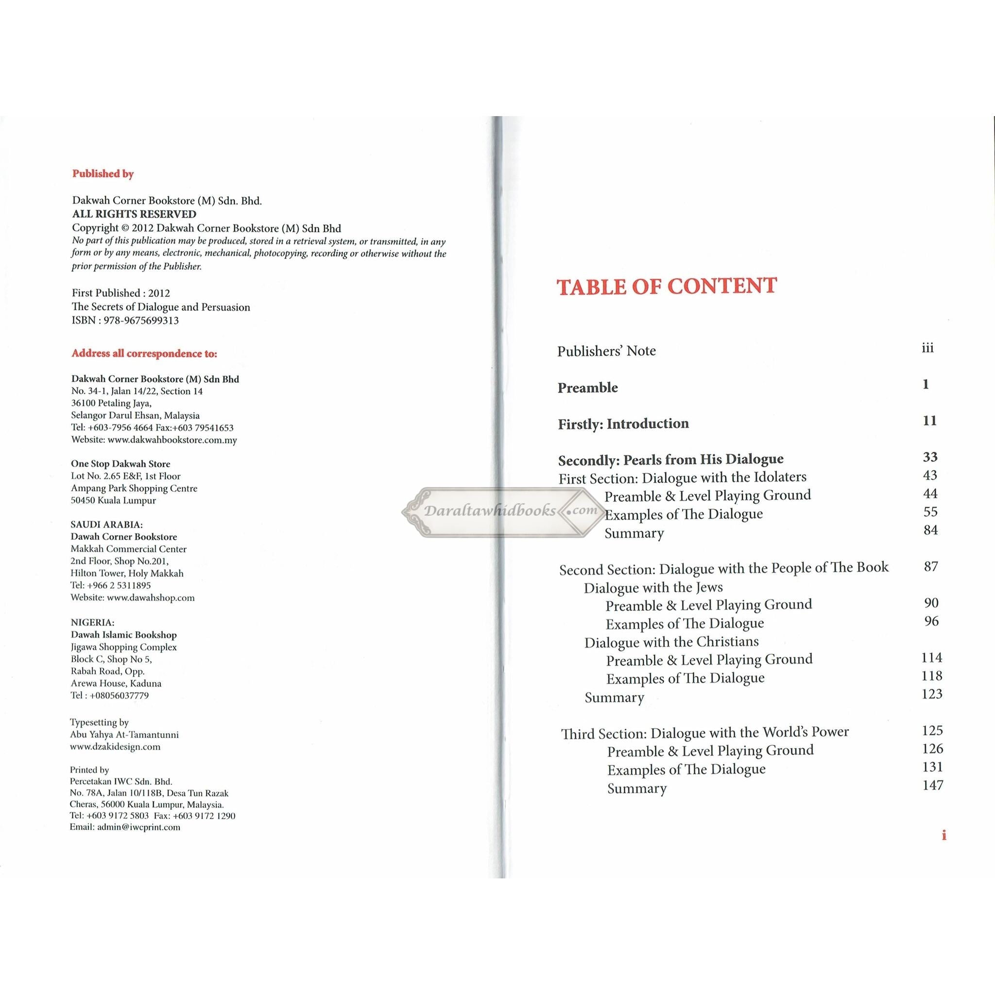 Secrets of Dialogue and Persuasion' examines the discussions conducted by our beloved Prophet Muhammad (SAWW) as he invited people to follow Allah SWT's way. The study delves at issues such as how he effectively communicated his message to important figures of his time and within the community in which he lived. It also goes into detail on the replies he received and the techniques he used. The research gives light on his approaches to working with teenagers and adolescents, as well as his interactions with his own family, which includes women and children. Finally, it aims to identify the important factors in his discussions that resulted in the most beneficial outcomes."