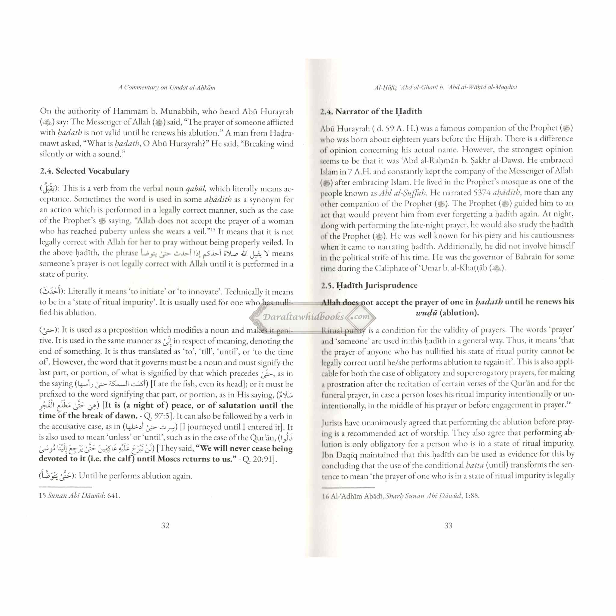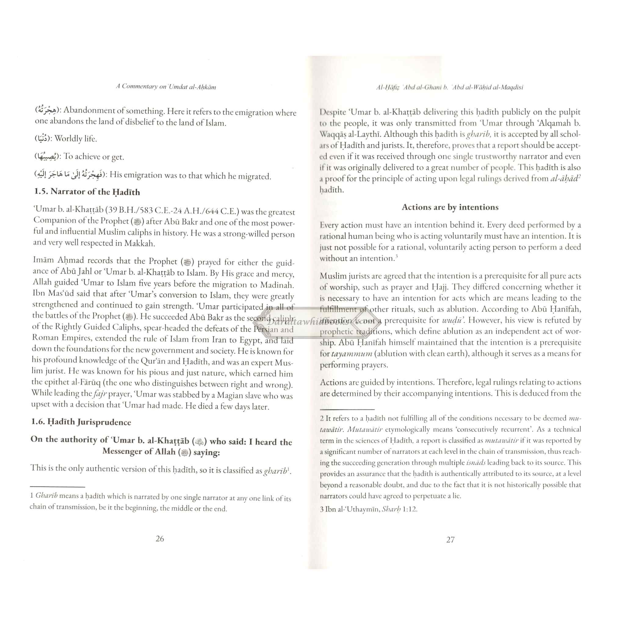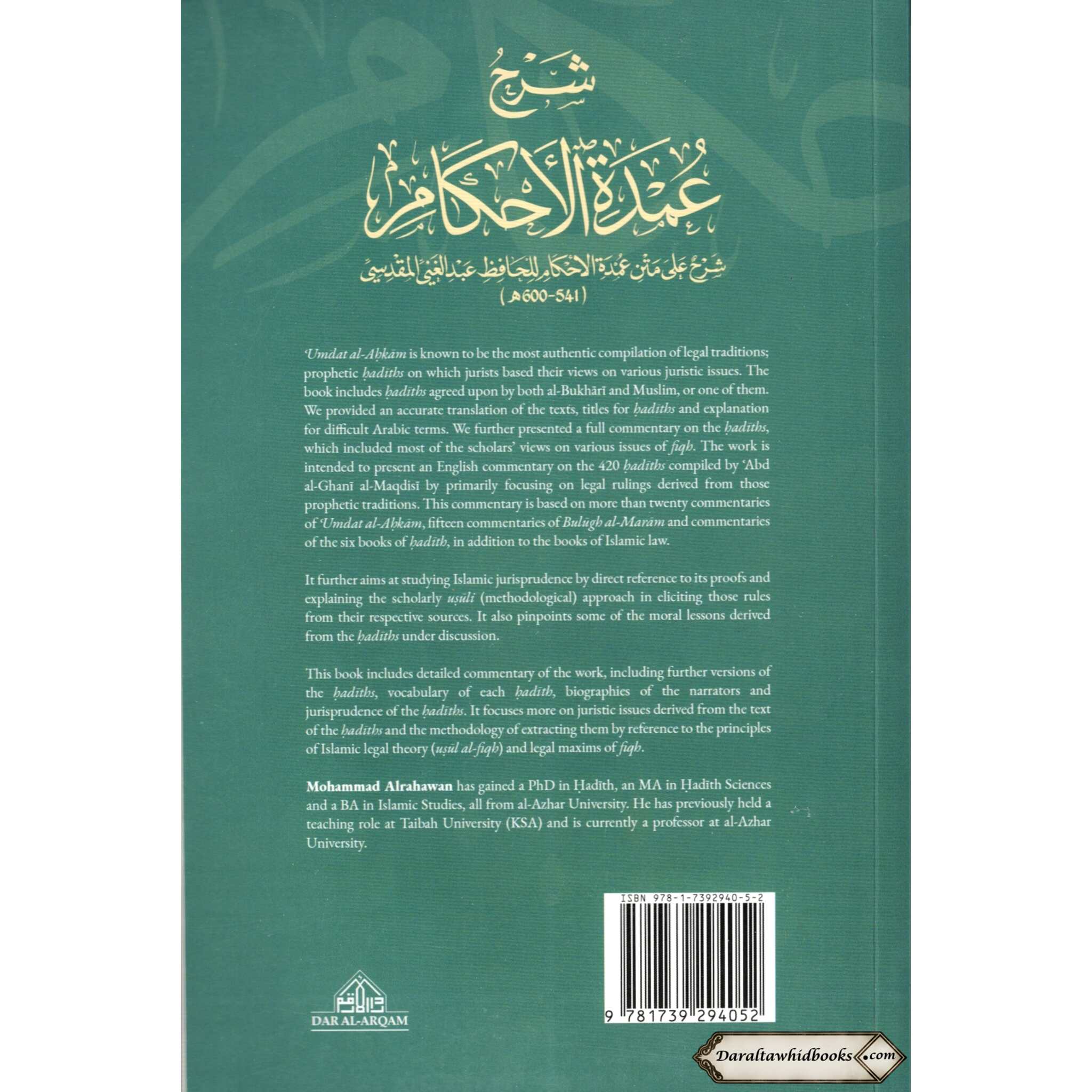 This work is to provide an English translation and analysis of the 420 Hadiths contained in the book of Abu al-Ghunaim al-Maqdisi and the primary contention of this work will be the legal implications of these Hadiths. This commentary is made based on more than twenty commentaries of 'Umdat al-Ahkam, fifteen commentaries of Bulugh al-Maram, and commentaries on the six major Hadith collections, along with treatises on Islamic law.