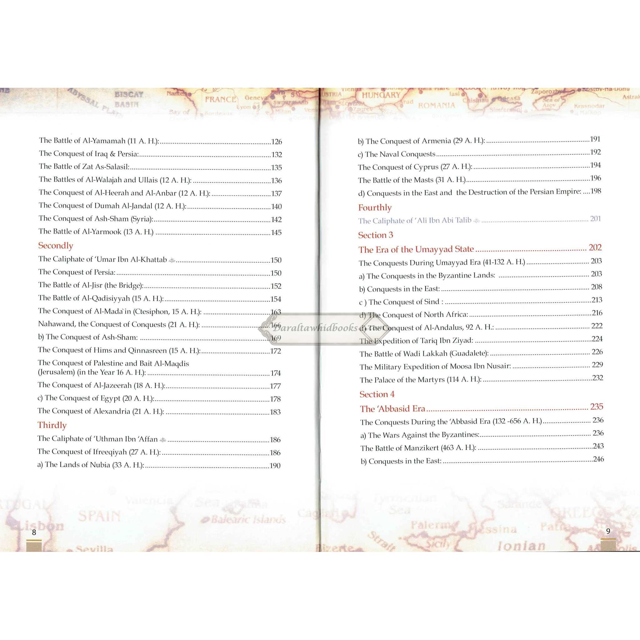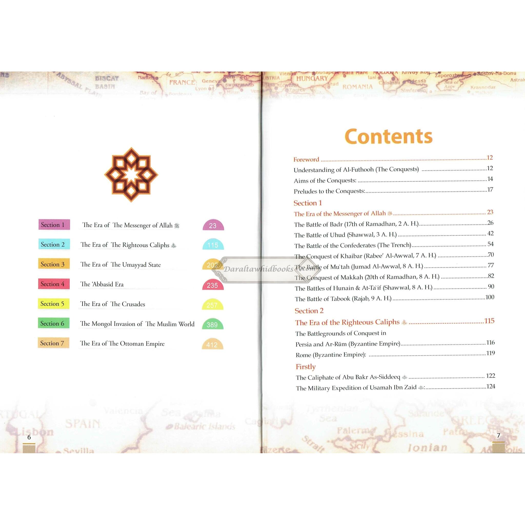 The literal meaning of al-fath is the antonym of closure (i.e., opening), but what is meant by it here is the conquest of lands at war with the Muslims and the entry into the lands of the enemy. The plural is futooh. The word fath can also mean victory and conquest. The understanding of al-futooh is not limited to military victory. It goes beyond to include all aspects of life, whether military, ethical or moral, which combined, caused the people, in the lands that were conquered, to embrace Islam willmgly and by conviction, triumphing the creed of Tawheed (professing and believing in Allah's Oneness), as opposed to shirk (idolatry or polytheism) that was common in those territories. The word futooh, with this general understanding, means the jihad (strive) which the Muslims undertook, the conquest of the lands, pavmg the way for the call to Allah and conveying the Religion of Islam to the world, and demolishing the iniquitous powers of evil that forbade the Muslims and the people in those different lands (from following Islam). It also includes the military events and the accompanying da'wah (call to Islam), beginning from the era of the Messenger of Allah ^, and becoming more prominent in its own sense during the era of the Caliphate Abu Bakr As-Siddeeq ^ and continued throughout the eras of the righteous Caliphs who succeeded him, and the other different Islamic eras that came after them, such as the Umayyads, the 'Abbasids, the Ayyubids, the Mameluks, the Ottomans and other Islamic states that followed them or were contemporaneous with them. It is also appropriate to include significant defensive operations in the events of the conquests whose aim was to repel enemies and protect previous conquests.