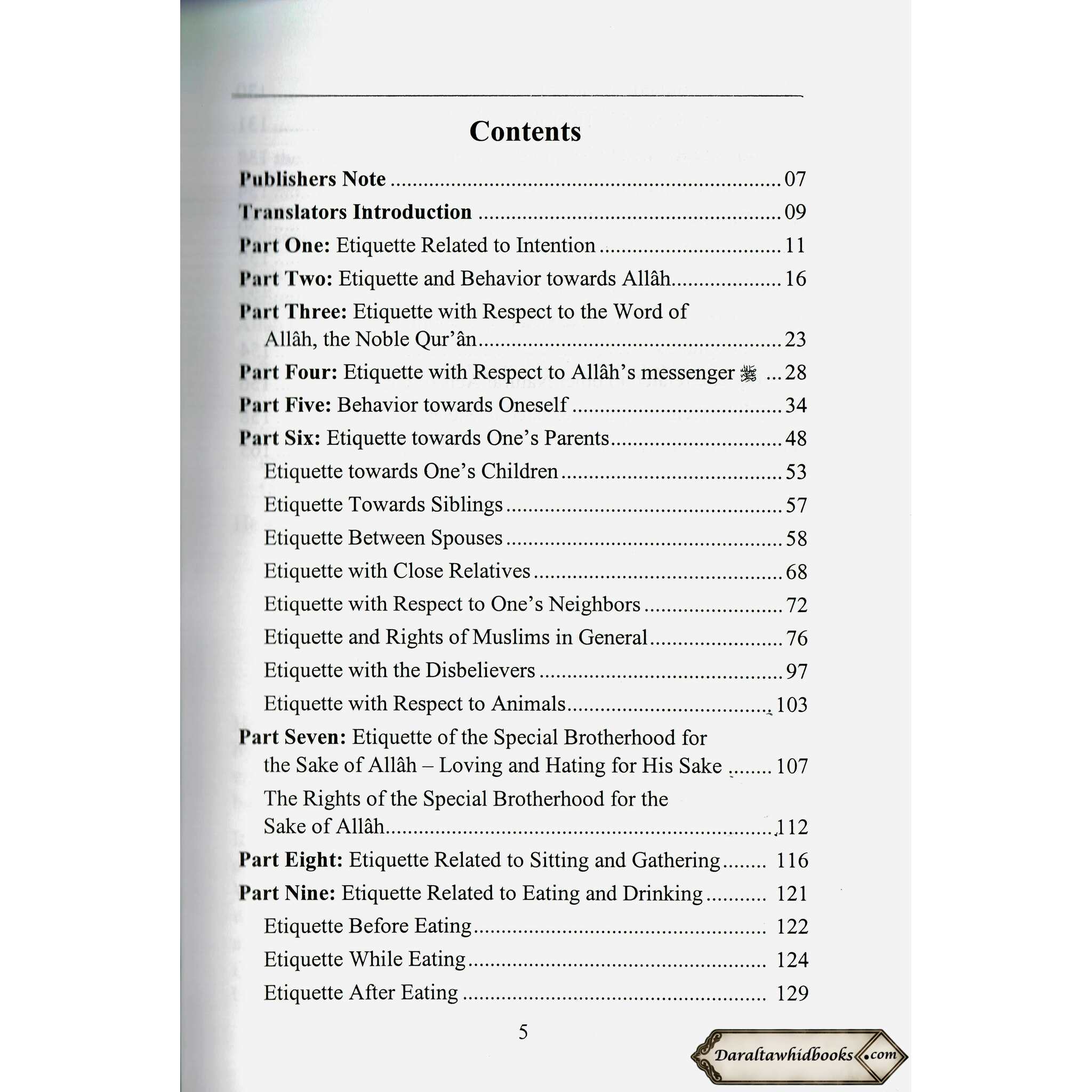 The book offers down-to-earth exhortation on the most proficient method to exhibit the right Islamic manners in all pieces of life, like connections with family, companions, neighbors, and outsiders. It covers many subjects, including good tidings, discussion, accommodation, and public ways of behaving.