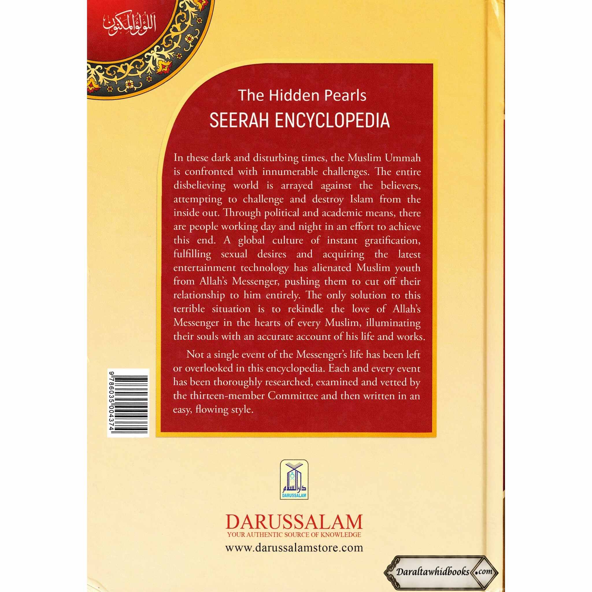 In these dark and disturbing times, the Muslim Ummah is confronted with innumerable challenges. The entire disbelieving world is arrayed against the believers attempting to challenge and destroy Islam from the inside out. Through political and academic means, there people working day and night in an effort to achieve this end. A global culture of instant gratification, fulfilling sexual desires and acquiring the latest entertainment technology has alienated Muslim youth from Allah's Messenger, pushing them to cut off their relationship to him entirely. The only solution to this terrible situation is to rekindle the love of Allah's Messenger in the hearts of every Muslim, illuminating their souls with an accurate account of his life and works. Not a single event of the Messenger's life has been left or overlooked in this encyclopedia. Each and every event has been thoroughly researched, examined and vetted by the thirteen-member Committee and then written in an easy, flowing style. Note: This NOT the translation of the 4-Vol Arabic work with the same name, اللؤلؤ المكنون. It is a brand new work recently compiled by Darussalam originally in Urdu and being translated in to other languages of the world.