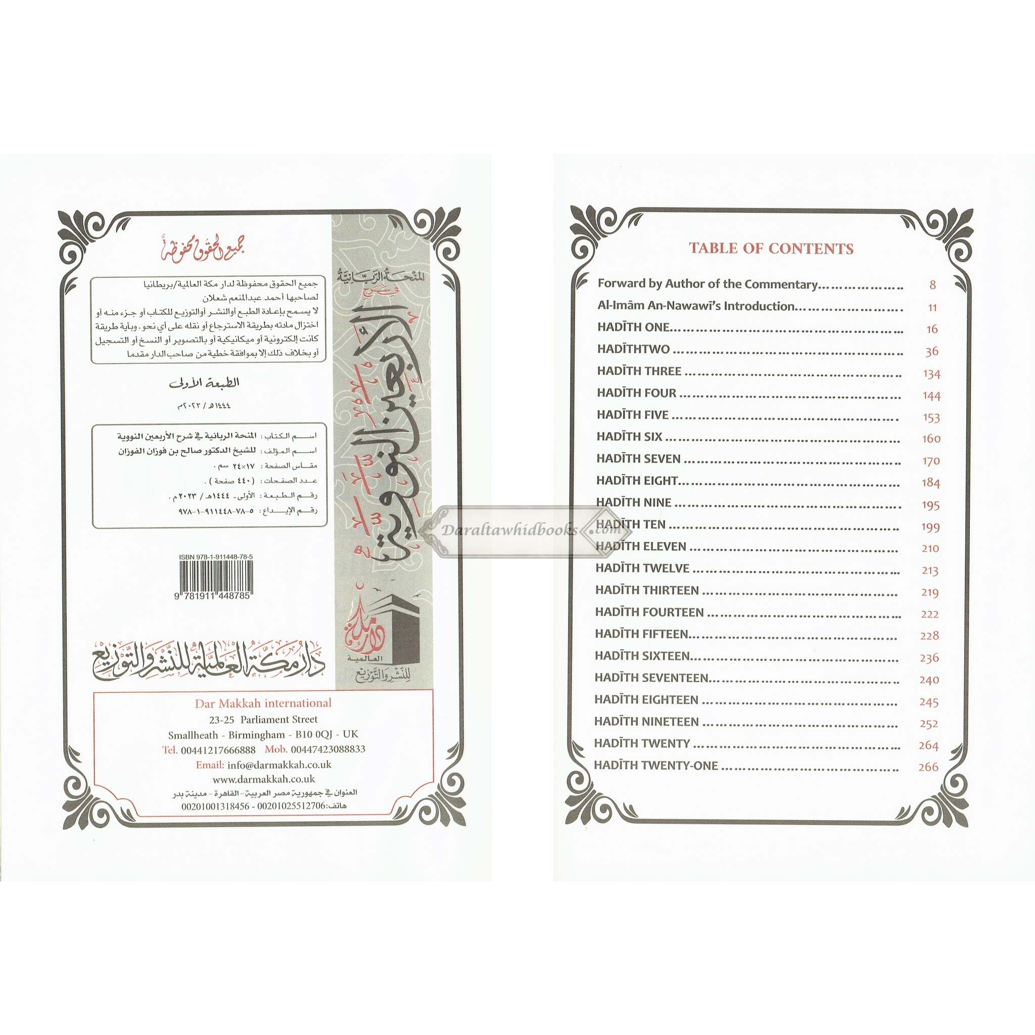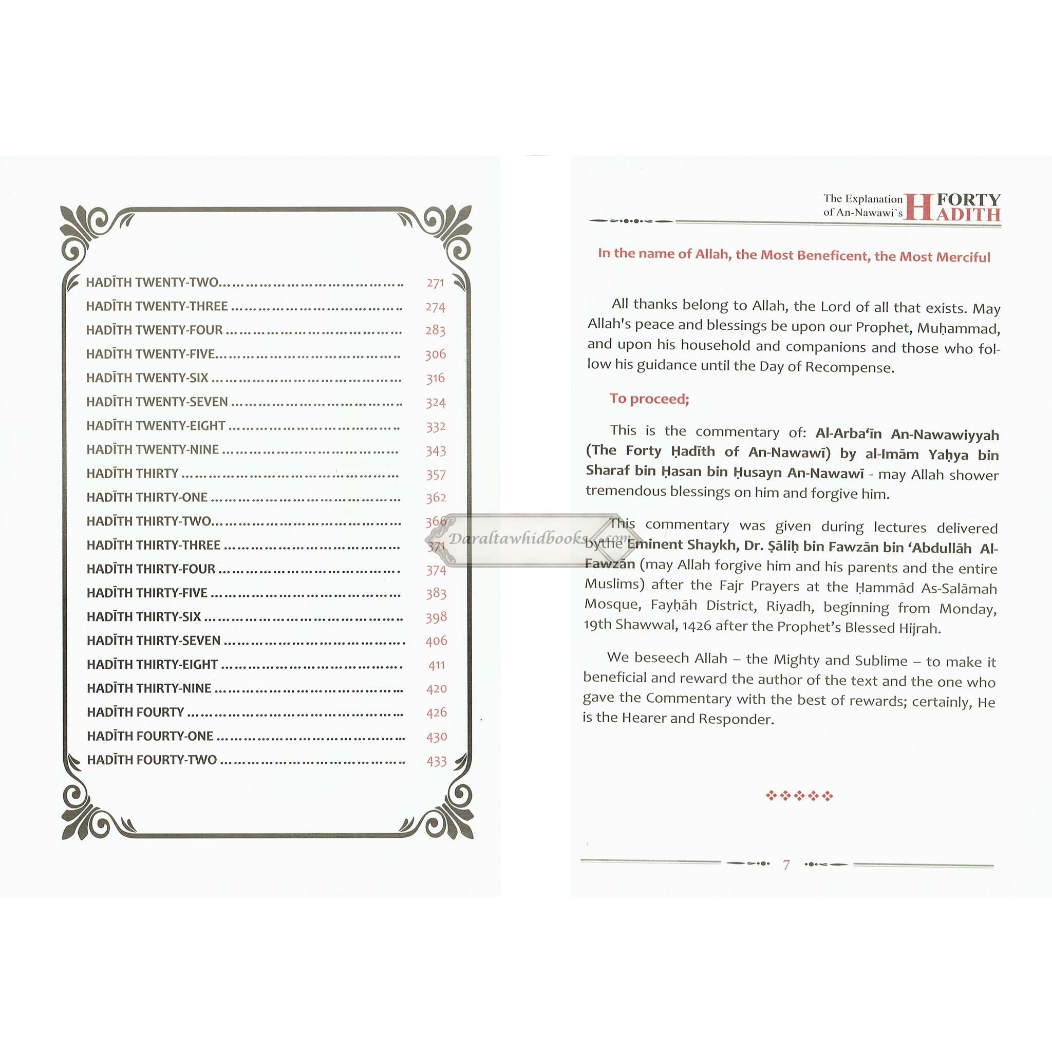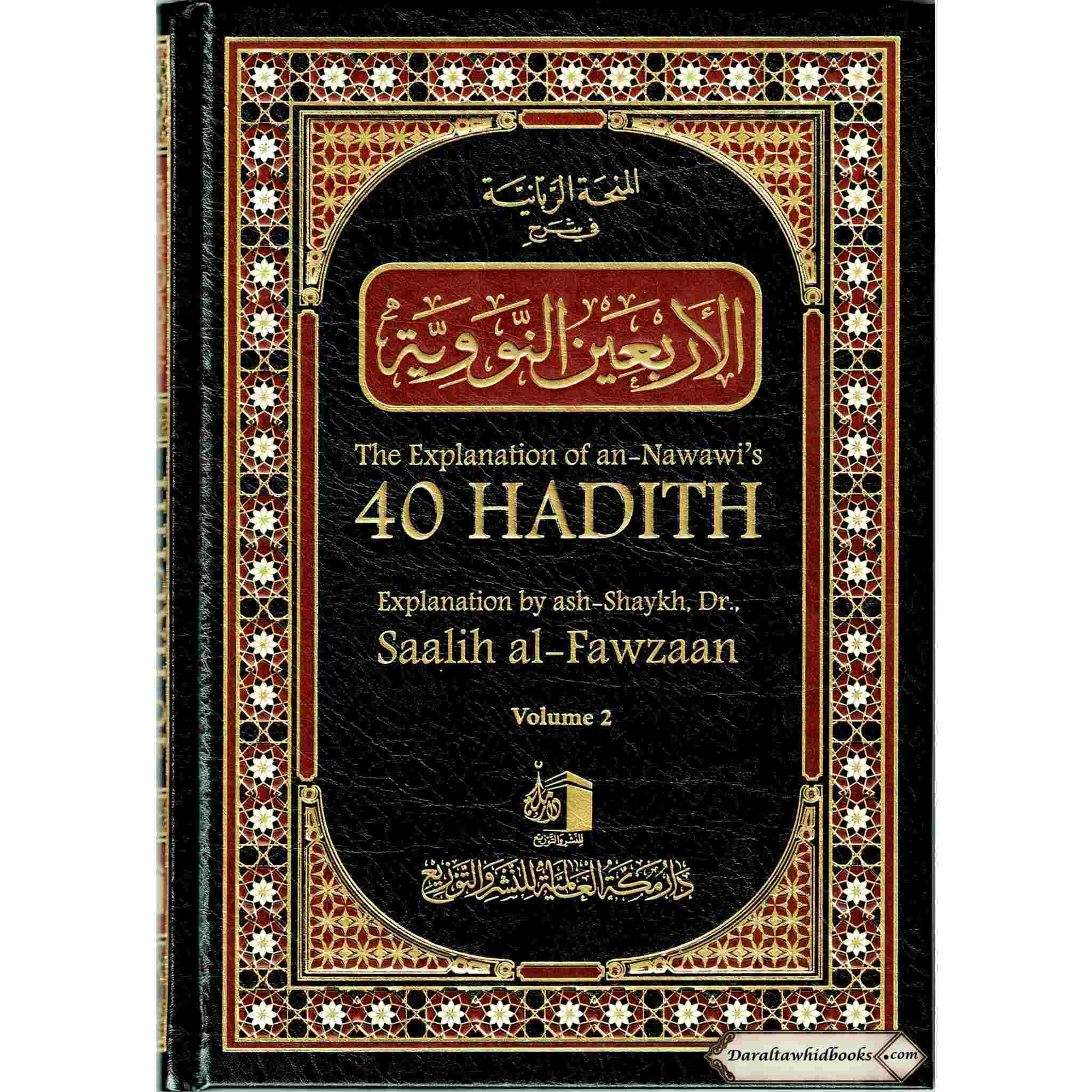 A thorough and educational book on Imam Nawawi's 40 hadiths, Shaykh Saalih al-Fawzaan's explanation of Imam Nawawi's 40 Hadiths, is available in two volumes. There are two volumes to the book, each of which contains 20 hadiths. Shaykh al-Fawzaan addresses the significance of hadiths, the life of Imam Nawawi, and the methodology of the 40 hadiths in the introduction to the first volume of the book. The subsequent chapters of the first volume go into great length about the 20 hadiths. Each hadith is thoroughly explained by Shaykh al-Fawzaan, including its chain of transmission, its significance, and any relevant legal decisions. He also offers commentary on the Sunnah and Quranic hadiths. It goes into great length about the remaining 20 hadiths, explaining each one's narration chain, significance, and legal implications. Anyone who wishes to understand more about the 40 hadiths of Imam Nawawi might check out Shaykh Saalih al-Fawzaan's interpretation of them in their two-volume set.This is the commentary of Al Arba 'in An-Nawawwiyyah (The forty hadith of Imam An-Nawawi) by Imam Yahya Bin Sharaf Bun Hasan bin Husayn An-Nawawi. This commentary was given during lessons by the Shaykh Salih bin Fawzan bin Abdullah bin Al-Fawzan, after the fajr prayer at the Hammad As-Salamah masjid in Riyadh.