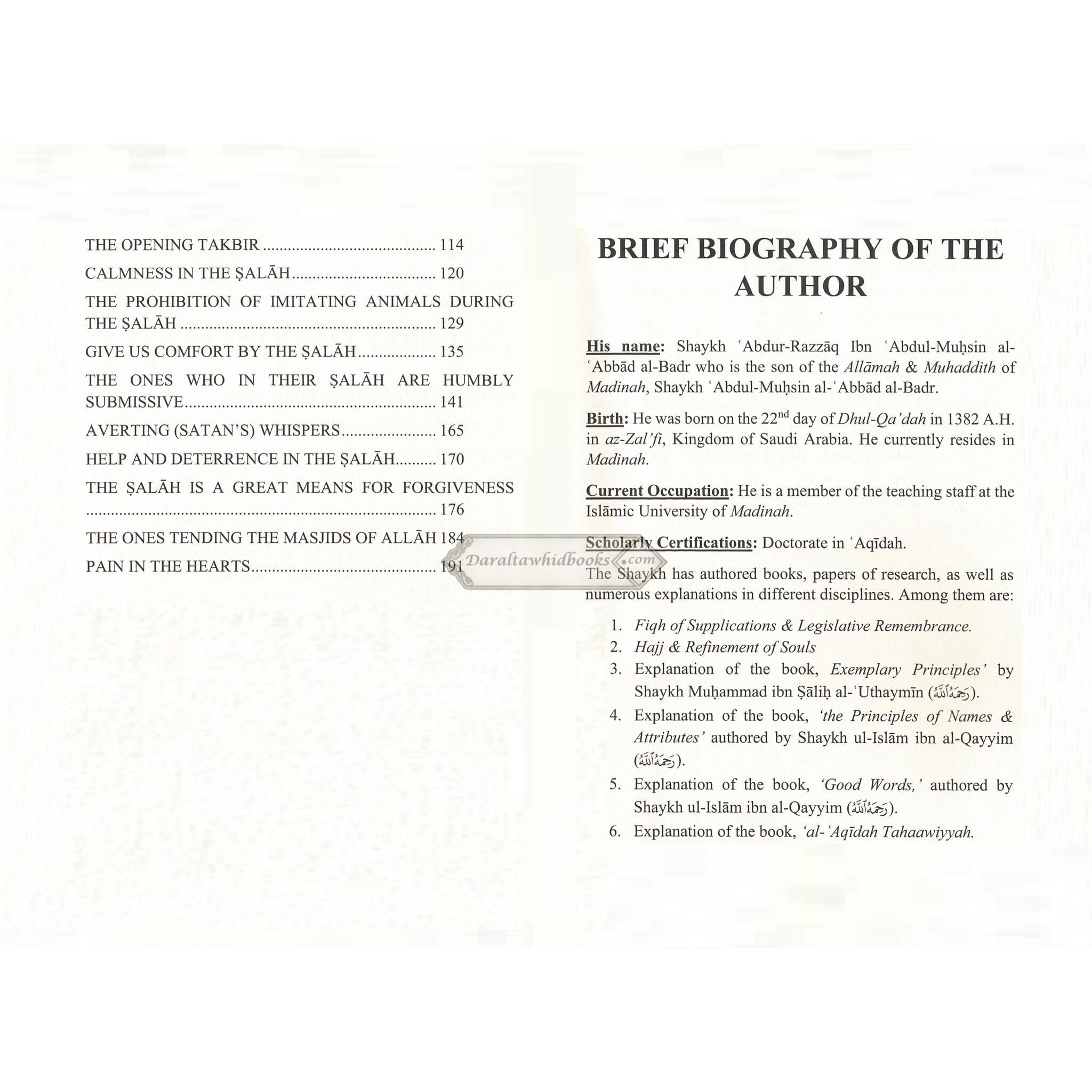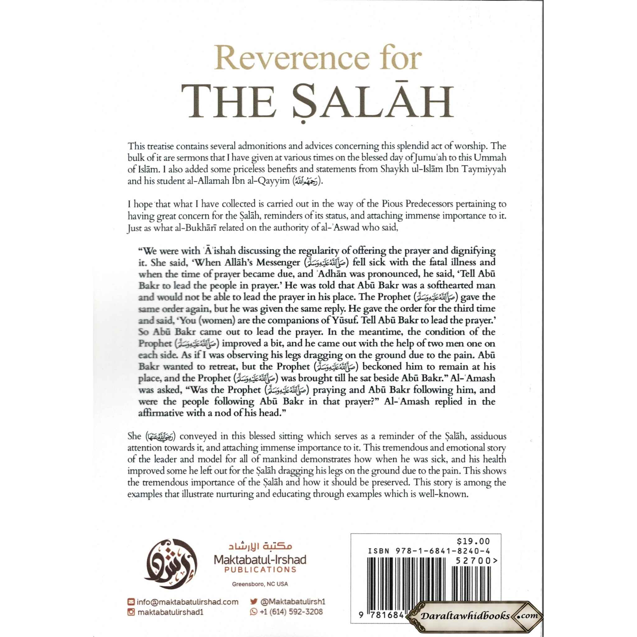 Shaykh Abdur Razzaq ibn Abdul Muhsin Al-Abaad al-Badr's book "Reverence for the Salah" is profound and enlightening. The acclaimed scholar digs deeply into the significance of Salah (Islamic prayer) and the value of establishing sincere reverence and dedication to this act of worship in this excellent work. Shaykh Abdur Razzaq Al-Badr gives excellent insights on how to achieve Khushu' (humility and attentiveness) in Salah throughout the pages of this book. He dives into the spiritual components of prayer, advising readers on how to strengthen their relationship with Allah through each prayer and transform it into a transformational and gratifying experience.