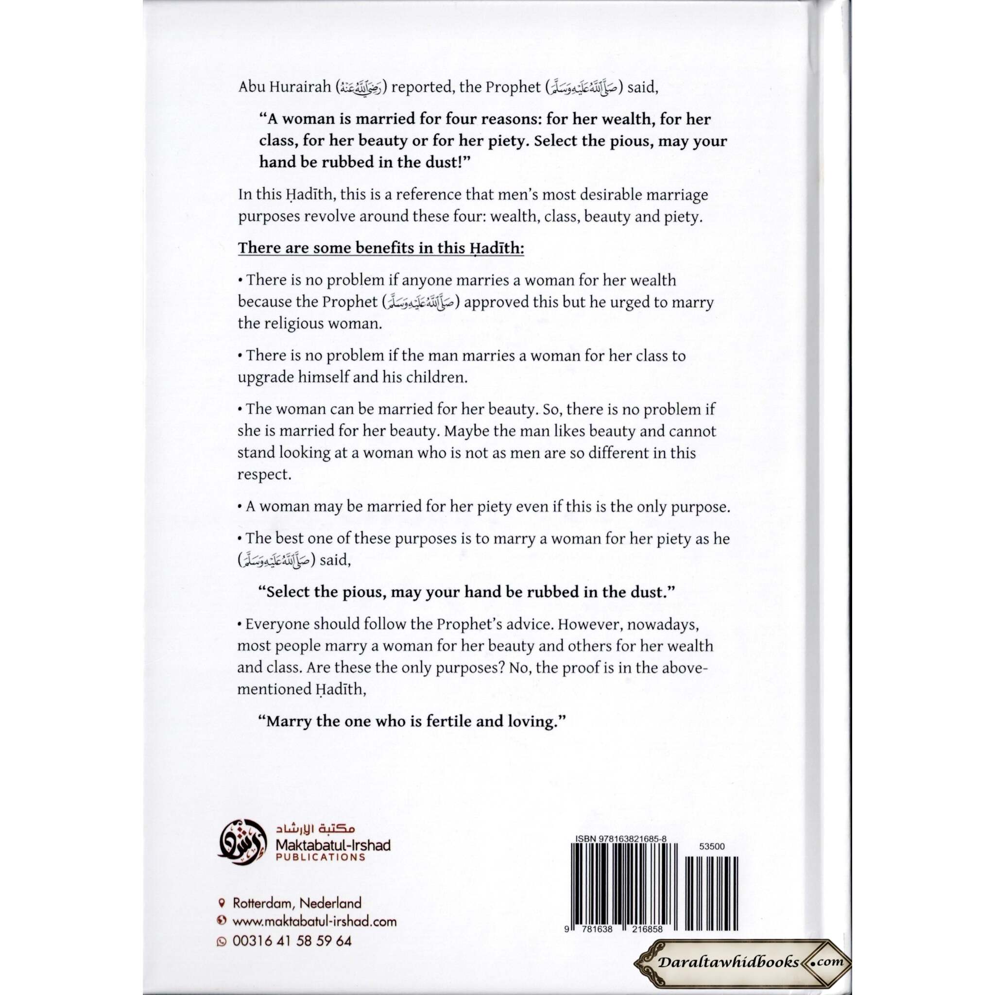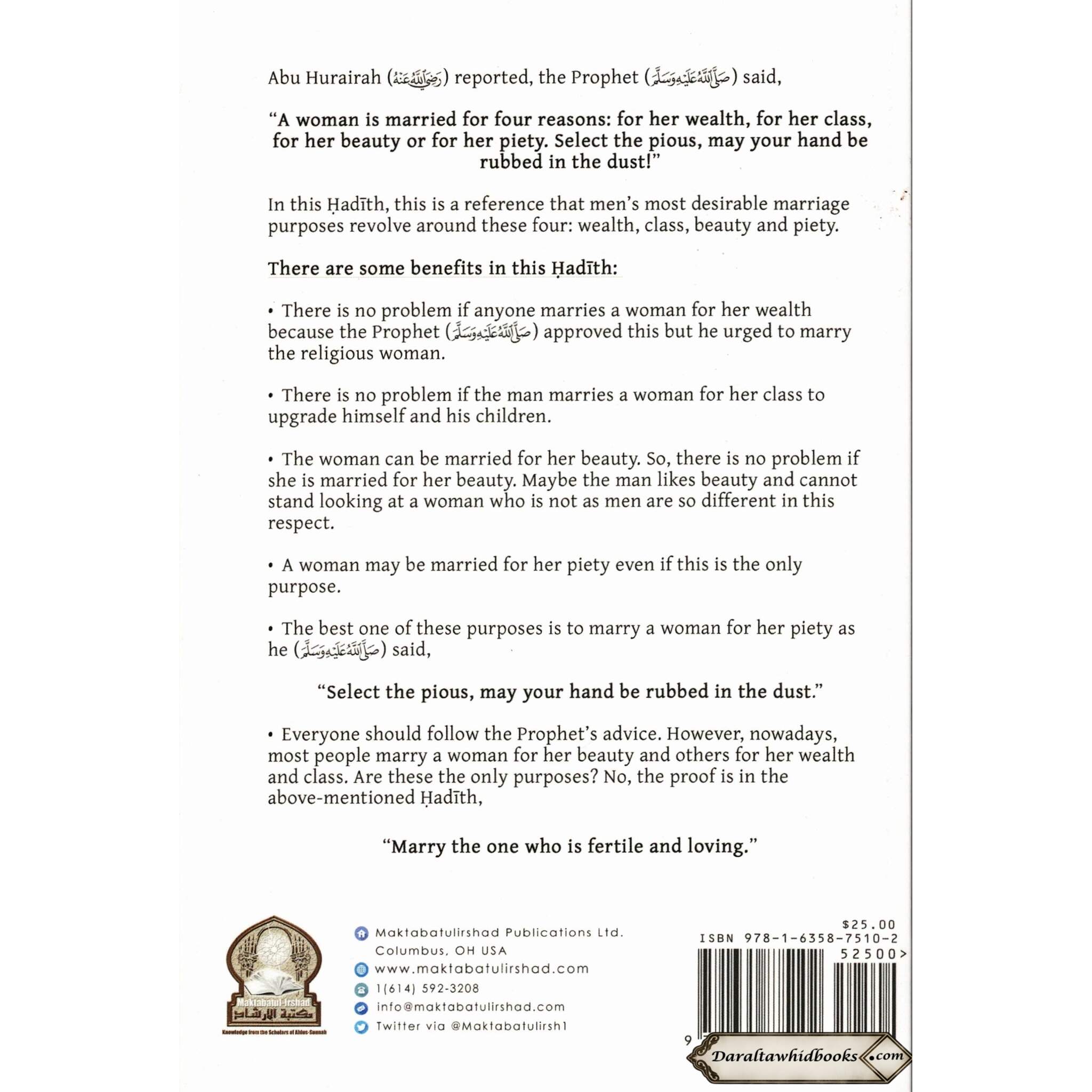 The book contains various inferences to Quranic stanzas and Hadith (idioms and activities of the Prophet Muhammad, harmony arrive). It utilizes essential sources to make sense of the basics of marriage in Islam.