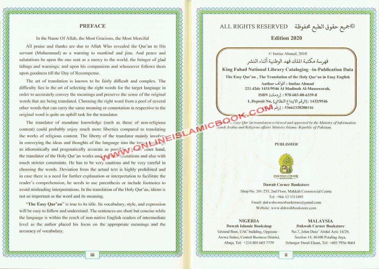 Imtiaz Ahmad's "The Easy Quran: Translation of the Holy Quran in Easy English" is a great resource that provides an accessible and simplified translation of the Quran. Imtiaz Ahmad explains the profound teachings of the Quran in simple English in this book, making it suited for readers of all levels.The book covers the complete Quran, translating its passages in a simple and straightforward manner. Imtiaz Ahmad's method guarantees that complicated topics are delivered in a straightforward and understandable manner, allowing readers to easily absorb the message and direction of the Quran. "The Easy Quran" is a fantastic resource for everyone who wants to learn the wisdom and guidance of the Quran, regardless of their knowledge of Arabic. It is especially useful for new Muslims, young readers, and anyone searching for an easy approach to learning about the Quran's teachings.Readers can acquire insights into the moral and spiritual direction provided by the Quran through this translation, establishing a closer relationship to the divine message. Imtiaz Ahmad's initiative to produce a simple translation improves the Quran's accessibility and relevance for a broader audience. "The Easy Quran: Translation of the Holy Quran in Easy English" is an important contribution to Quranic knowledge. Imtiaz Ahmad's commitment to presenting the Quran in simple English allows people from all walks of life to enjoy the everlasting wisdom and beauty of this precious text.