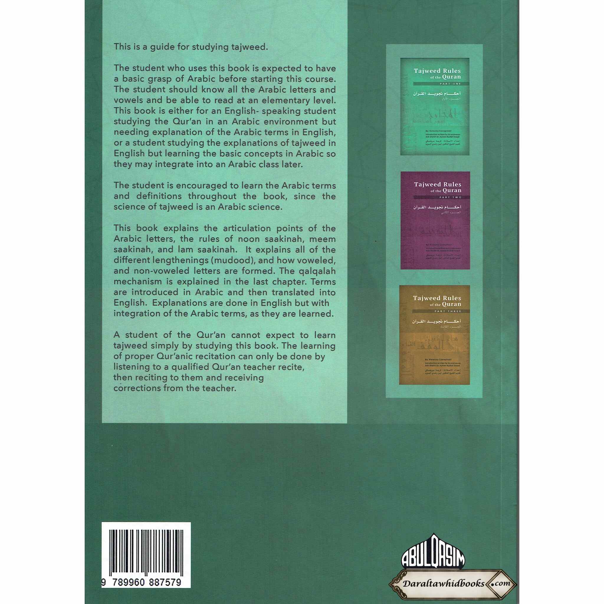 A student of the Qur'an cannot except to learn tajweed simply by studying this book. The learning of proper Qur'anic recitation can only be done by listening to a qualified Qur'an teacher recite, then reciting to them and receiving corrections from the teacher.