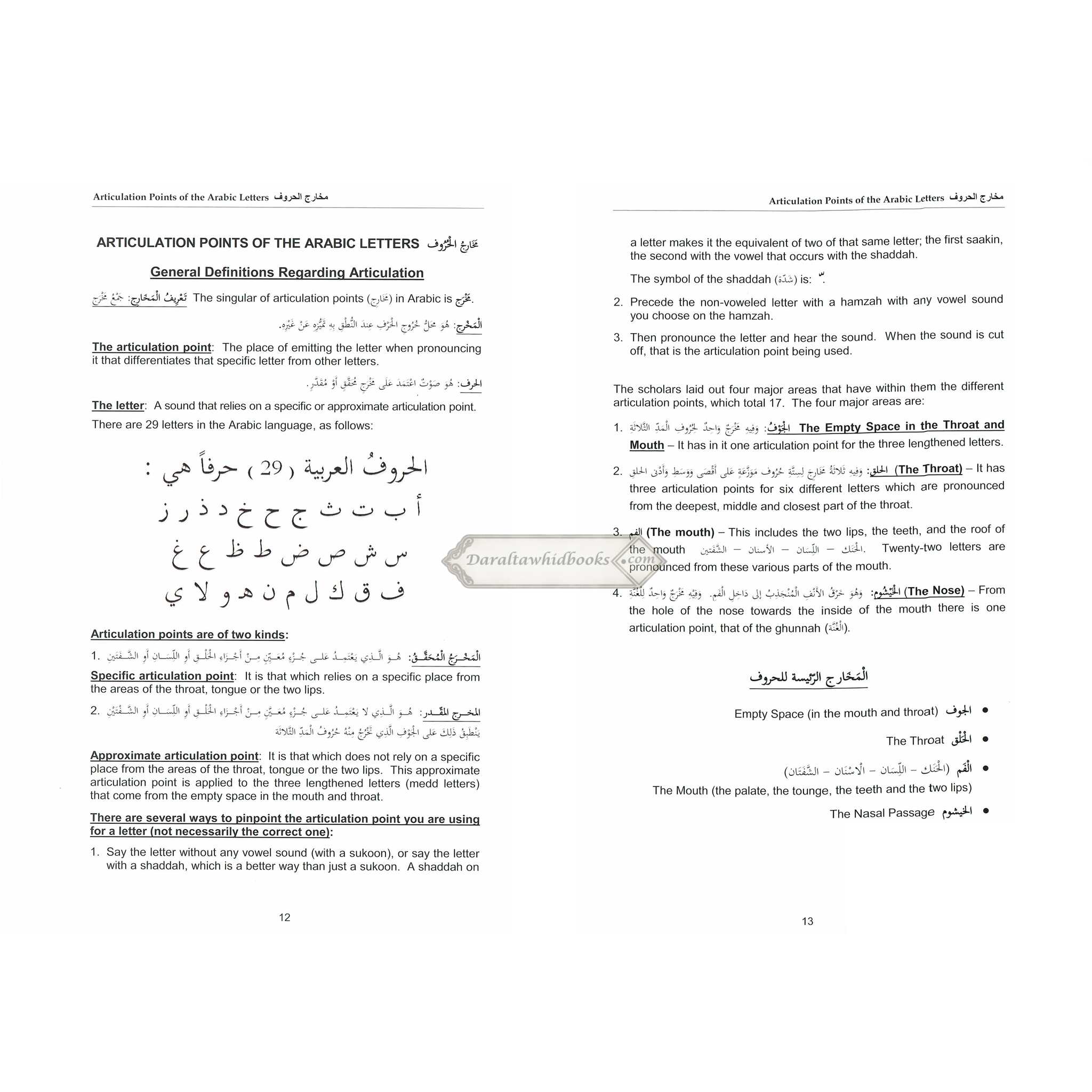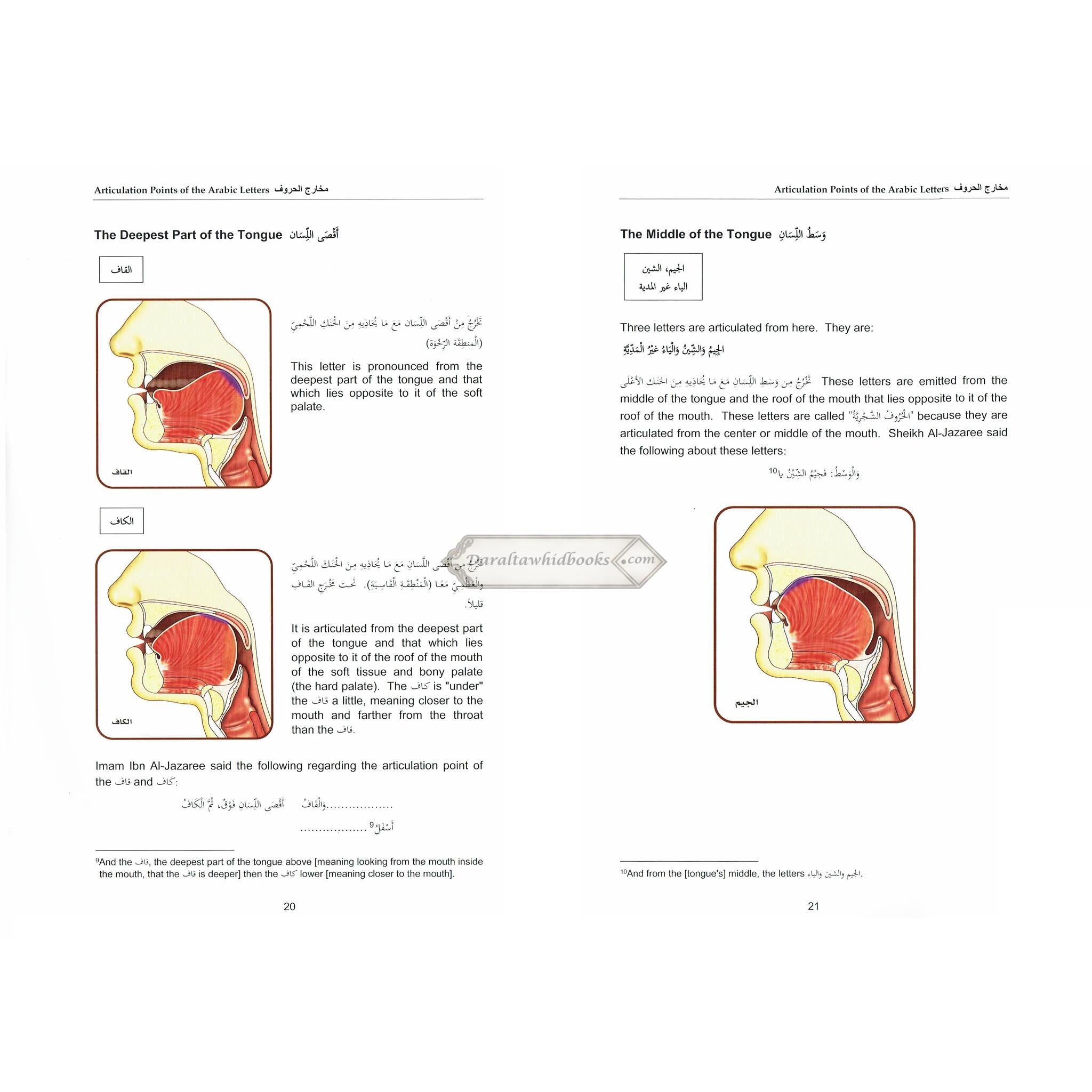 This book explains the articulation points of the Arabic letters, the rules of noon saakinah, meem saakinah, and lam saakinah. It explains all of the different lengthenings (mudood), and how voweled, and non-voweled letters are formed. The qalaqah mechanism is explained in the last chapter. Terms are introduced in Arabic, and the translated into English. Explanations are done in English, but with integration of Arabic terms, as they are learned.