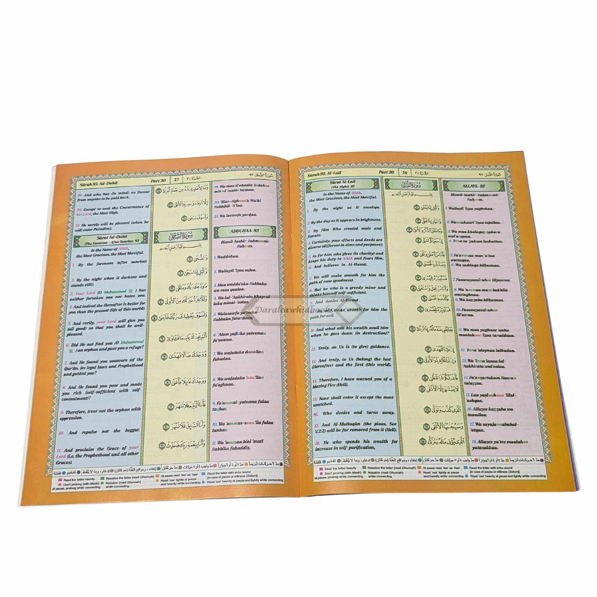 This exquisitely produced Juz Amma (Part 30 of the Qur'an) will make it easier the recitation and memorizing of the Qur'an. This book includes Roman transliteration for readers who are not yet proficient in reading Arabic script, as well as Tajweed guidelines in color-coded text to assist readers in pronouncing each letter correctly. This edition blends accuracy, portability, and clarity, making it ideal for novices, non-Arabic speakers, and anybody looking to improve their recitation.