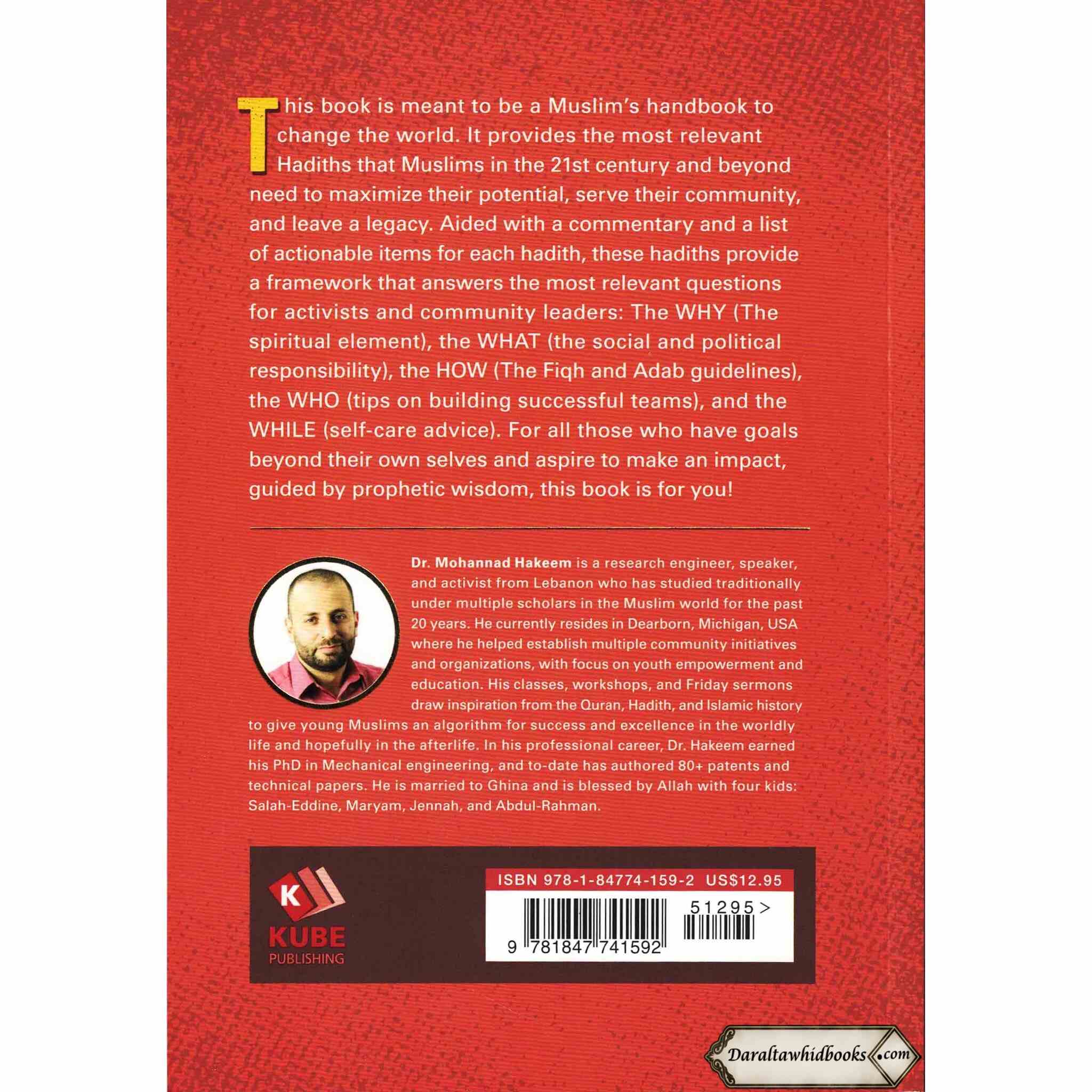 Dr. Mohammad Hakeem's book "40 Hadith on Community Service & Activism" is a collection of 40 Quranic verses that emphasize the importance of activism and community service in the Islamic faith. The book includes a commentary to clarify the significance and meaning of each hadith. Additionally, it offers a complete list of other sources for people looking for more information. For individuals who want to learn more about Islamic teachings on civic engagement and activity, this book is a priceless resourceThis book is meant to be a Muslim's handbook to change the world. It provides the most relevant Hadiths that Muslims in the 21st century and beyond need to maximize their potential, serve their community, and leave a legacy. Aided with a commentary and a list of actionable items for each hadith, these hadiths provide a framework that answers the most relevant questions for activists and community leaders: The WHY (The spiritual element), the WHAT (the social and political responsibility), the HOW (The Figh and Adab guidelines), the WHO (tips on building successful teams), and the WHILE (self-care advice). For all those who have goals beyond their own selves and aspire to make an impact, guided by prophetic wisdom, this book is for you!