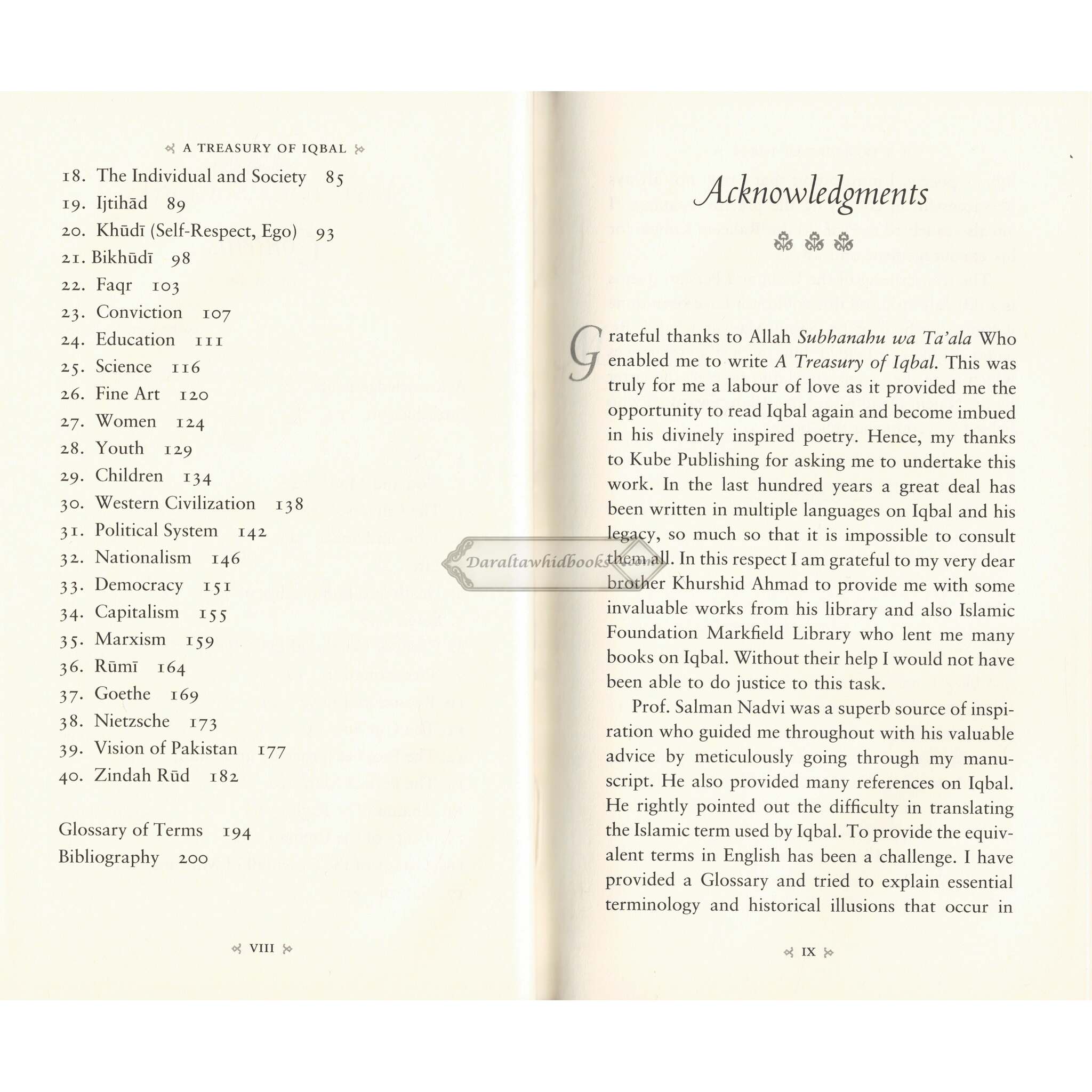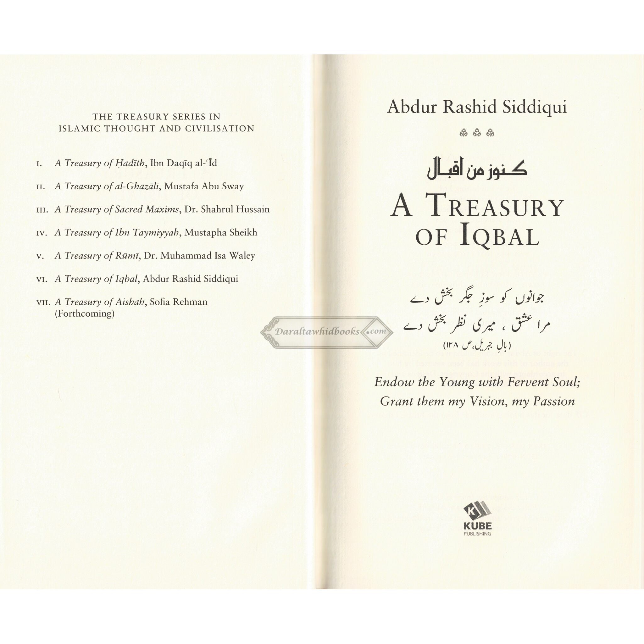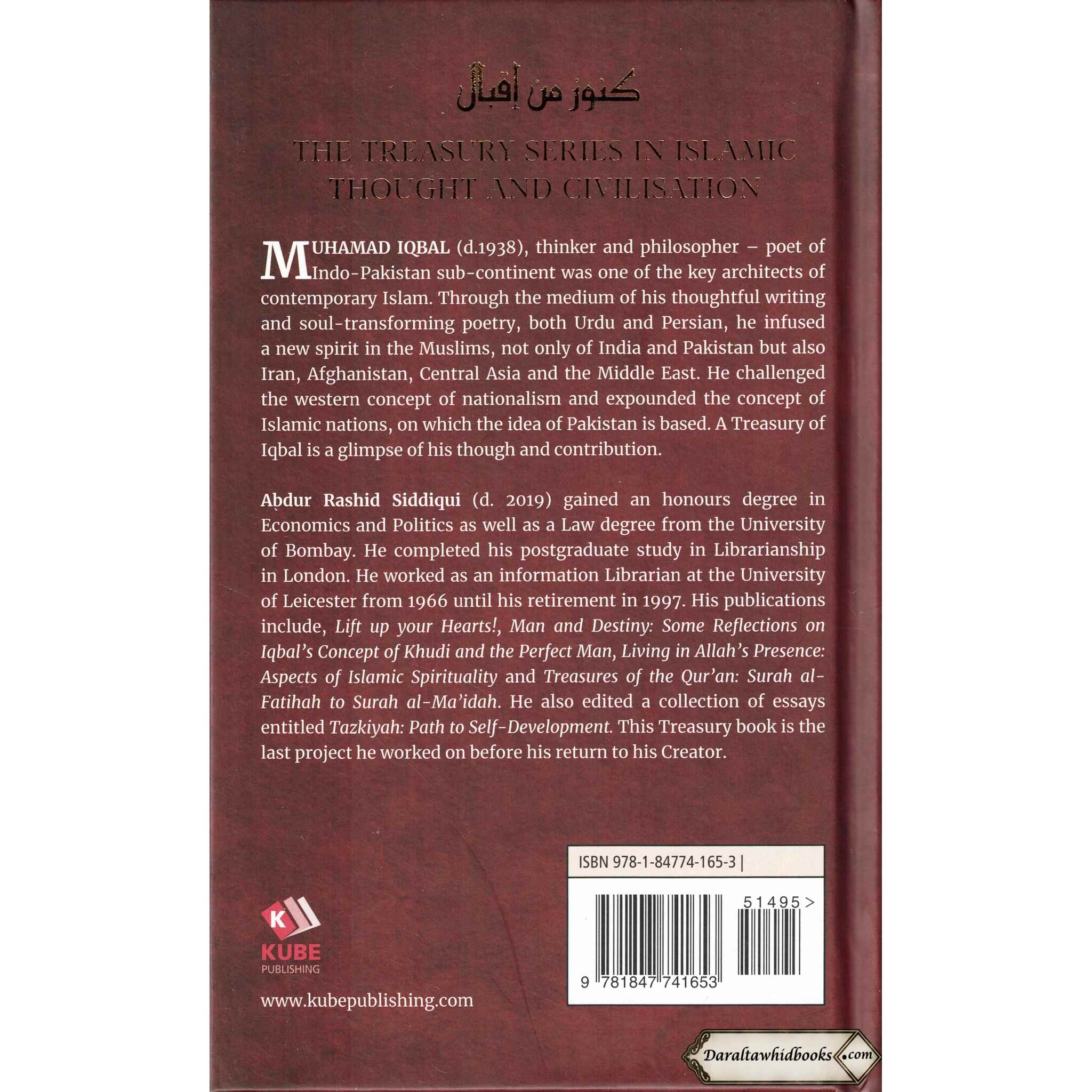 MUHAMAD IQBAL (d.1938), thinker and philosopher - poet of Indo-Pakistan sub-continent was one of the key architects of contemporary Islam. Through the medium of his thoughtful writing and soul-transforming poetry, both Urdu and Persian, he infused a new spirit in the Muslims, not only of India and Pakistan but also Iran, Afghanistan, Central Asia and the Middle East. He challenged the western concept of nationalism and expounded the concept of Islamic nations, on which the idea of Pakistan is based. A Treasury of Iqbal is a glimpse of his though and contribution. Abdur Rashid Siddiqui (d. 2019) gained an honours degree in Economics and Politics as well as a Law degree from the University of Bombay. He completed his postgraduate study in Librarianship in London. He worked as an information Librarian at the University of Leicester from 1966 until his retirement in 1997. His publications include, Lift up your Hearts!, Man and Destiny: Some Reflections on Iqbal's Concept of Khudi and the Perfect Man, Living in Allah's Presence: Aspects of Islamic Spirituality and Treasures of the Qur'an: Surah al- Fatihah to Surah al-Ma'idah. He also edited a collection of essays entitled Tazkiyah: Path to Self-Development. This Treasury book is the last project he worked on before his return to his Creator.