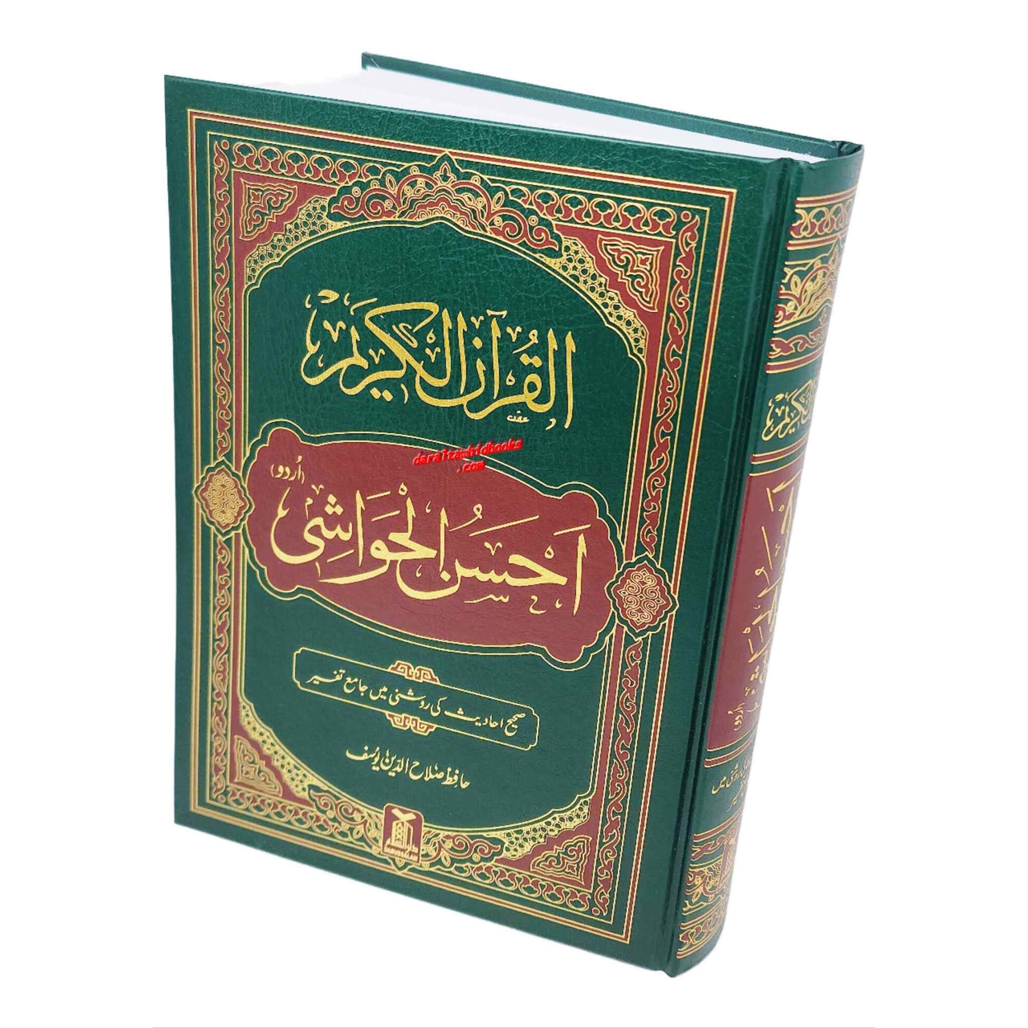 The Holy Quran's translation into Urdu, known as the Ahsan-al-Hawashi Quran, the author is renowned for its thoroughness, beauty, and fluency. The translator, Hafiz Salahuddin Yusuf, is well known and esteemed for his illustrious work, Ahsan-ul-Bayan. Hafiz Salahuddin Yusuf expertly combines commentary with the pertinent verses on the same page in this translation, showcasing his outstanding capacity to do this difficult task with great completeness. The two-color cover that the translation is provided adds to its appealing design. The Ahsan-al-Hawashi Quran, as a whole, is an exceptional Urdu translation of the Holy Quran that retains the translator's illustrious reputation and offers readers a thorough and attractive presentation of the sacred text.