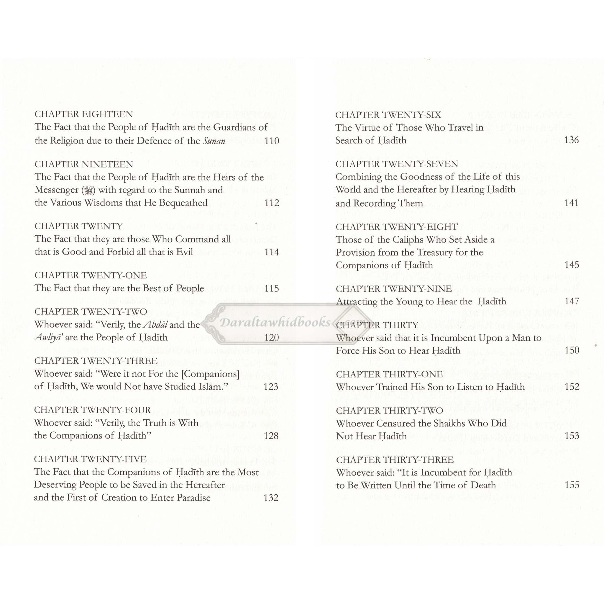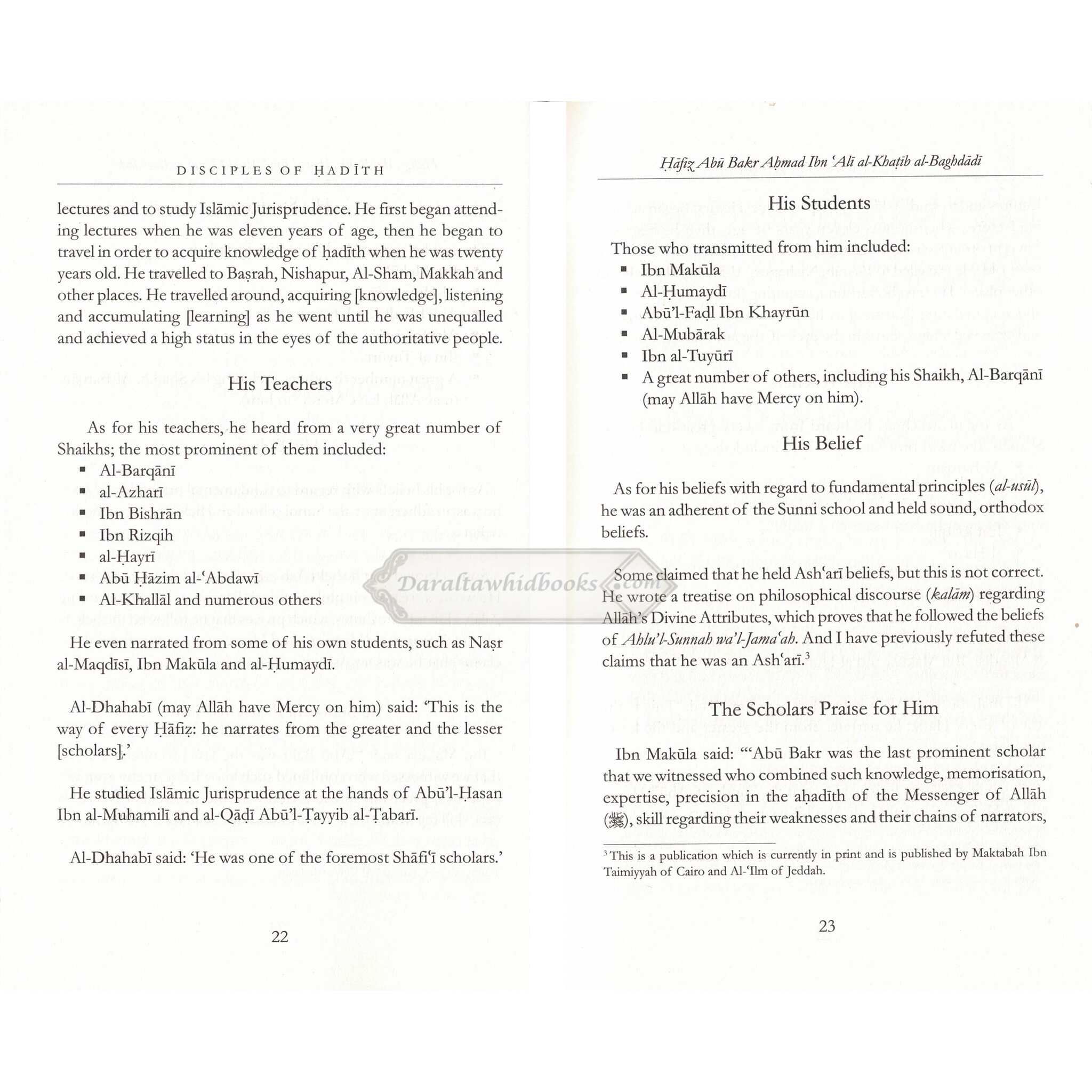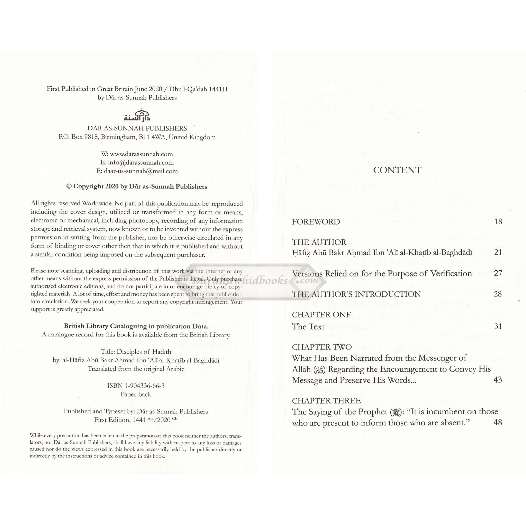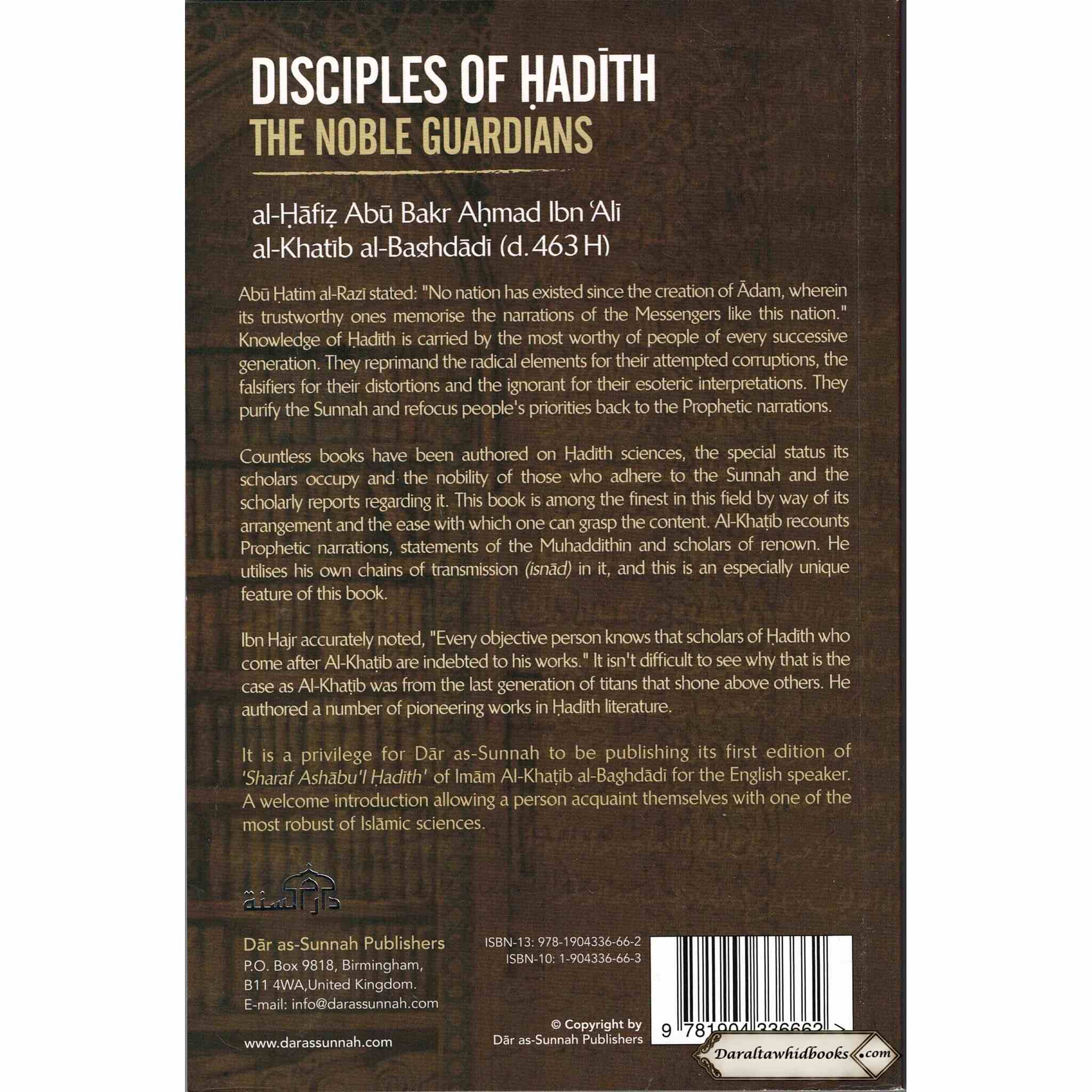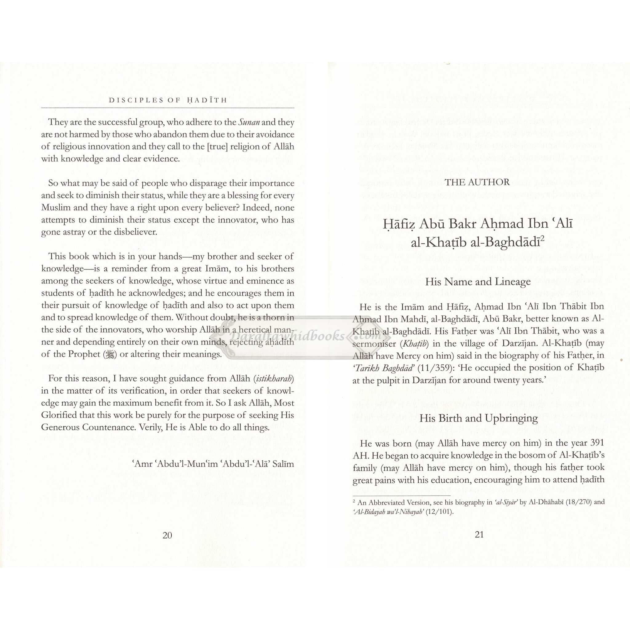Abi Hatim al-Razi said: "No nation has existed since the creation of Adam, wherein its trustworthy ones memorize the narrations of the Messengers like this nation." Knowledge of Hadith is carried by the most worthy of people of every successive generation. They reprimand the radical elements for their attempted corruptions, the falsifiers for their distortions and the ignorant for their esoteric interpretations. They purify the Sunnah and refocus people's priorities back to the Prophetic narrations. Countless books have been authored on the subject of Hadīth sciences, the special status its scholars occupy and the nobility of those who adhere to the Sunnah and the scholarly reports regarding it. Disciples of Hadith is among the finest in this field in the way it's arranged and the ease with which one can grasp the content. Al-Khatīb recounts Prophetic narrations, statements of the Muhaddithīn and scholars of renown, by way of his own chain of transmissions (isnād); and this is an especially unique feature of this book.