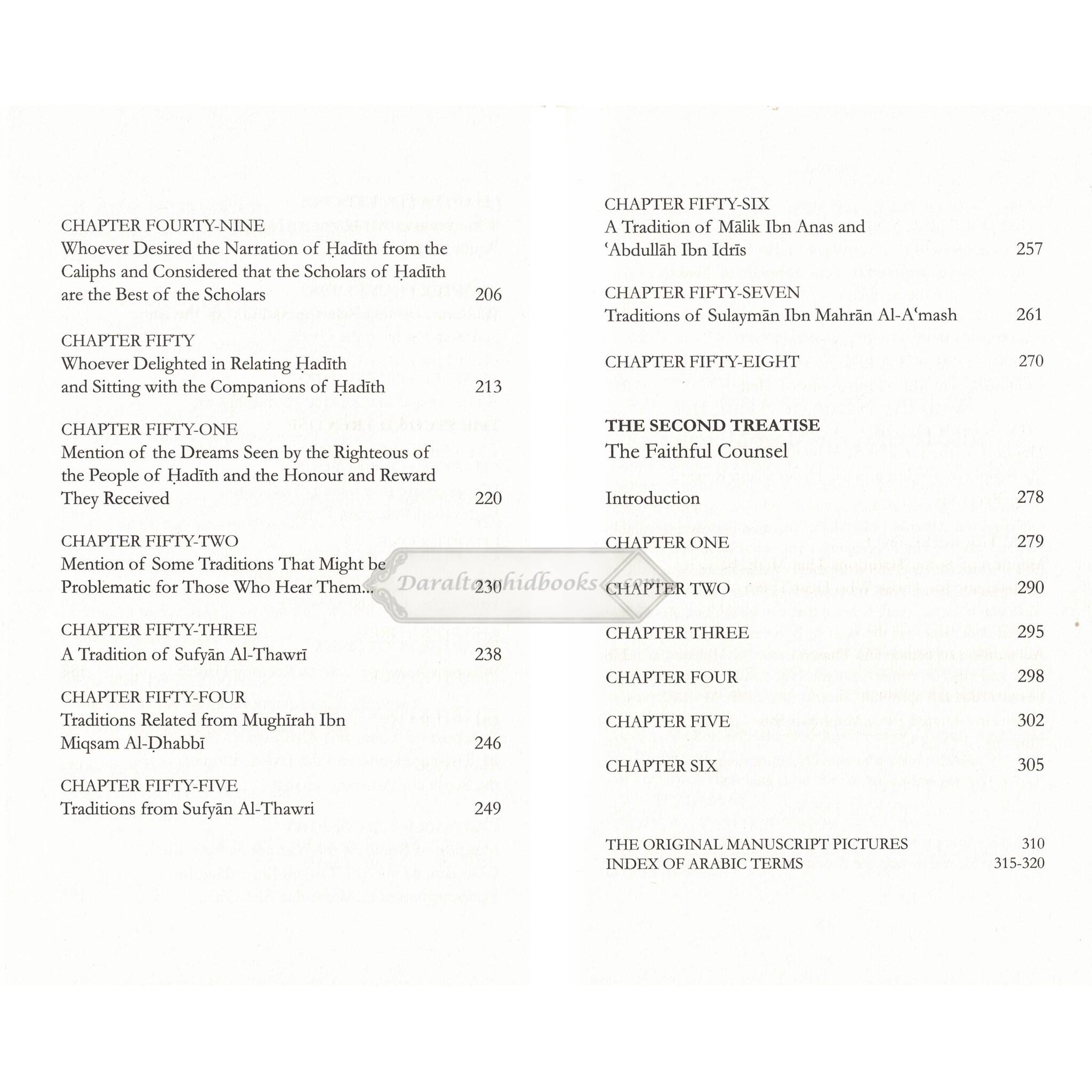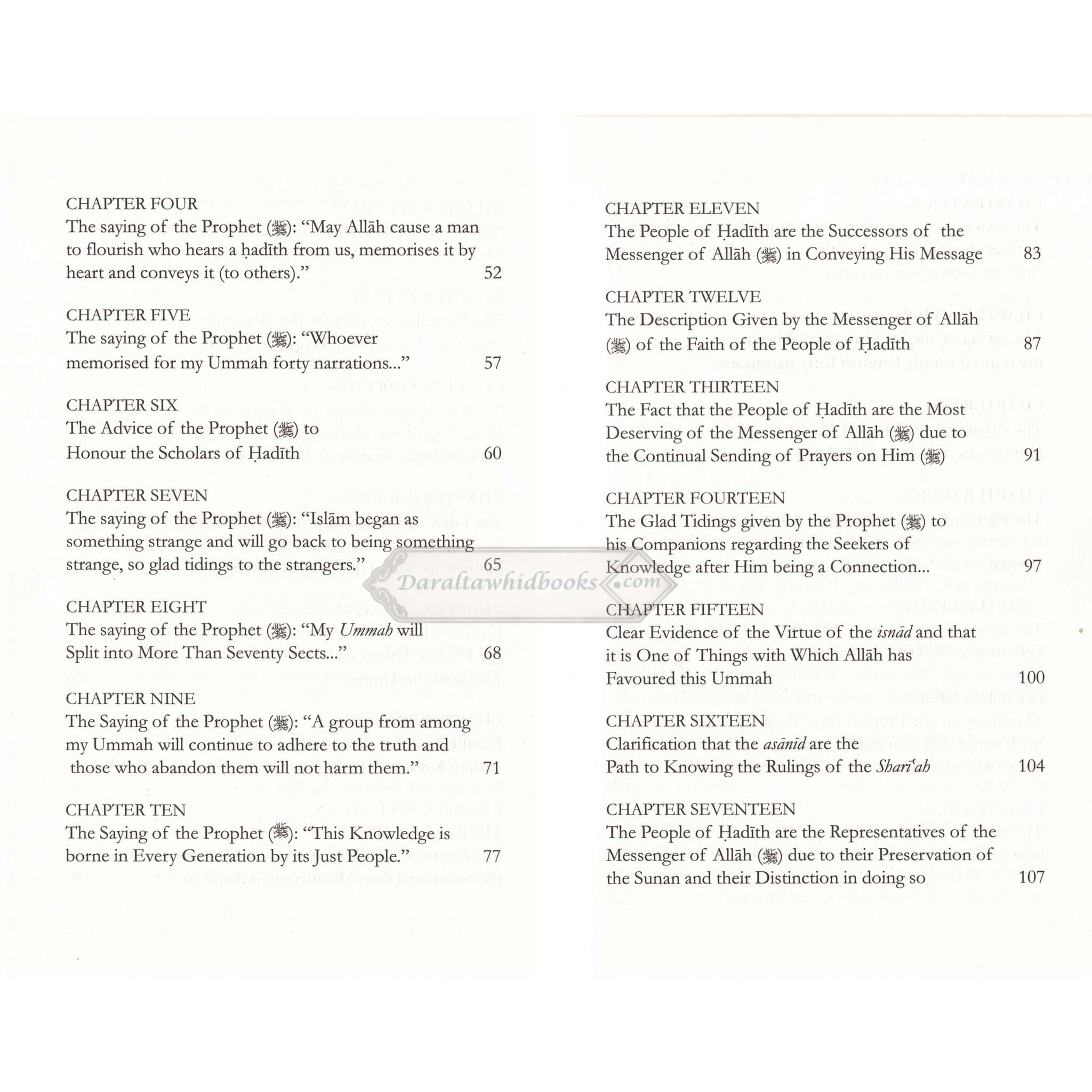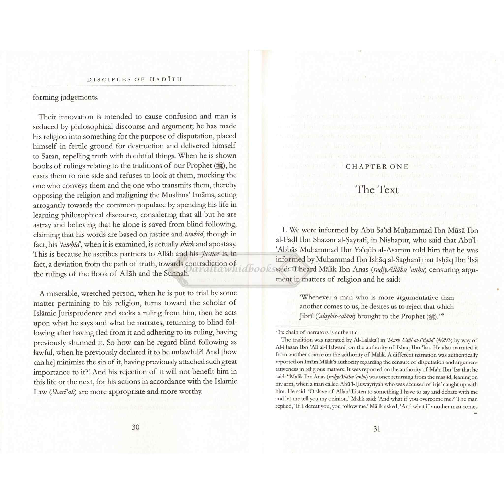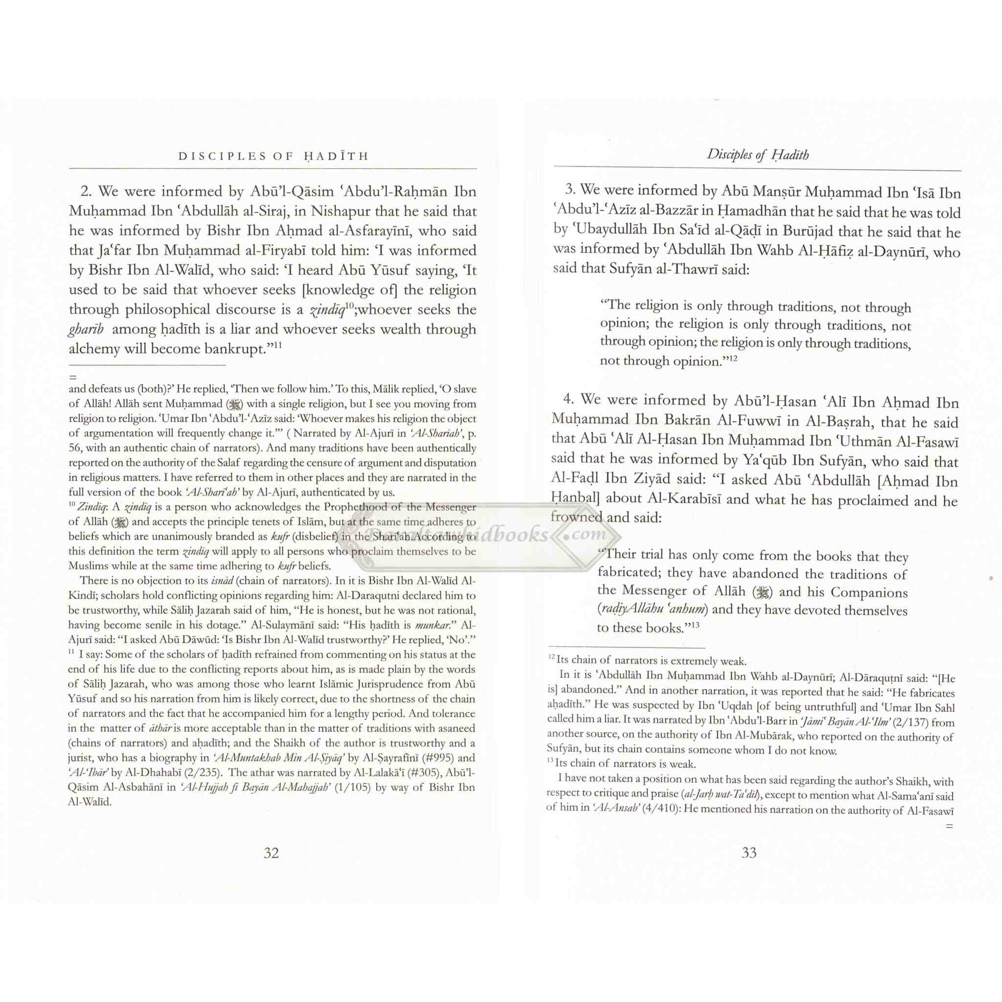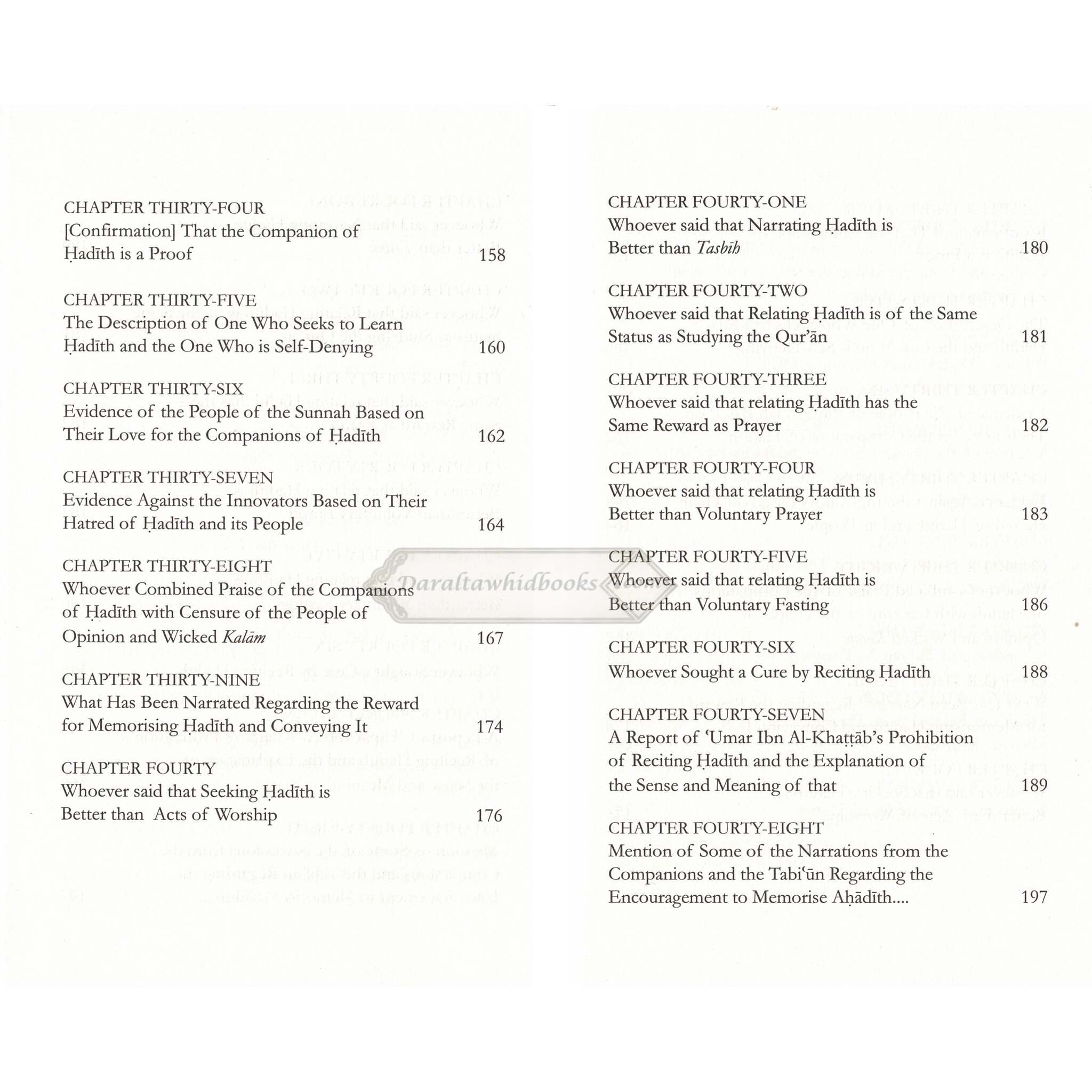 Abi Hatim al-Razi said: "No nation has existed since the creation of Adam, wherein its trustworthy ones memorize the narrations of the Messengers like this nation." Knowledge of Hadith is carried by the most worthy of people of every successive generation. They reprimand the radical elements for their attempted corruptions, the falsifiers for their distortions and the ignorant for their esoteric interpretations. They purify the Sunnah and refocus people's priorities back to the Prophetic narrations. Countless books have been authored on the subject of Hadīth sciences, the special status its scholars occupy and the nobility of those who adhere to the Sunnah and the scholarly reports regarding it. Disciples of Hadith is among the finest in this field in the way it's arranged and the ease with which one can grasp the content. Al-Khatīb recounts Prophetic narrations, statements of the Muhaddithīn and scholars of renown, by way of his own chain of transmissions (isnād); and this is an especially unique feature of this book.