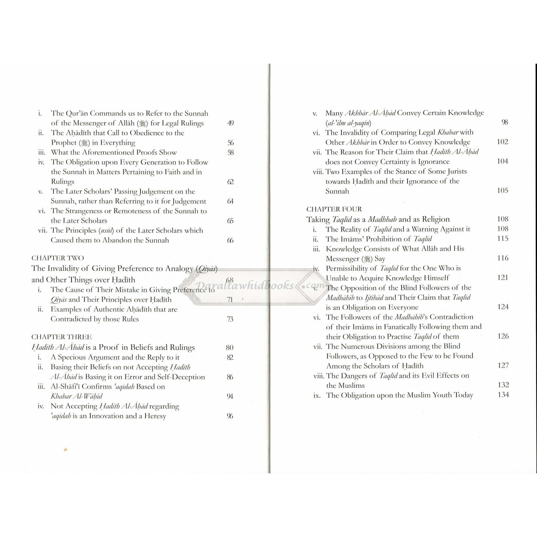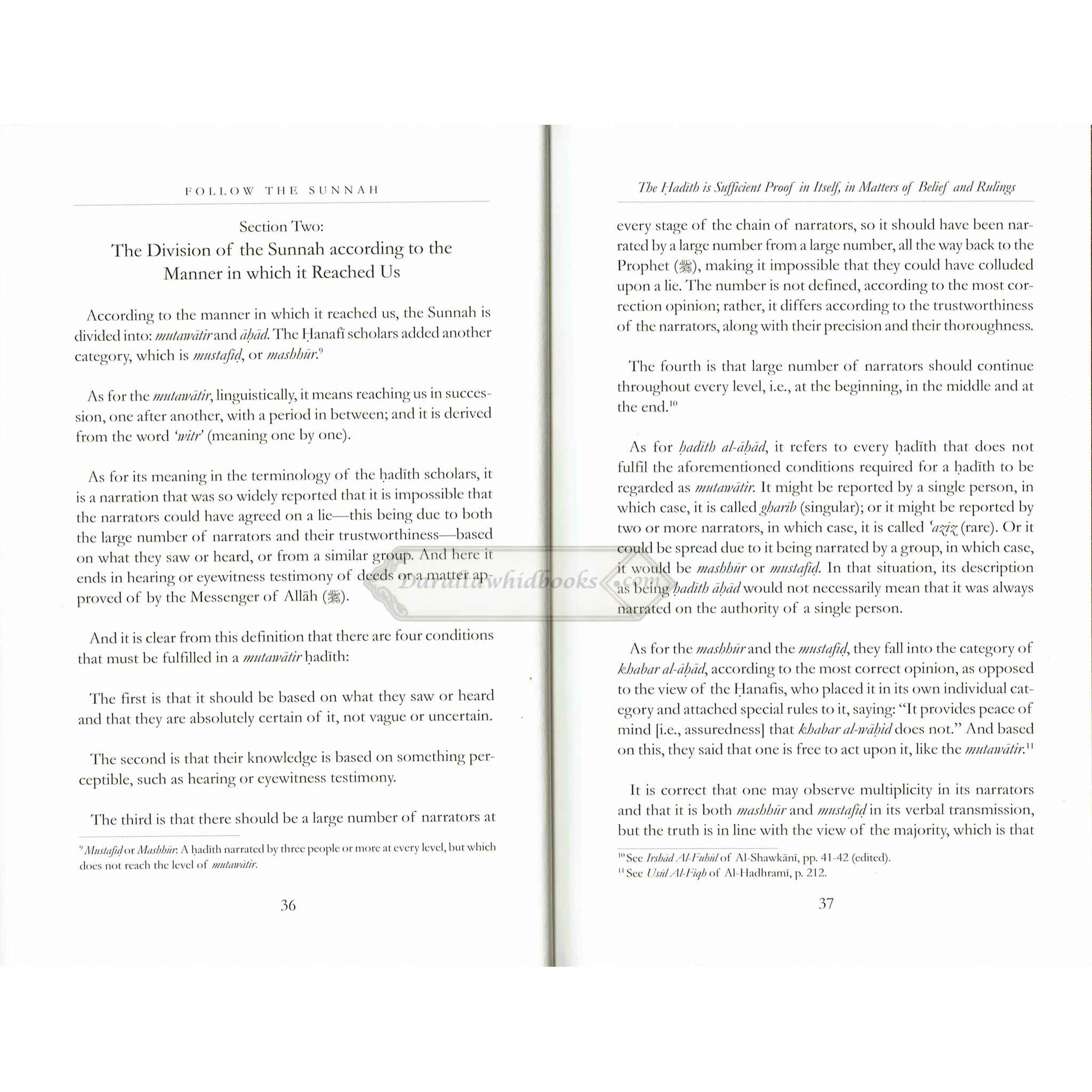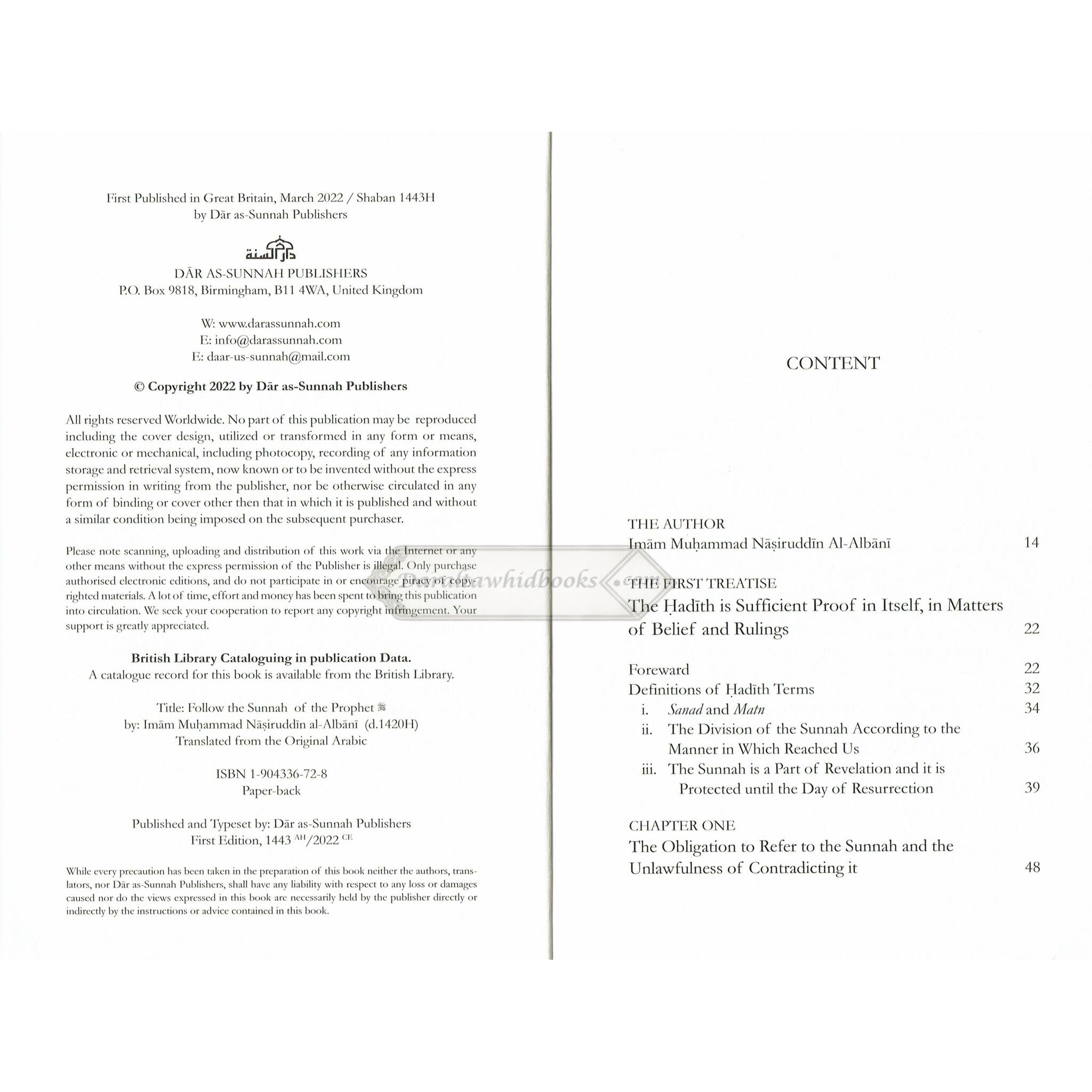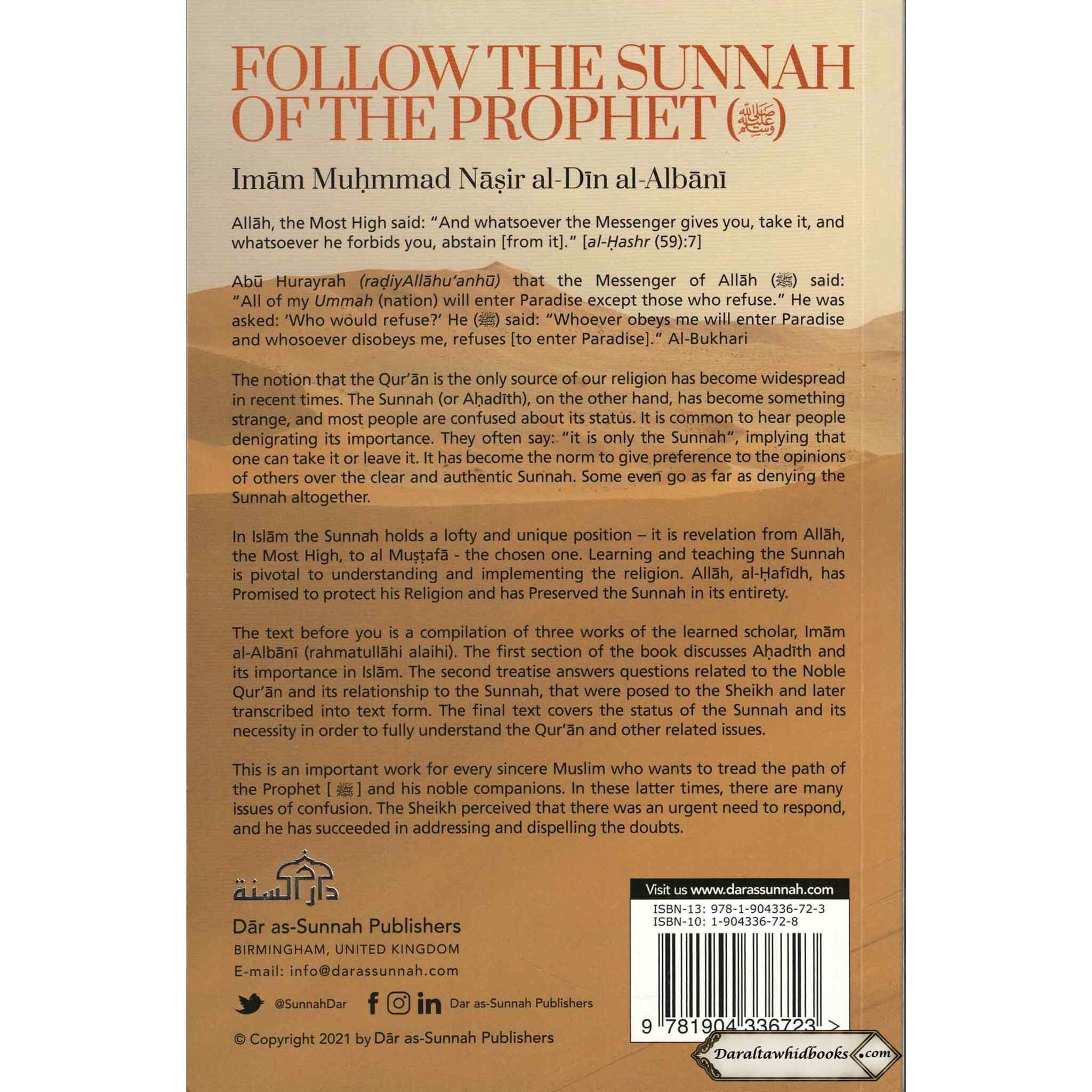 "Follow The Sunnah of The Prophet" Allah, the Most High said: "And whatsoever the Messenger gives you, take it, and whatsoever he forbids you, abstain [from it]." [al-Hashr (59):7]Abu Hurayrah (radiyAllahu'anhu) that the Messenger of Allah (peace and blessings be upon him) said: "All of my Ummah (nation) will enter Paradise except those who refuse." He was asked: 'Who would refuse?' He (peace and blessings be upon him) said: "Whoever obeys me will enter Paradise and whosoever disobeys me, refuses [to enter Paradise]." Al-BukhariThe notion that the Qur'an is the only source of our religion has become widespread in recent times. The Sunnah (or Ahadith), on the other hand, has become something strange, and most people are confused about its status. Follow The Sunnah of The Prophet is common to hear people denigrating its importance. They often say: "Follow The Sunnah of The Prophet", implying that one can take it or leave it. It has become the norm to give preference to the opinions of others over the clear and authentic Sunnah. Some even go as far as denying the Sunnah altogether.In Islam the Sunnah holds a lofty and unique position - it is revelation from Allah, the Most High, to al-Mustafa - the chosen one. Learning and teaching the Sunnah is pivotal to understanding and implementing the religion. Allah, al-Hafidh, has Promised to protect his Religion and has Preserved the Sunnah in its entirety. The text before you is a compilation of three works of the learned scholar, Imam al-Albani (rahmatullahi alaihi). The first section of the book discusses Ahadith and its importance in Islam. The second treatise answers questions related to the Noble Qur'an and its relationship to the Sunnah, that were posed to the Sheikh and later transcribed into text form. Follow The Sunnah of The Prophet final text covers the status of the Sunnah and its necessity in order to fully understand the Qur'an and other related issues.This is an important work for every sincere Muslim who wants to tread the path of the Prophet [peace and blessings be upon him] and his noble companions. In these latter times, there are many issues of confusion. The Sheikh perceived that there was an urgent need to respond, and he has succeeded in addressing and dispelling the doubts.