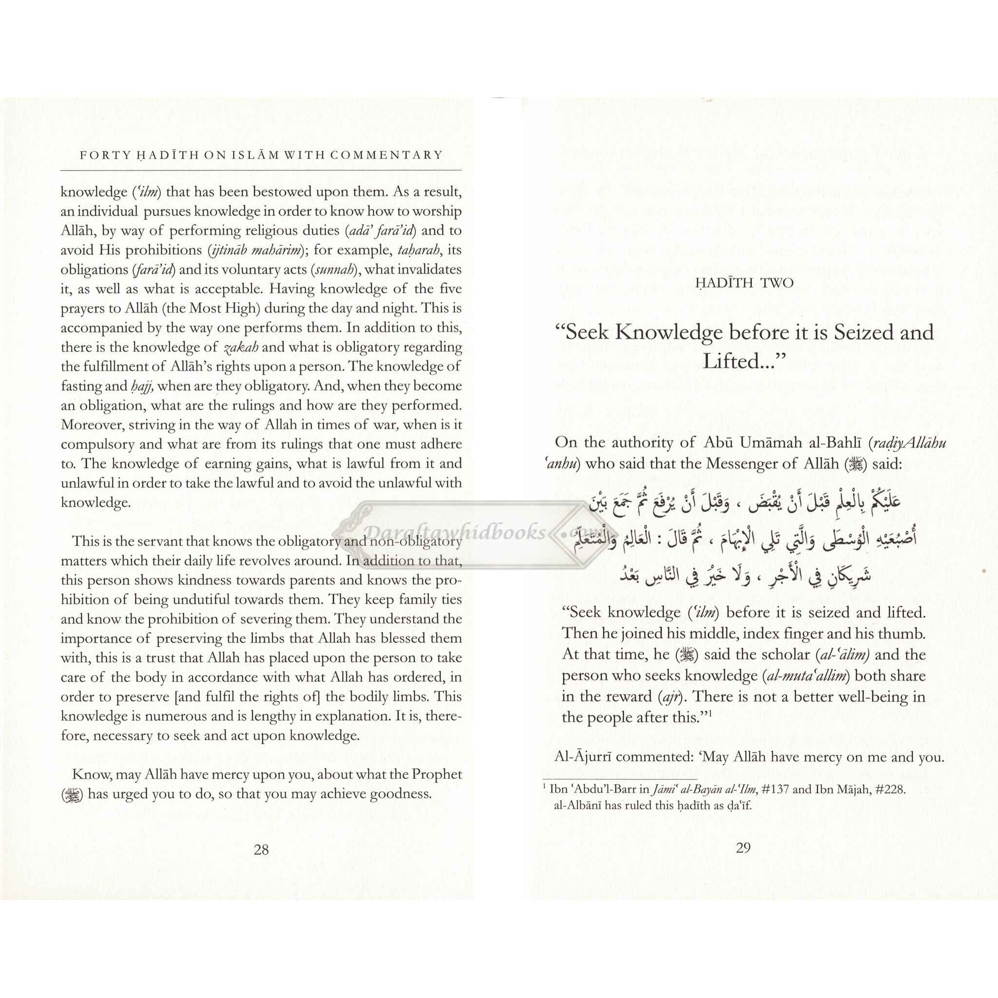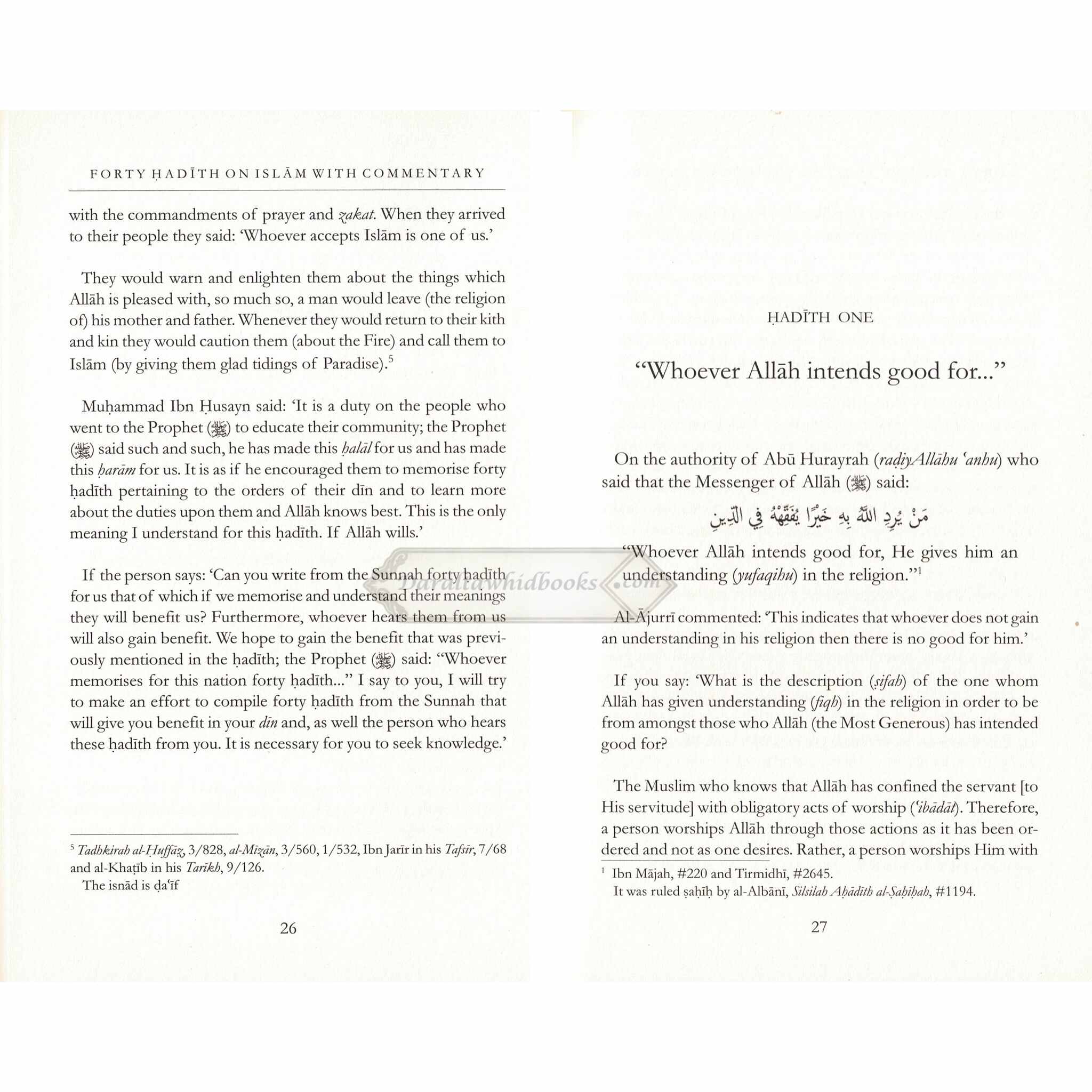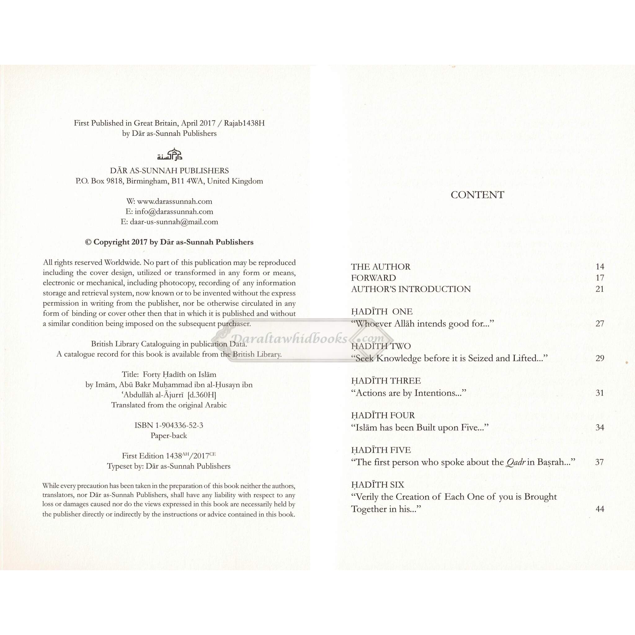 A number of scholars throughout Muslim history have penned their respective compilation of Forty Hadith books. Imam al-Ajurri's kitab ularba` in Hadithan is among the earliest. Forty Hadith On Islam is a highly regarded text for Muslims to study and memorise, for it addresses fundamental aspects of religion, with particular focus on Creed, Pillars of Islam, the Halal and Haram as well as Piety and righteousness. Imam al-Ajurri originally compiled this work for the benefit of new Muslims, thus including within it, foundational essentials of the noble Islamic faith. Forty Hadith On Islam author may Allah have mercy upon him, has commented on each hadith, presenting the subject matter in a simplified way designed to assist readers in memorising the Prophetic narrations, and implementing what they learn in an easy manner.
