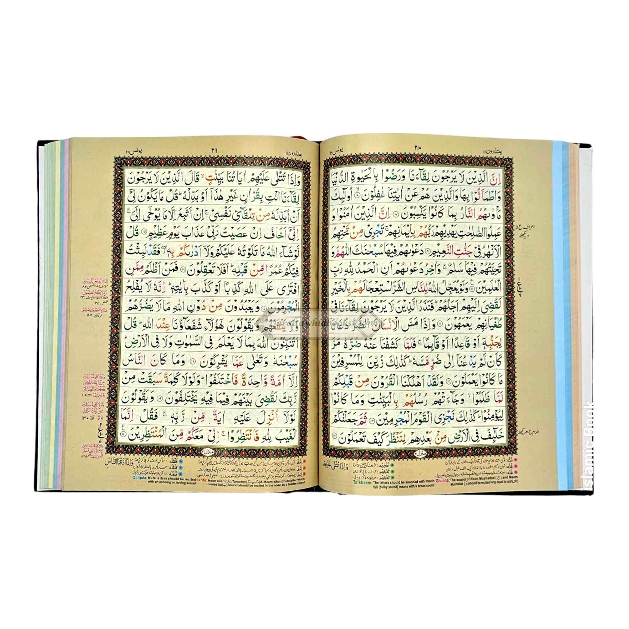 One of the Quran's distinguishing aspects is the use of color-coded Tajweed regulations. Each Tajweed rule is highlighted with a different color, making it easier for readers to detect and incorporate accurate pronunciation, elongation, and other important Tajweed elements.