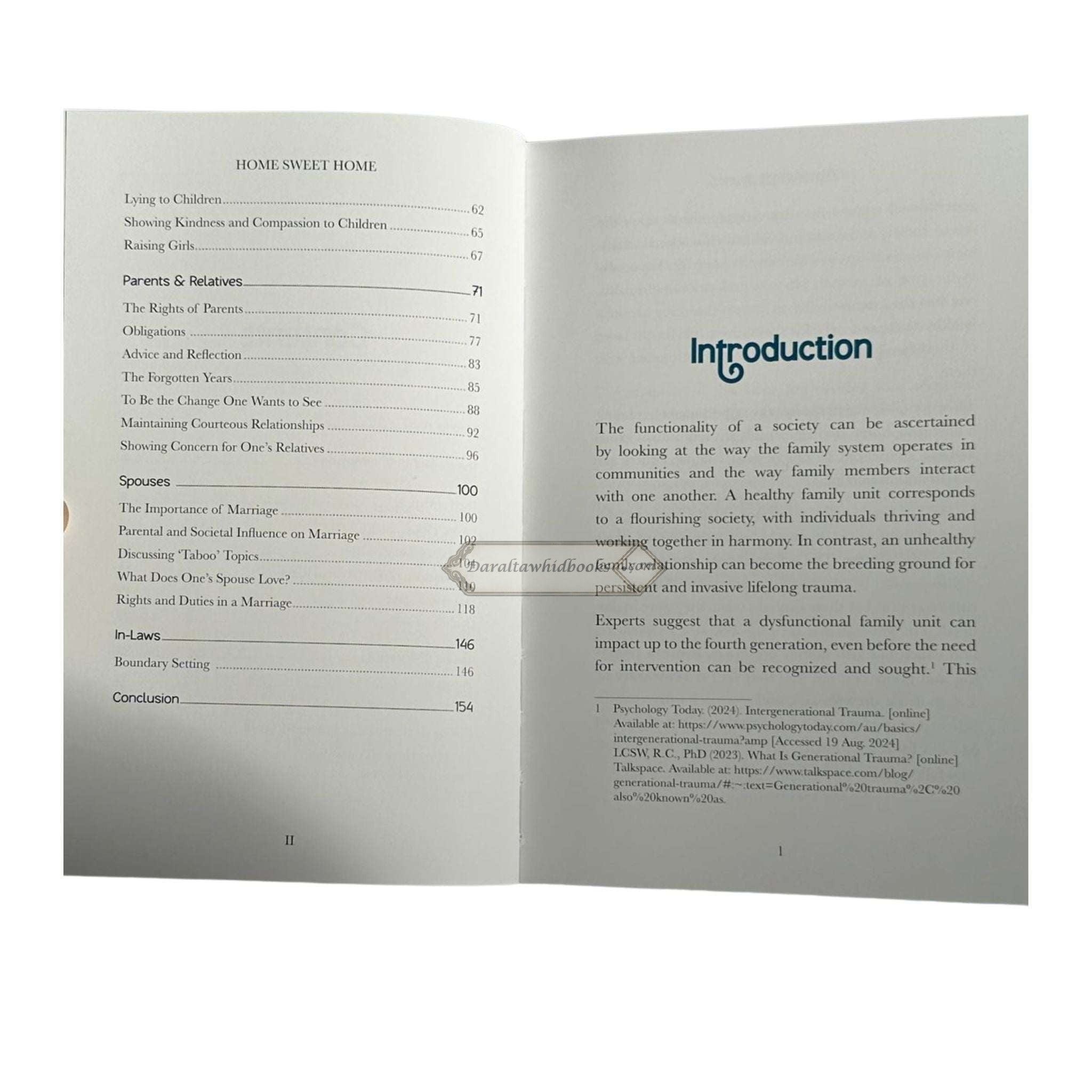 At its core, Home Sweet Home is about relationships: the power it has over one's sense of peace and self and how knowing one's rights and duties can empower one to confidently set boundaries. Most importantly, it discusses issues and conflicts that may exist within the home and how to ensure they are not mismanaged and handled disproportionately. It emphasizes the need to reflect and ponder over the origins of conflict and aims to make its readers more cognizant of the Islamic principles related to every relationship and interaction. In particular, there is a focus on the positive impact faith can have on smoothing out many common problems. This is underpinned by psychological concepts, the Qur'an and Hadith literature. By taking into account the various issues faced by many and the different types of relationships, a holistic understanding can be crucially obtained. Through the insights provided by this book, there is hope that it leads to better and more confident decisions being taken in the home so that family members can thrive together and support each other.