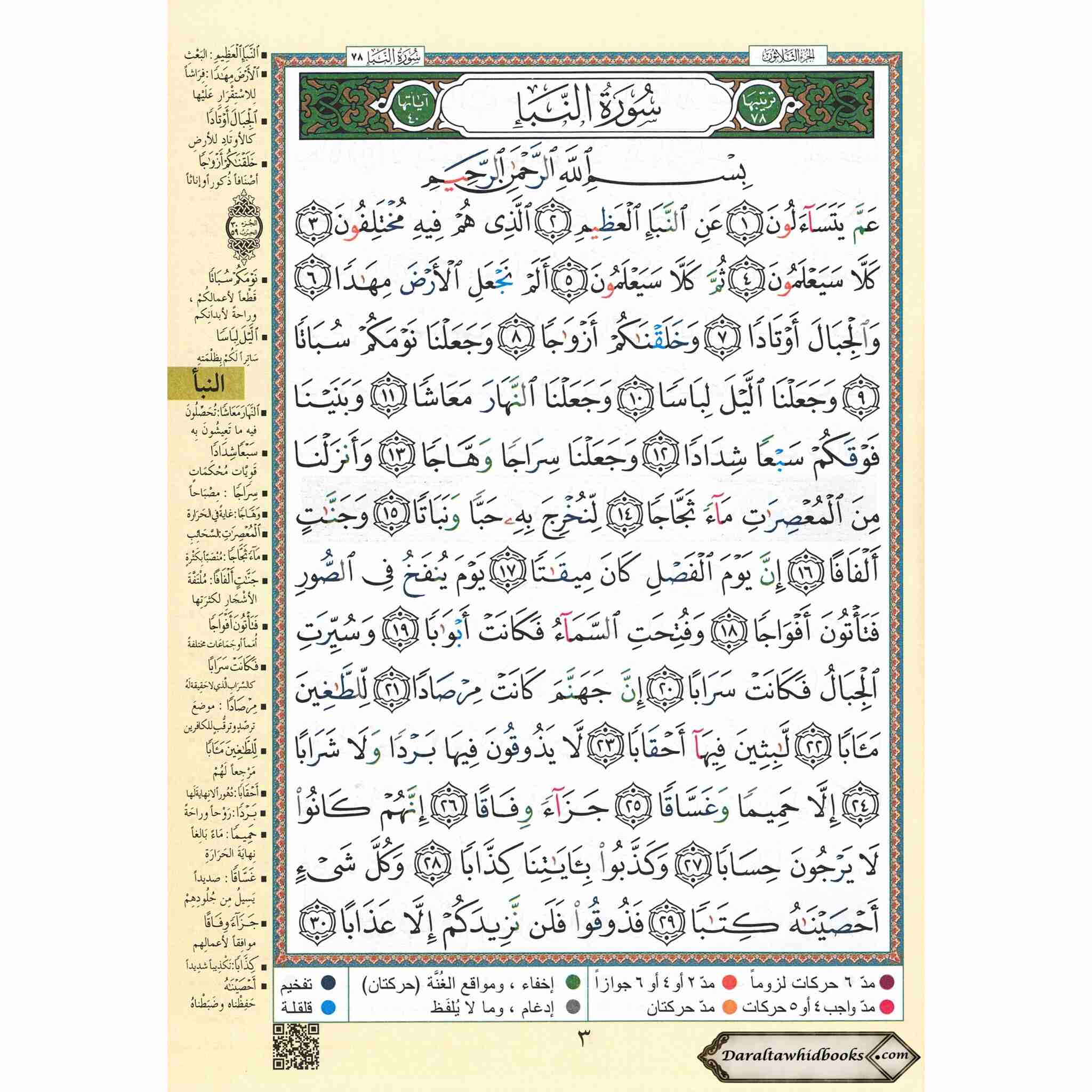 This edition includes the Quran's 30th and final part, known as Juz Amma. Surah Al-Naba, Surah Al-Naziat, and many other chapters are included and are regularly recited in daily prayers and other Islamic rites.