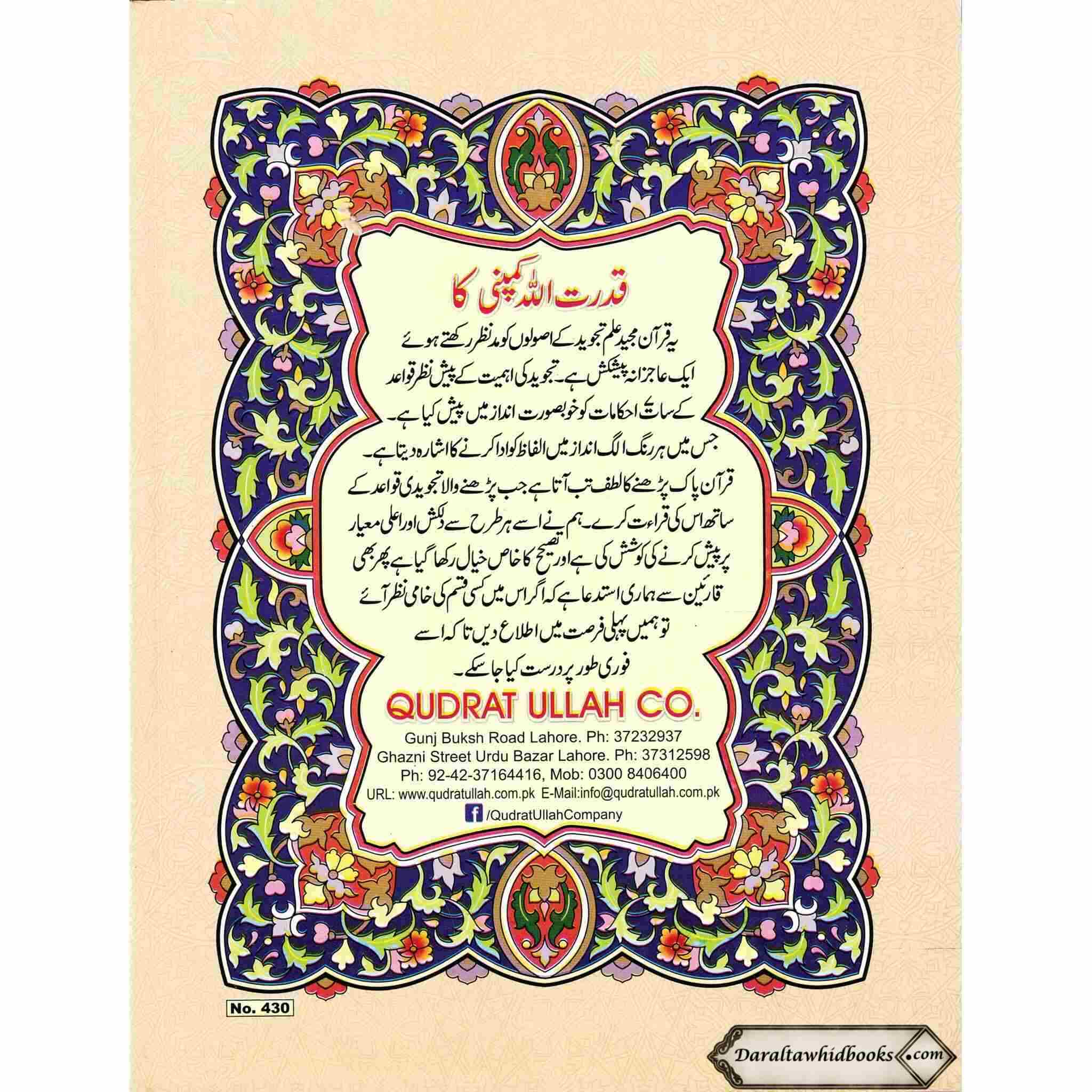 A wonderful Quranic publication called "Juzz Amma with Colour Coded Tajweed Rules: Persian, Pakistani, Indian Script, Ref 430" combines the elegance of Quranic recitation with the simplicity of Tajweed regulations, making it a priceless tool for Quran students and reciters.