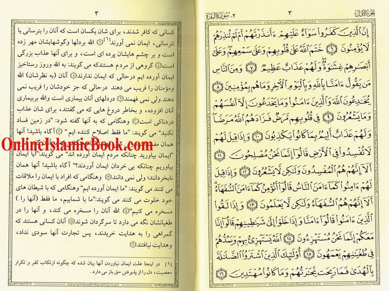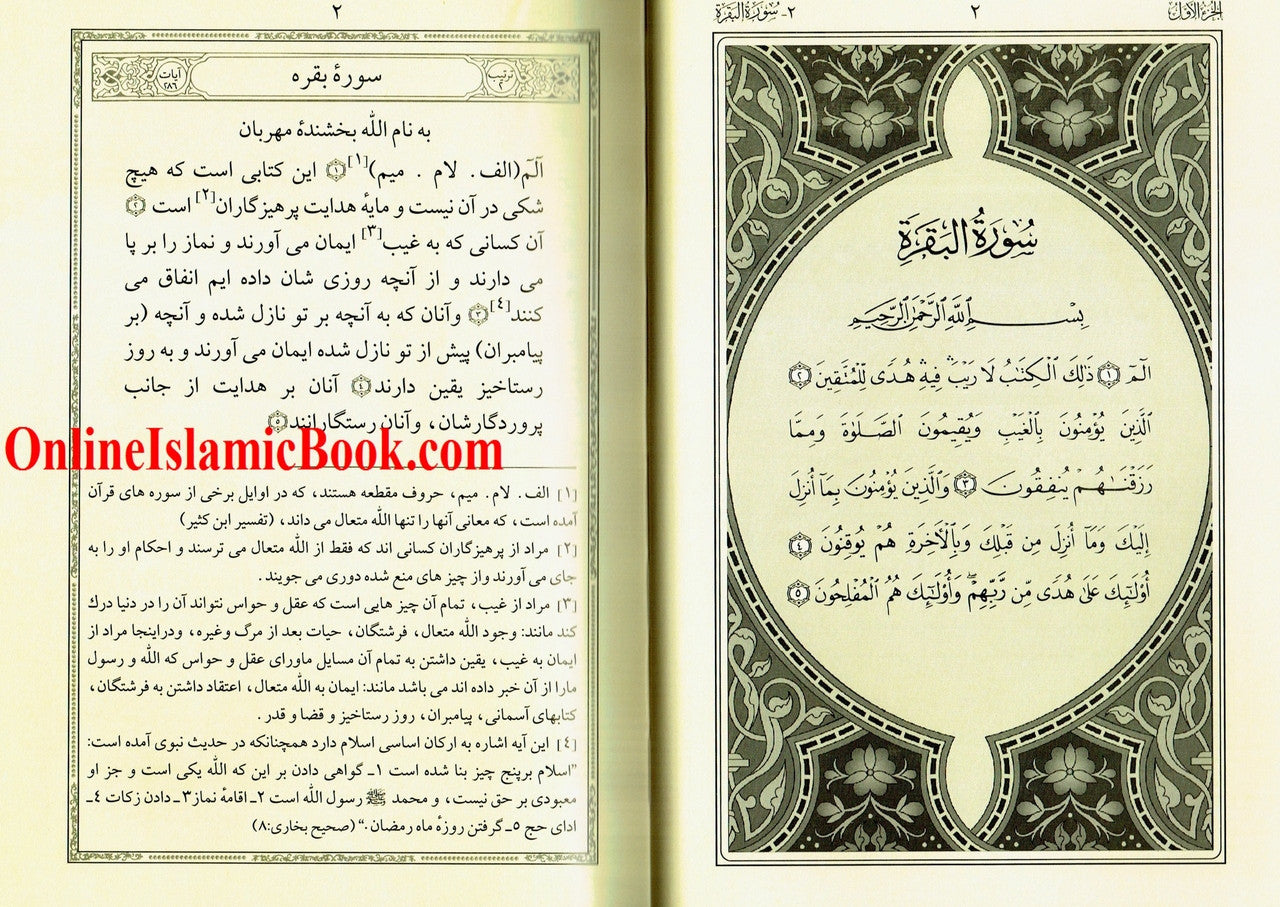 The Quranic stanzas are given in Arabic content close by an unmistakable and articulate Persian interpretation, making the book open to Persian-talking perusers.