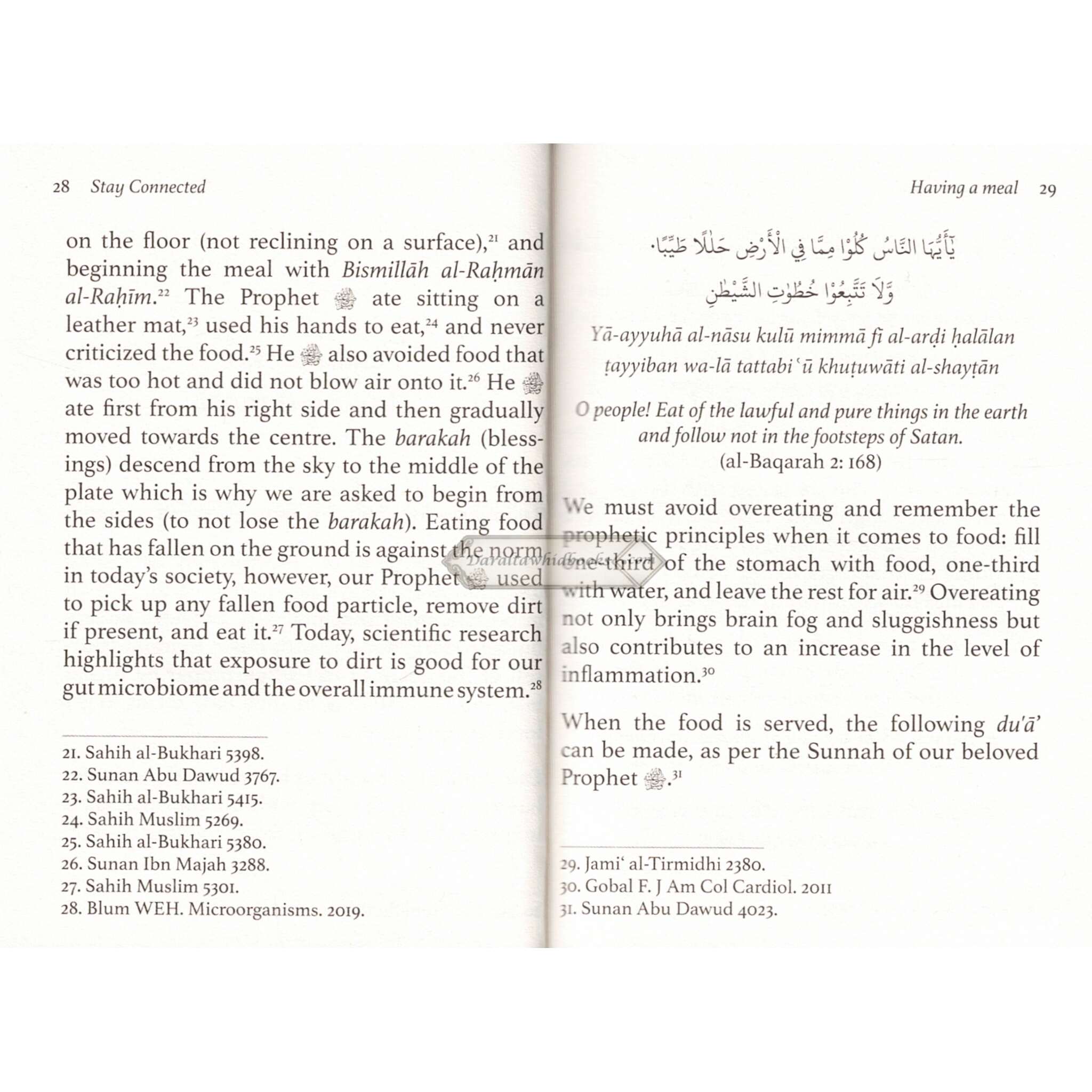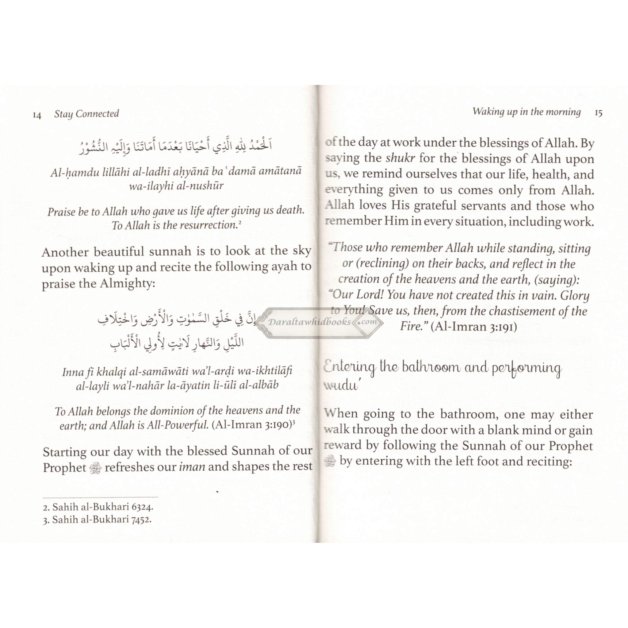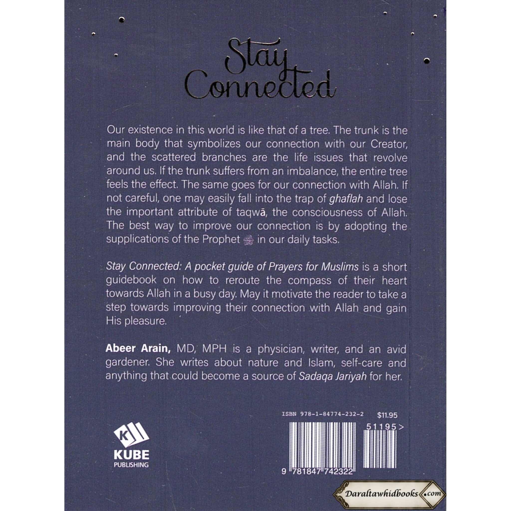 Our existence in this world is like that of a tree. The trunk is the main body that symbolizes our connection with our Creator, and the scattered branches are the life issues that revolve around us. If the trunk suffers from an imbalance, the entire tree feels the effect. The same goes for our connection with Allah. If not careful, one may easily fall into the trap of ghaflah and lose the important attribute of taqwa, the consciousness of Allah. The best way to improve our connection is by adopting the supplications of the Prophet in our daily tasks. Stay Connected: A pocket guide of Prayers for Muslims is a short guidebook on how to reroute the compass of their heart towards Allah in a busy day. May it motivate the reader to take a step towards improving their connection with Allah and gain His pleasure