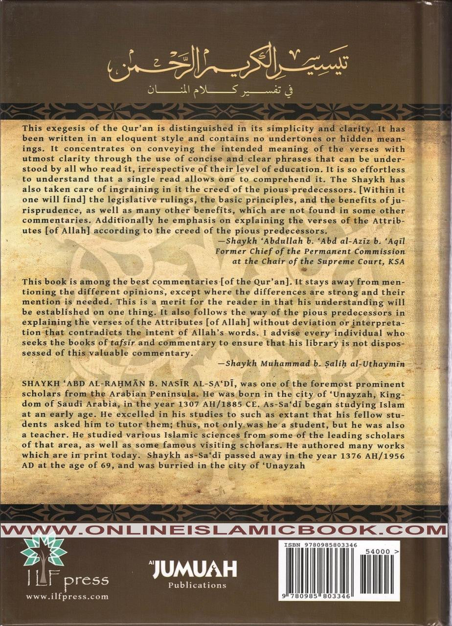 This is one of the greatest interpretations of the Quran available. It's unique in that it rarely mentions opposing viewpoints, unless there are significant disparities and it's vital to do so. This is beneficial to readers because it allows them to better grasp the Quran by keeping to one interpretation. When describing the passages of the Quran that discuss Allah's characteristics, the book also follows the path of the knowledgeable individuals who lived before us. It does not alter or interpret these scriptures in a way that contradicts what Allah intended.