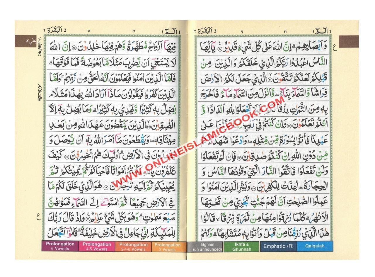 The "Tajweed Quran Colour Coded (Pakistani-Indian-Persian script)" is a unique Quran. It is designed to help individuals learn Tajweed, which is the correct way to read the Quran with proper pronunciation and sounds. This version is written in a writing form known as Persian script, which is popular in Pakistan, India, and Iran. This complete Colour Coded Tajweed Quran comes with a nice and beautiful hardcover. This Tajweed Quran is in the Oriental Indian Calligraphy. The size of this Tajweed Quran makes it easy to handle or to keep in a small pocket. This Tajweed Quran is in Hafs narration. All our Tajweed Quran products - including this Quran-- come with the following: