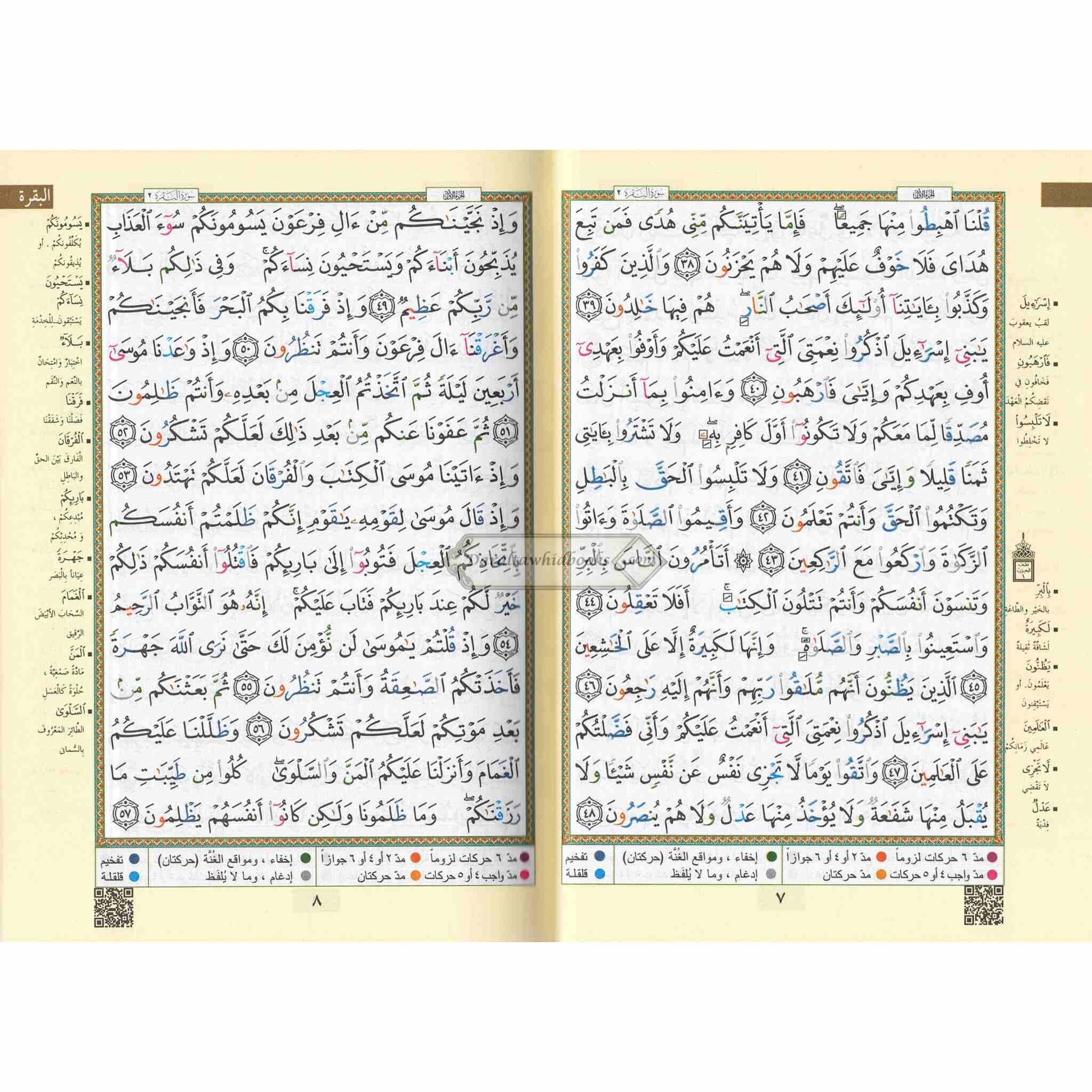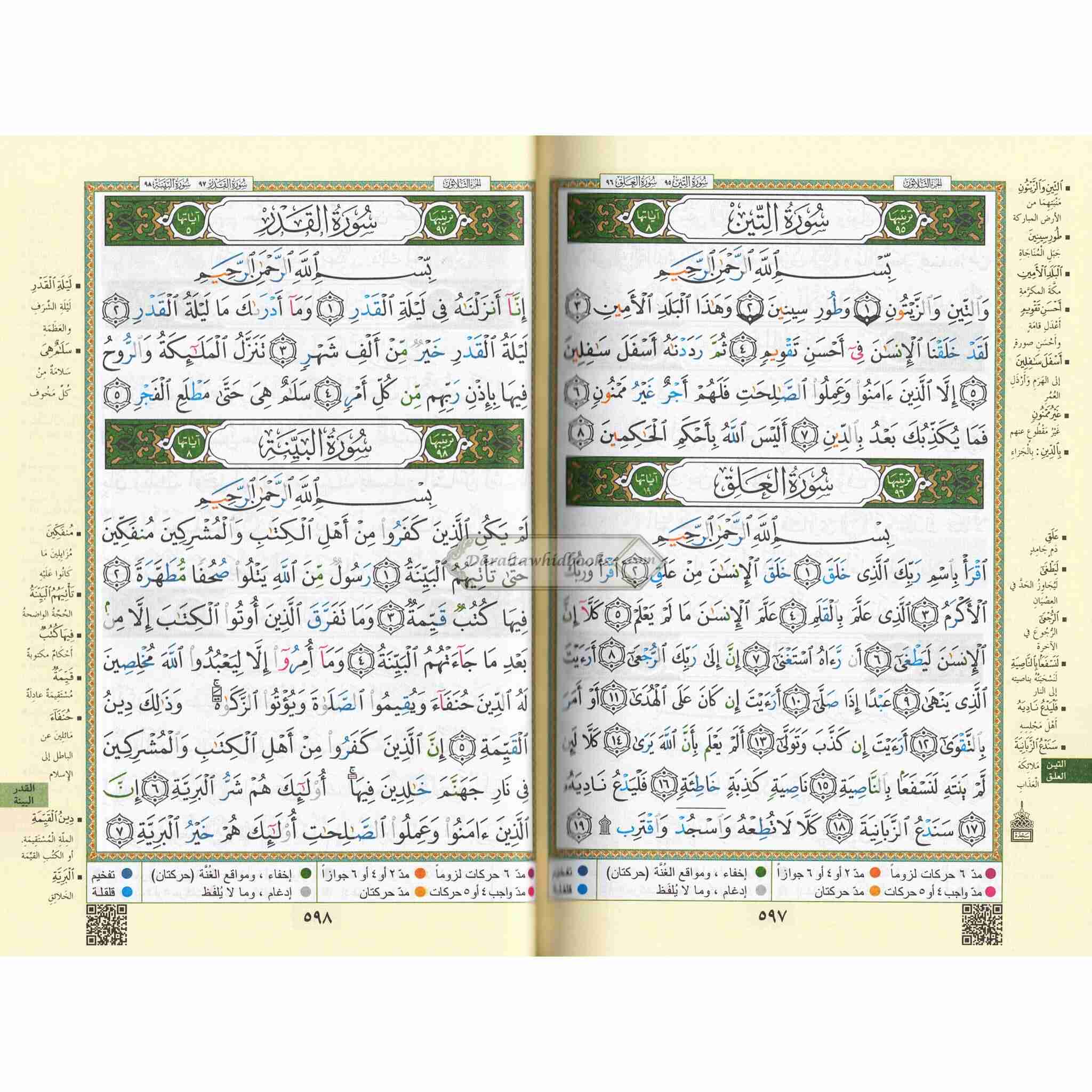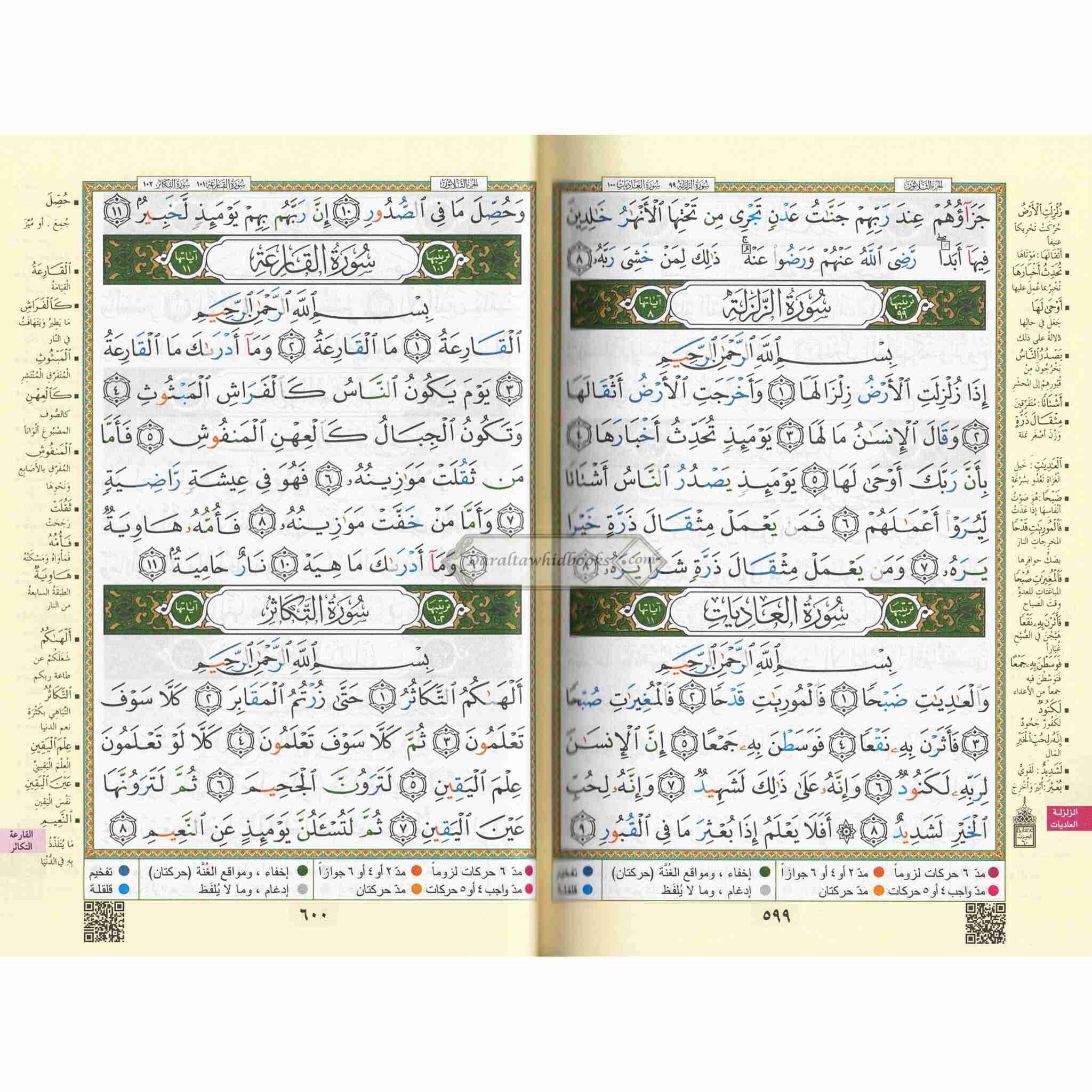 The Arabic word "tajweed" refers to the set of rules and guidelines for the correct recitation and the pronunciation of the Qur'an. It needs knowledge of proper letter articulation, elongation rules, and other phonetic principles. Usually, a Tajweed Qur'an has signifies and symbols to help readers correctly recite the