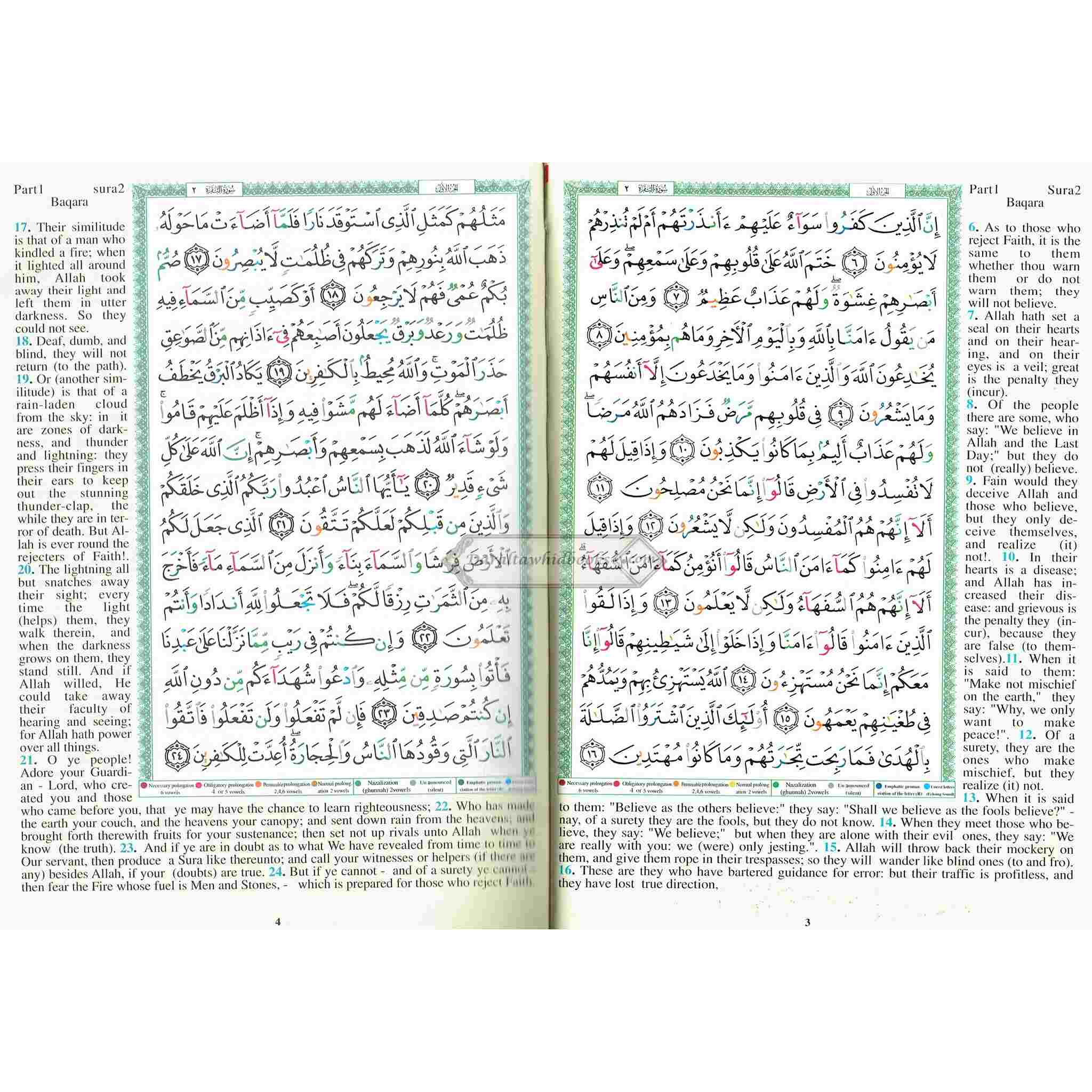 As the chapters go on, notice the flawless merging of Tajweed and translation. Each verse is embellished with Tajweed while being accompanied by Abdullah Yusuf Ali's excellent English translatio, resulting in a dynamic and complete reading experience that captures both the form and substance of the Quranic message.