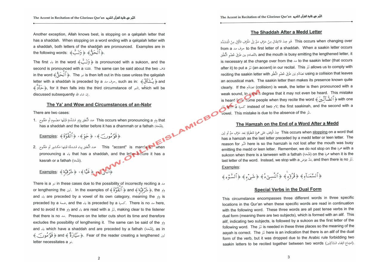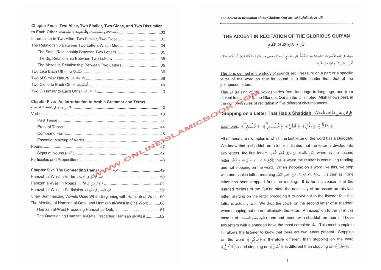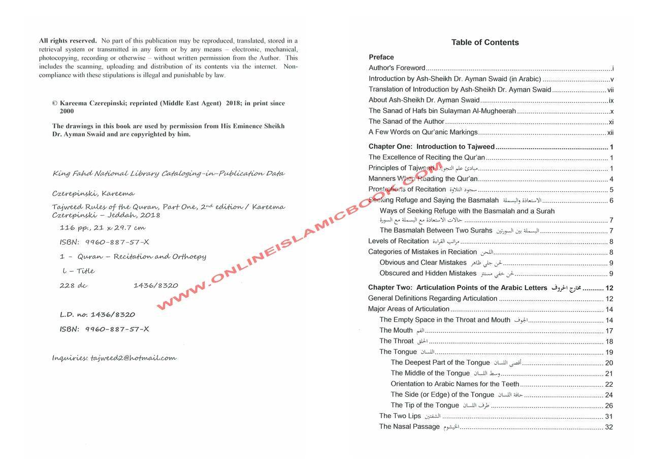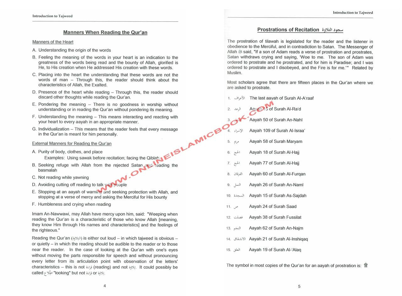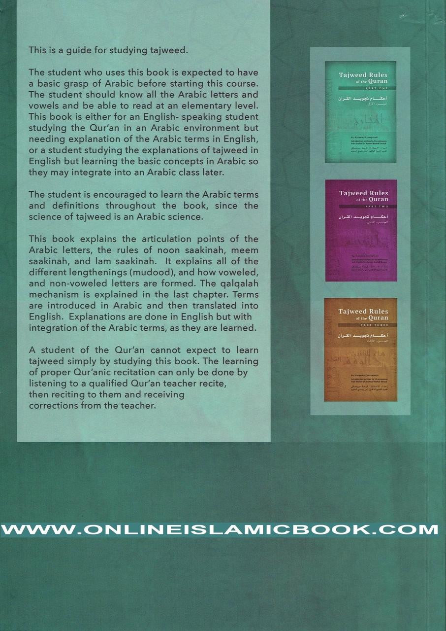 A student of the Qur'an cannot except to learn tajweed simply by studying this book. The learning of proper Qur'anic recitation can only be done by listening to a qualified Qur'an teacher recite, then reciting to them and receiving corrections from the teacher.
