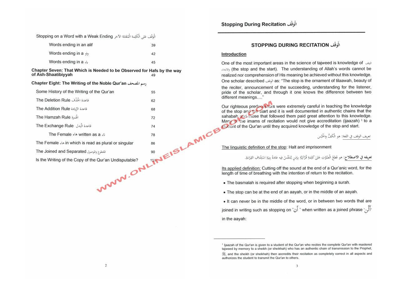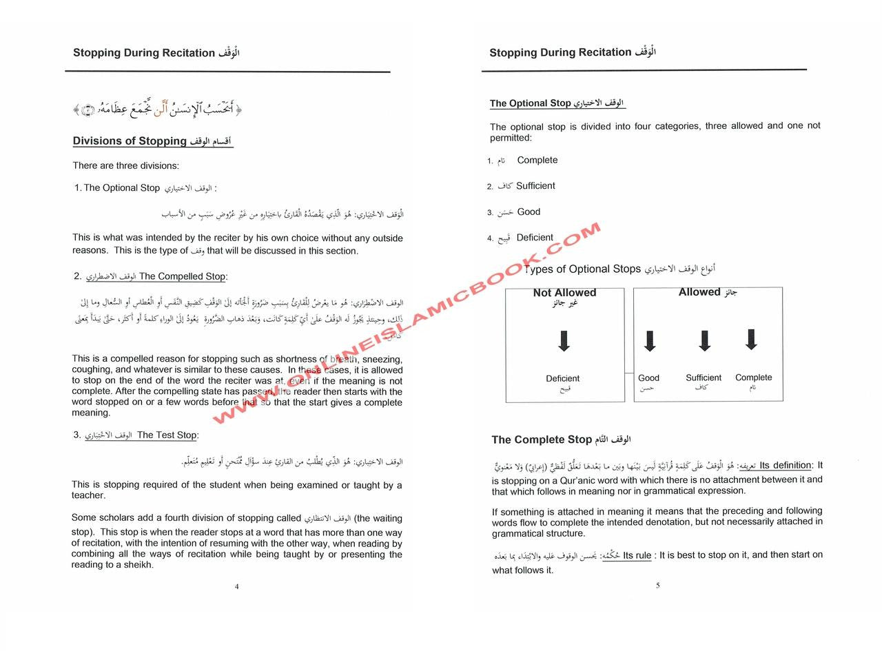 This final book explains the stop and start when reading the Glorious Qur'an, and gives details as to what kind of stop is allowed, what kind preferred, and what kind of stop is forbidden. Stopping on the ends of words with strong endings (consonants)and rules for what is allowed on the last letter of the word is described, including and Stopping on the ends of words with weak endings (words ending in the alif, ya' or wow) and different rules and explanations for these type of words is clarified. One important aspect of Qur'an recitation is knowing and understanding which word combinations are written together and which separately in different parts of the Qur'an as well as in which places of the Qur'an are some words are written with the female and in which places they are written with the This part lays out the different places in the Qu'ran these occurrences take place, so the reader knows how he/she can stop on these words. The words that are read in a special way, or have two allowed ways for the reading of Hafs from 'Aasim by the way of Ash-Shaatibiyyah are detailed in this book. The history of the writing of the Glorious Qur'an and the general rules for the writing of the Qur'an are laid out in the last chapter of this part.