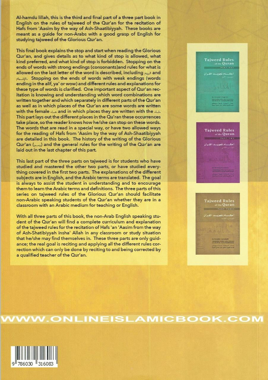 Al-hamdu lillah, this is the third and final part of a three part series in English on the rules of tajweed of the Qur'an for the recitation of Hafs from 'Aasim by the way of Ash-Shaatibiyyah. These books are meant as a guide for non-Arabs with a good grasp of English for studying tajweed of the Glorious Qur'an.