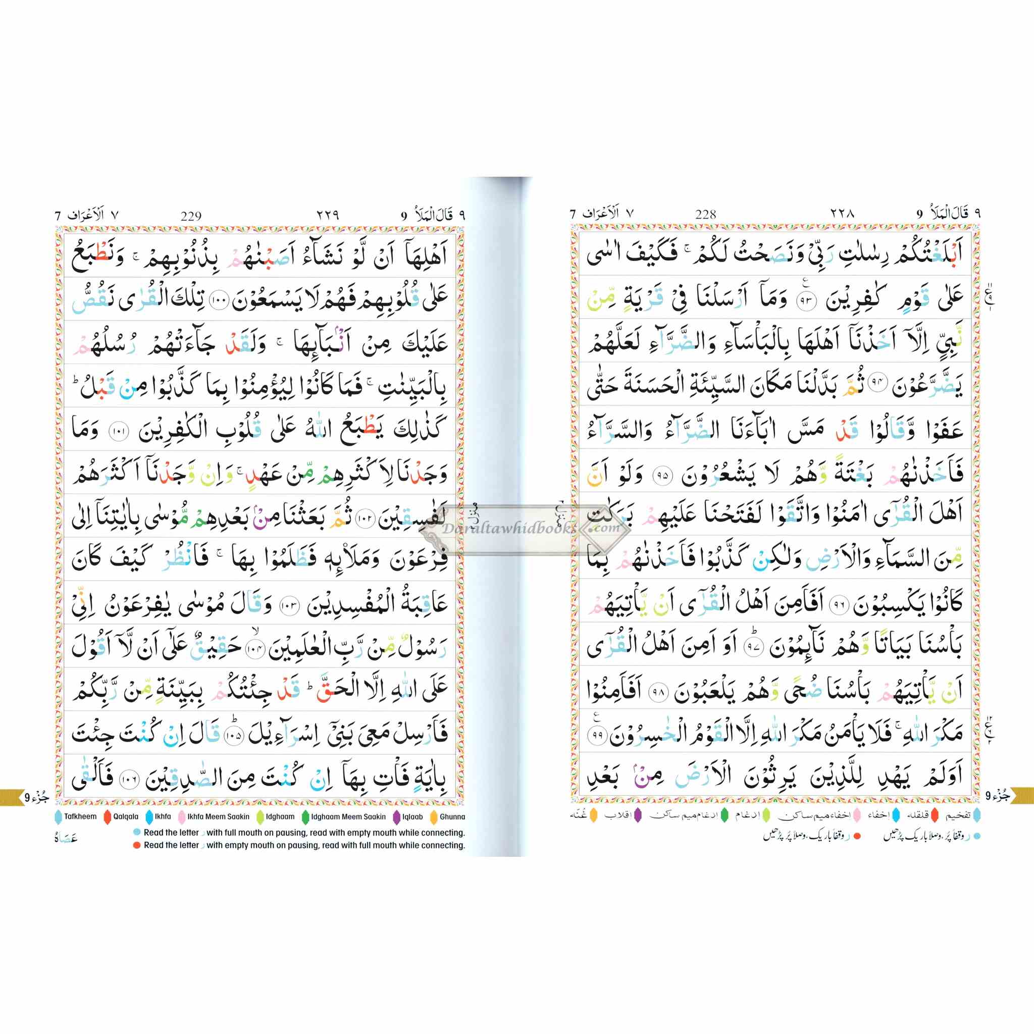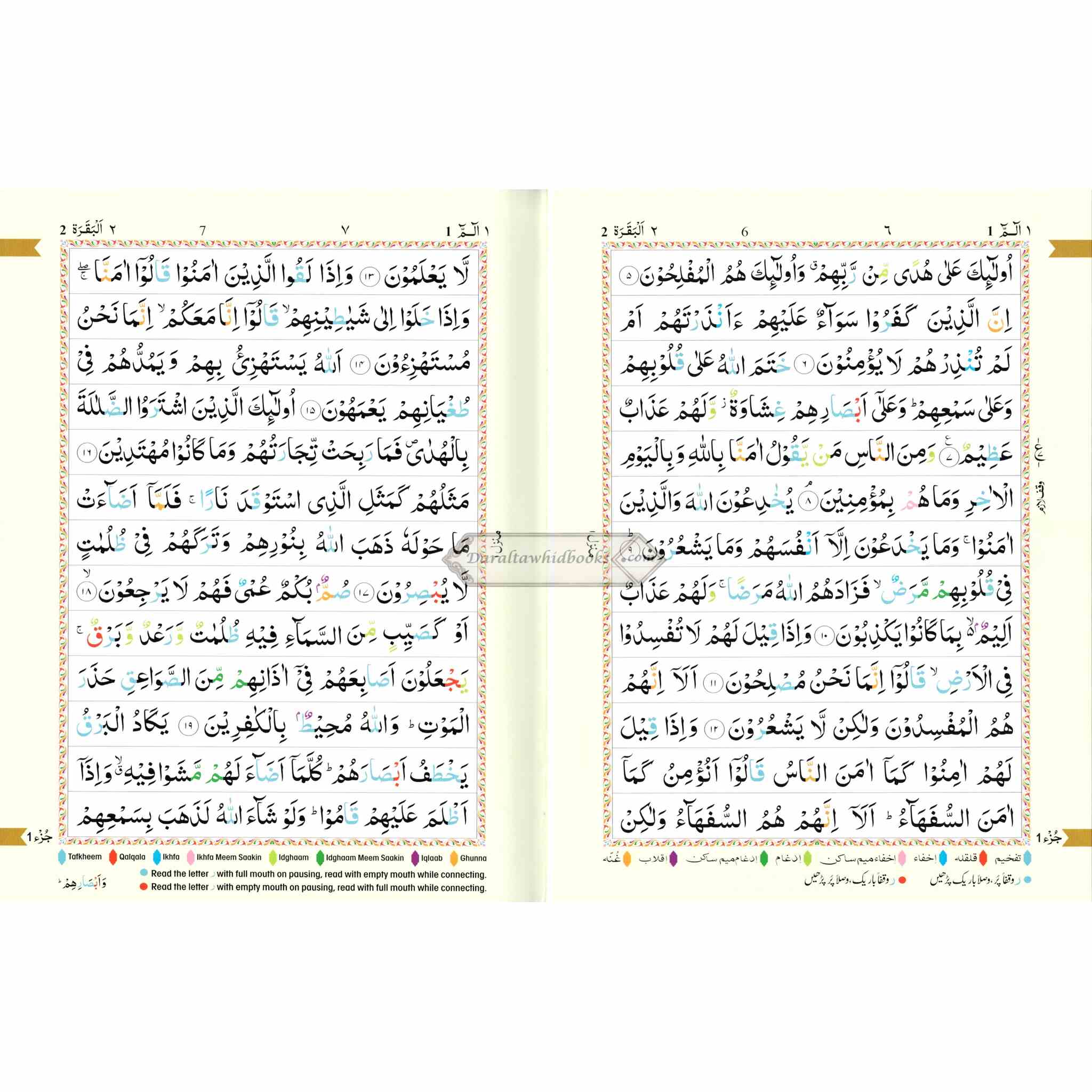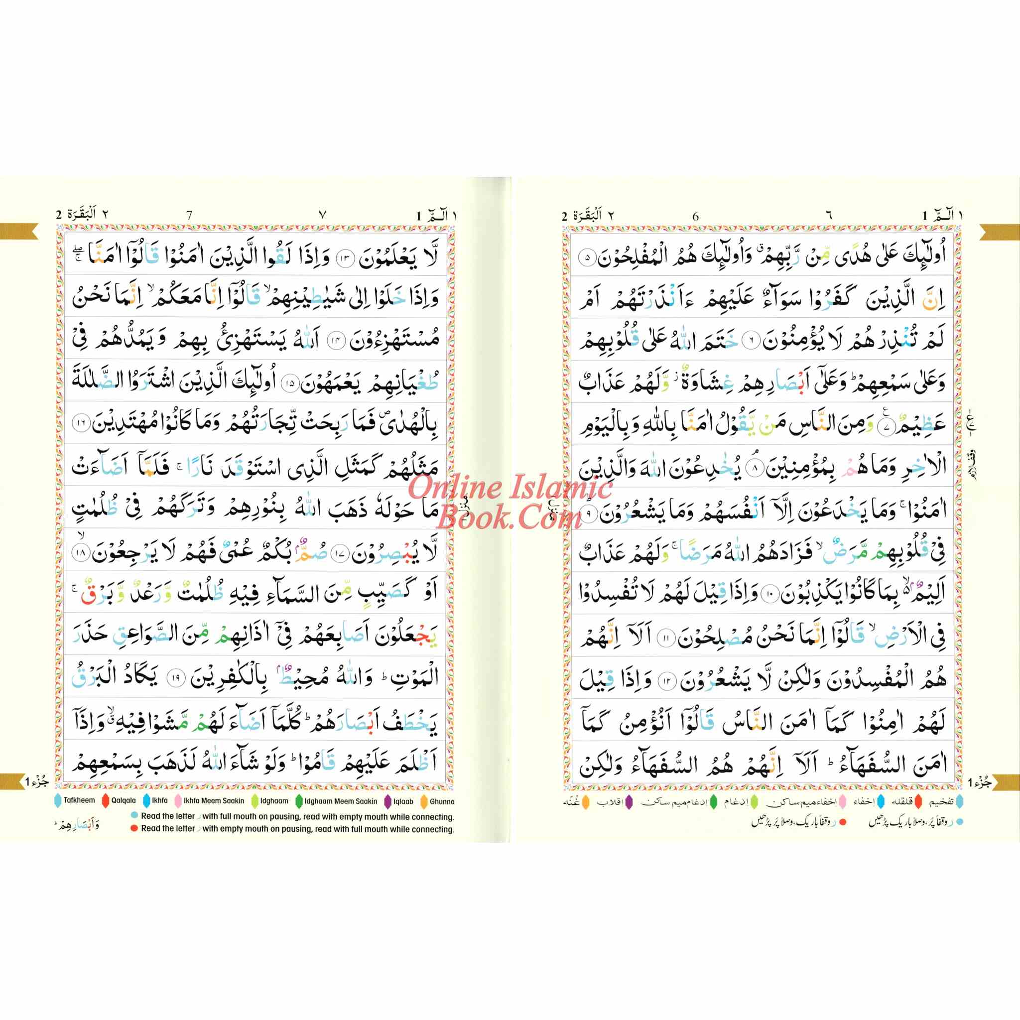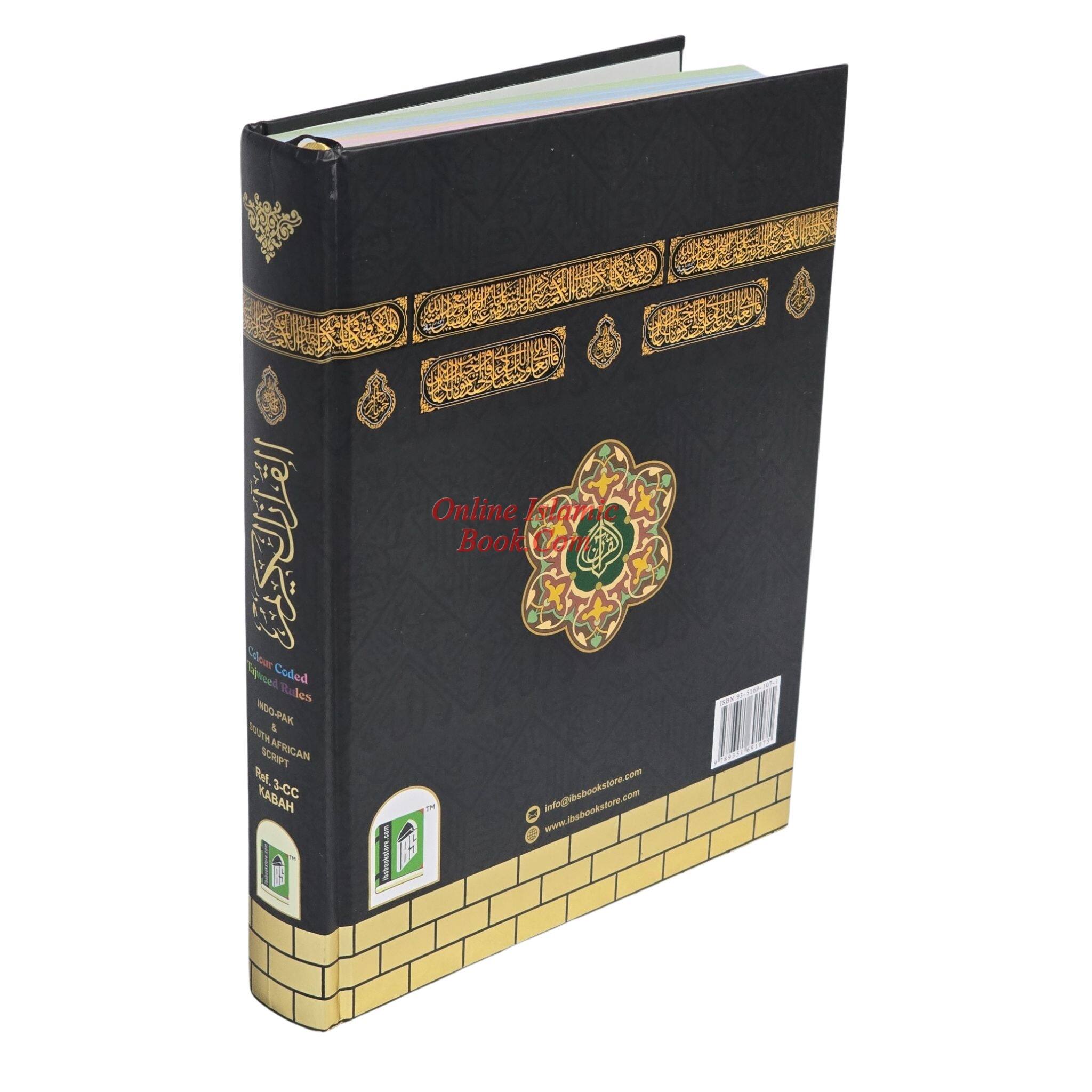 A color-coded Qur'an in an Arabic script that is easy to read for the non-Arabic speaking person as well. Seven different-color shades have been used: each color representing a different tajwid rule. Letters are colored according to the corresponding Tajweed rule. The actual rules of tajwid in English are included in the back of the Quran. This edition of the Qur'an can help those who desire to recite the Qur'an correctly with the proper pronunciations and intonations.