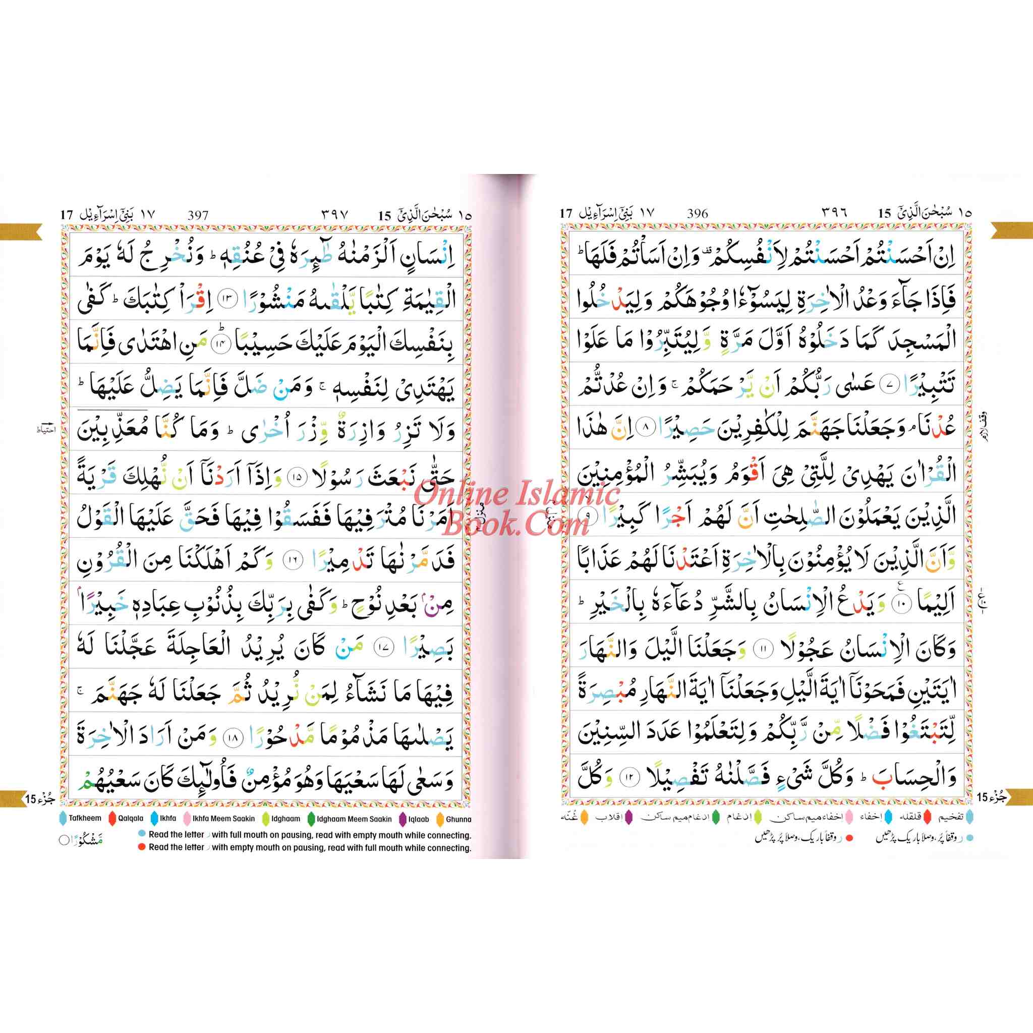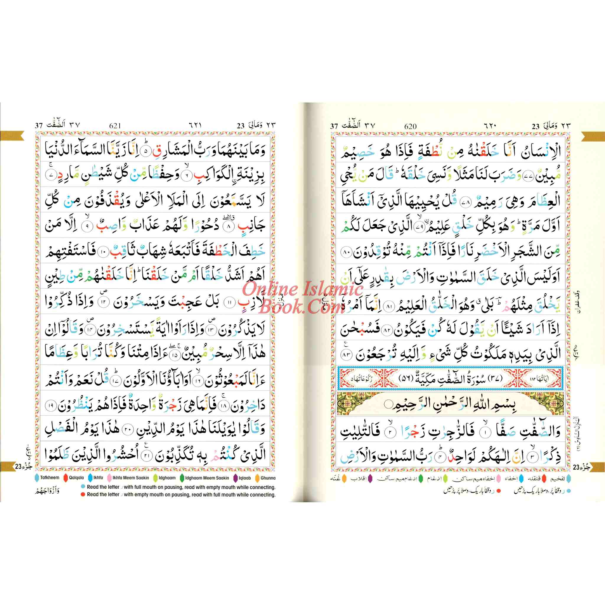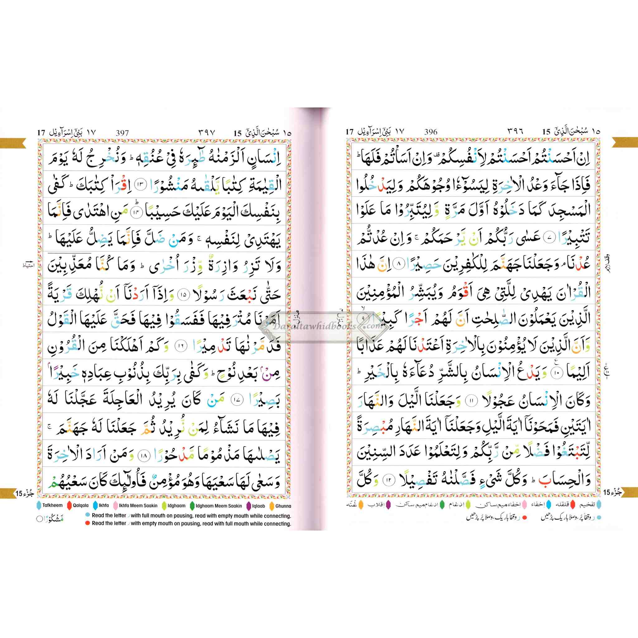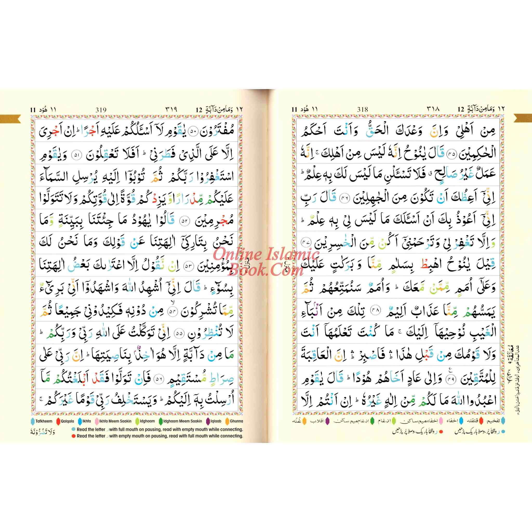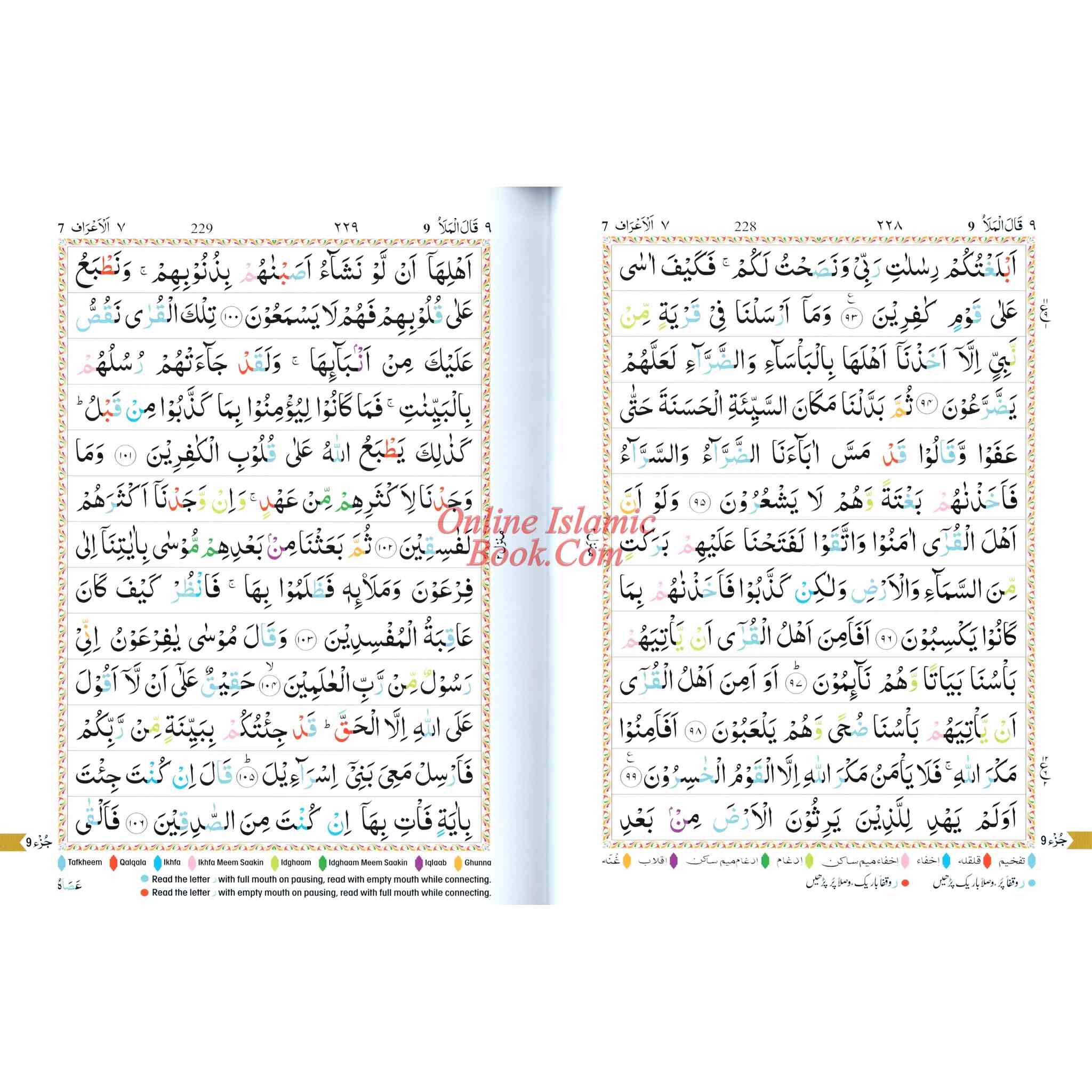 A color-coded Qur'an in an Arabic script that is easy to read for the non-Arabic speaking person as well. Seven different-color shades have been used: each color representing a different tajwid rule. Letters are colored according to the corresponding Tajweed rule. The actual rules of tajwid in English are included in the back of the Quran. This edition of the Qur'an can help those who desire to recite the Qur'an correctly with the proper pronunciations and intonations.