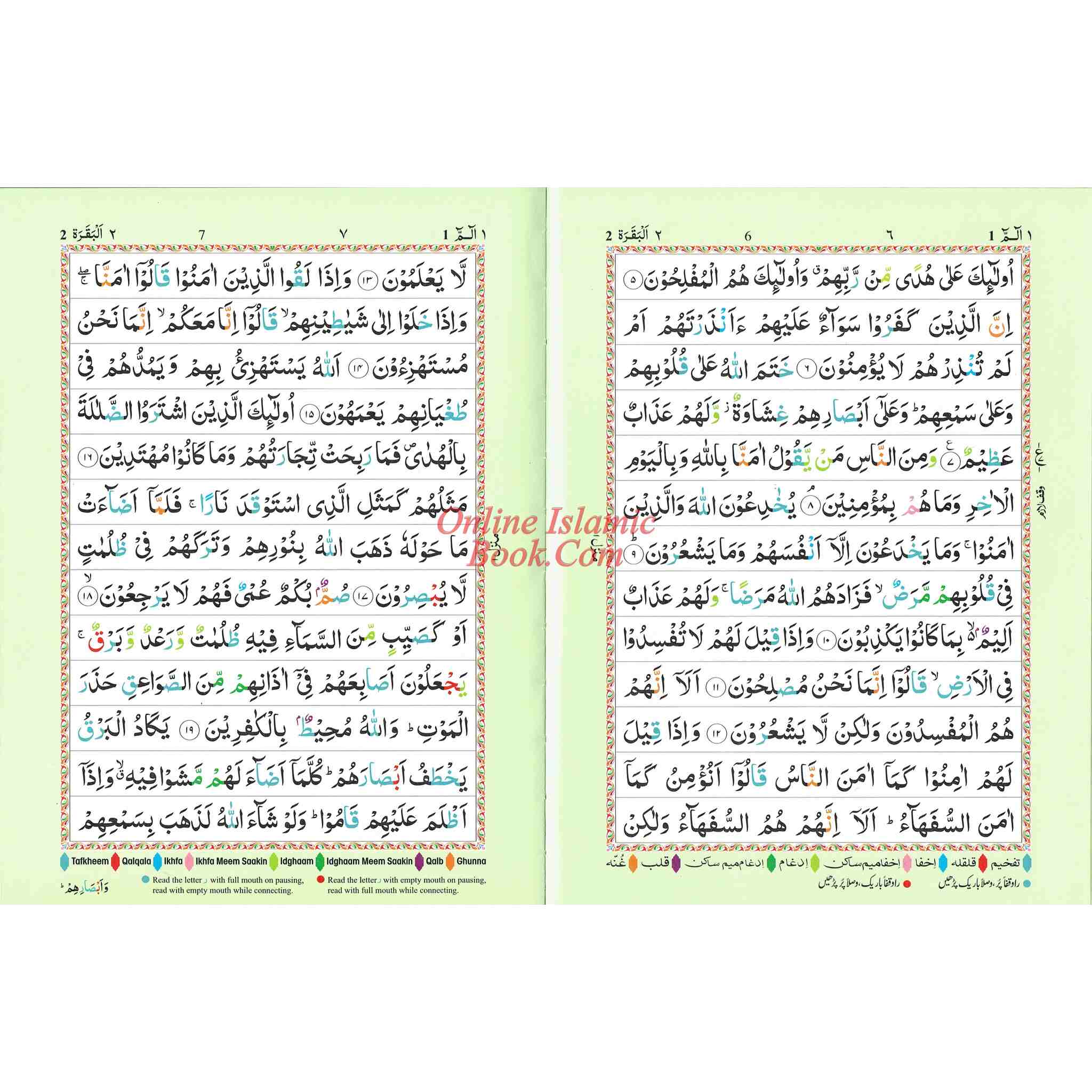 One of the Quran's most notable aspects is the use of color-coded text to highlight Tajweed laws. Tajweed is the science of appropriate Quranic recitation, and the color-coded markers assist readers in correctly pronouncing and reciting each letter and word according to Tajweed standards.