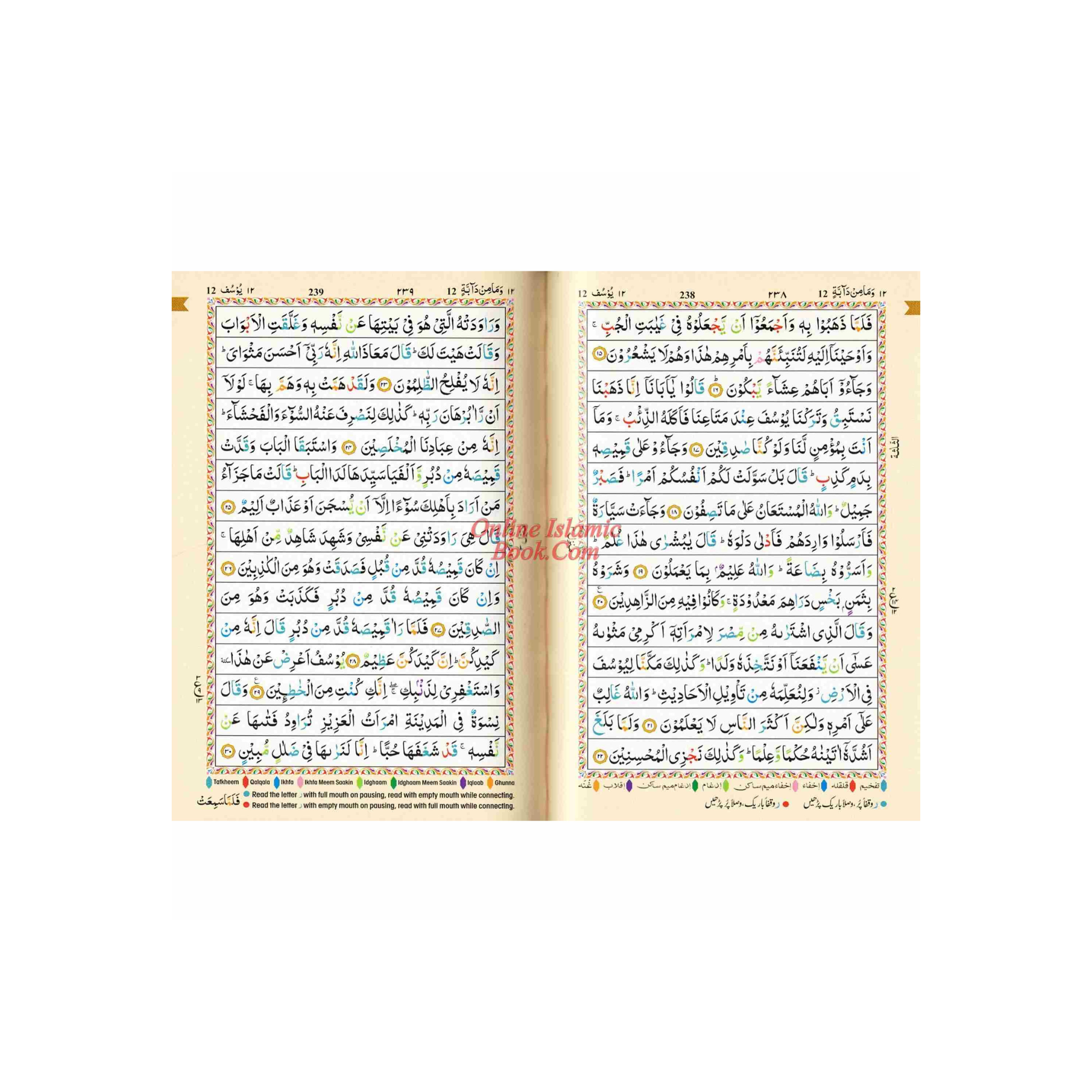 A portable version of the Holy Quran with Tajweed rules and color-coded text is called "The Holy Quran Tajweed Rules with Colour Coded (Pocket Size) (Persian/Urdu script)". With the aid of visual clues and instructions, this edition seeks to make the proper recitation of the Quran easier.