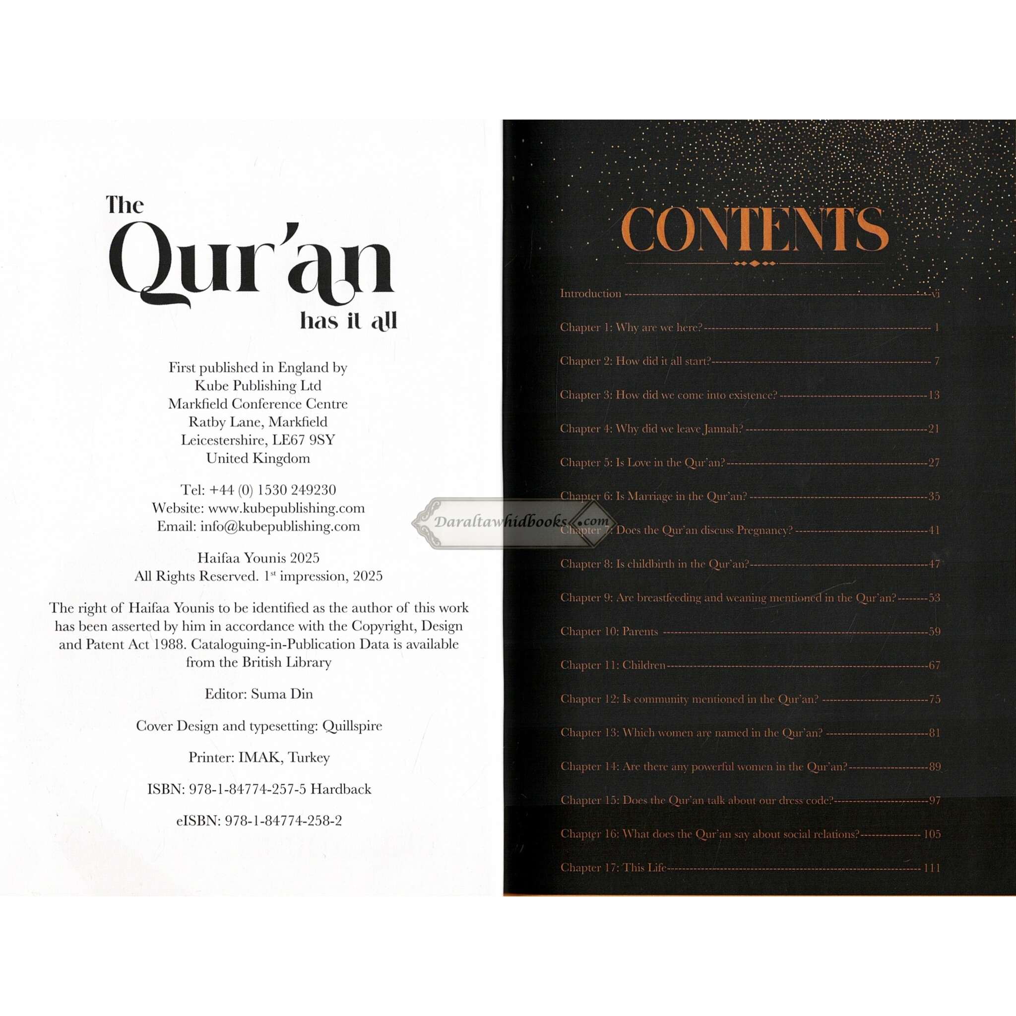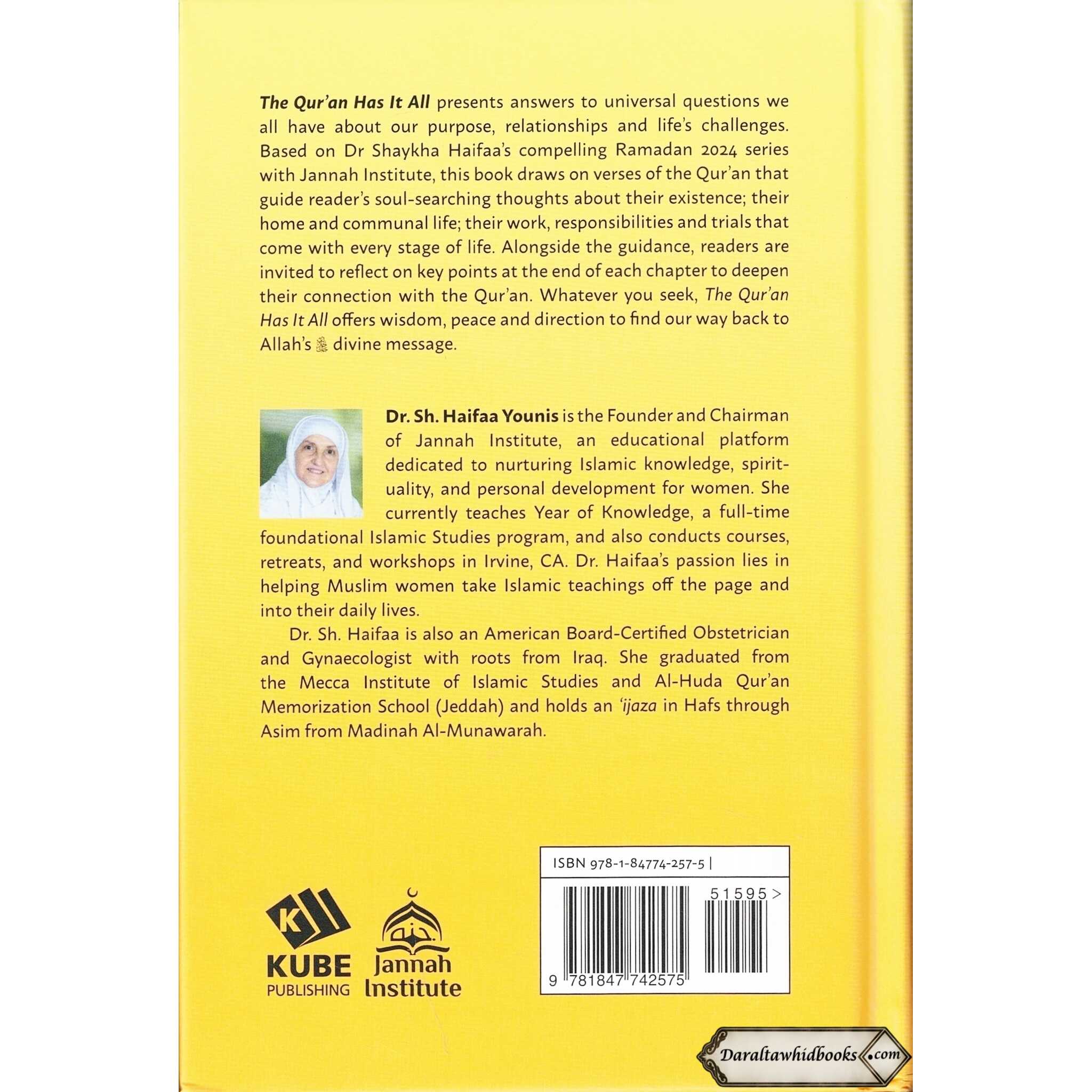 The Quran Has It All presents answers to universal questions we all have about our purpose, relationships and life's challenges. Based on Dr Shaykha Haifaa's compelling Ramadan 2024 series with Jannah Institute, this book draws on verses of the Qur'an that guide reader's soul-searching thoughts about their existence; their home and communal life; their work, responsibilities and trials that come with every stage of life. Alongside the guidance, readers are invited to reflect on key points at the end of each chapter to deepen their connection with the Qur'an. Whatever you seek, The Qur'an Has It All offers wisdom, peace and direction to find our way back to Allah's divine message. Dr. Sh. Haifaa Younis is the Founder and Chairman of Jannah Institute, an educational platform dedicated to nurturing Islamic knowledge, spirit- uality, and personal development for women. She currently teaches Year of Knowledge, a full-time foundational Islamic Studies program, and also conducts courses, retreats, and workshops in Irvine, CA. Dr. Haifaa's passion lies in helping Muslim women take Islamic teachings off the page and into their daily lives.Dr. Sh. Haifaa is also an American Board-Certified Obstetrician and Gynaecologist with roots from Iraq. She graduated from the Mecca Institute of Islamic Studies and Al-Huda Qur'an Memorization School (Jeddah) and holds an 'ijaza in Hafs through Asim from Madinah Al-Munawarah.